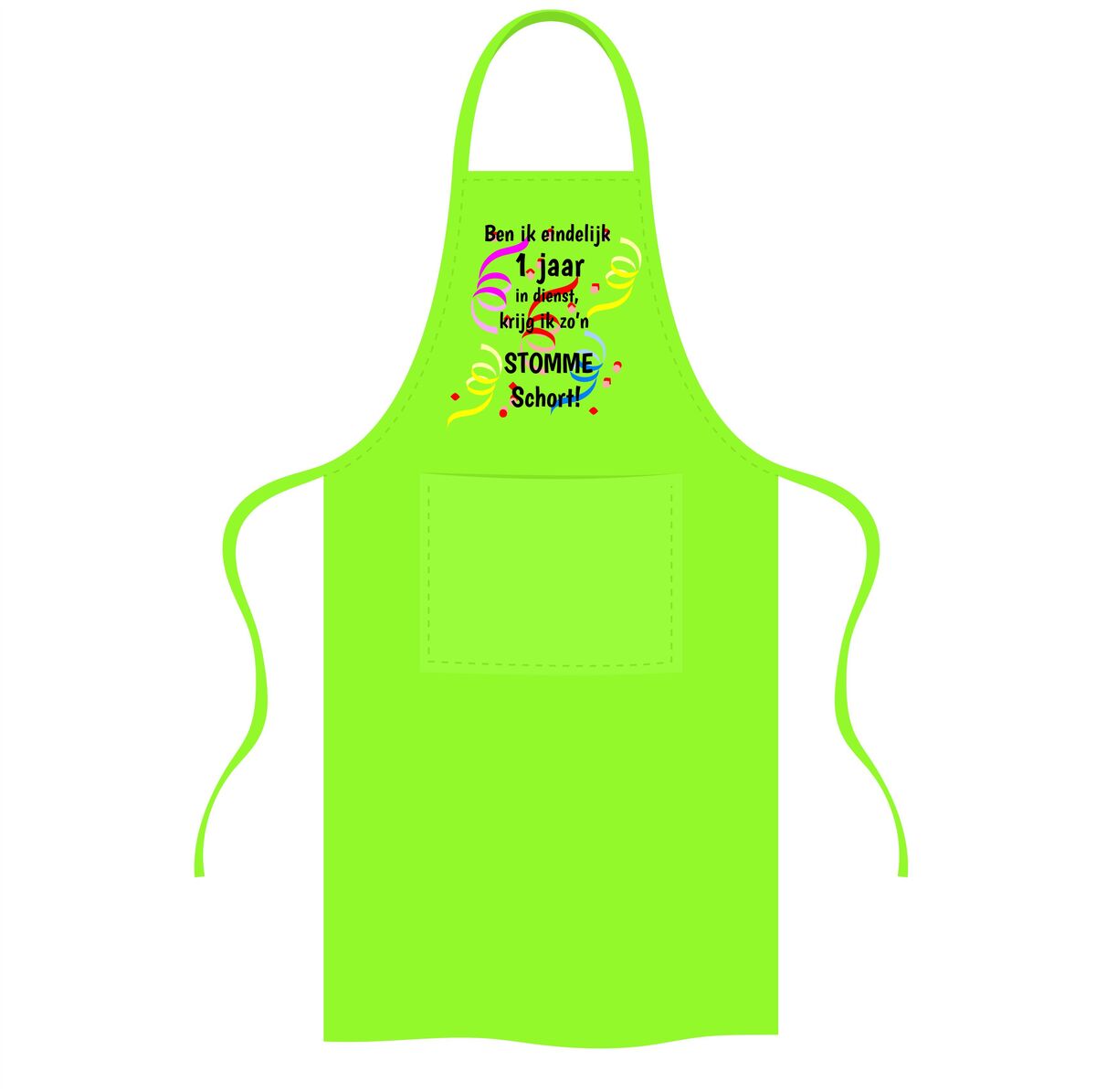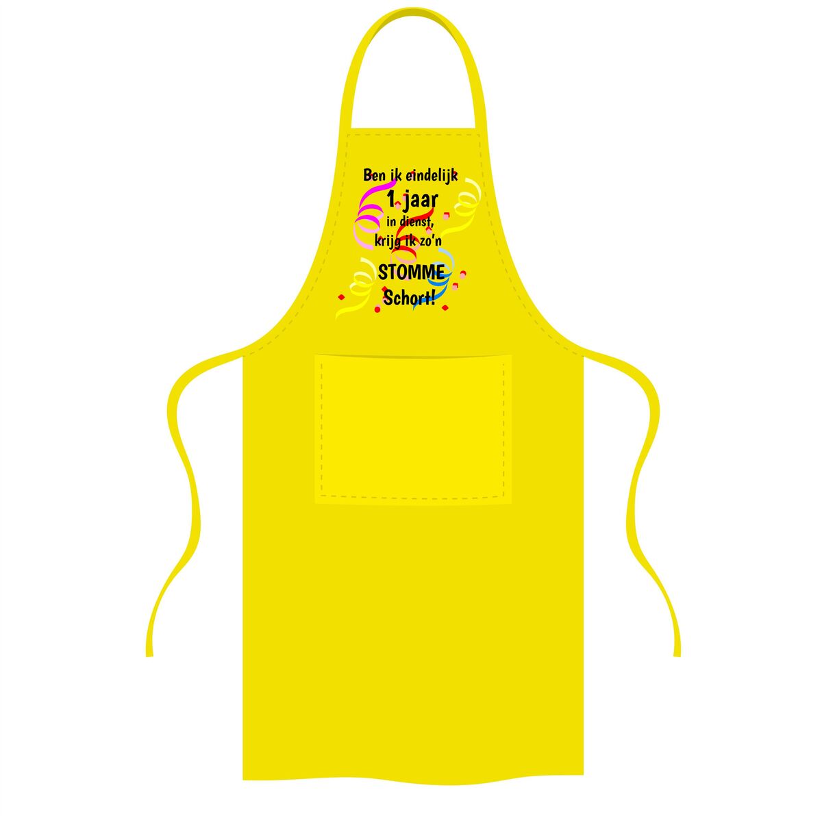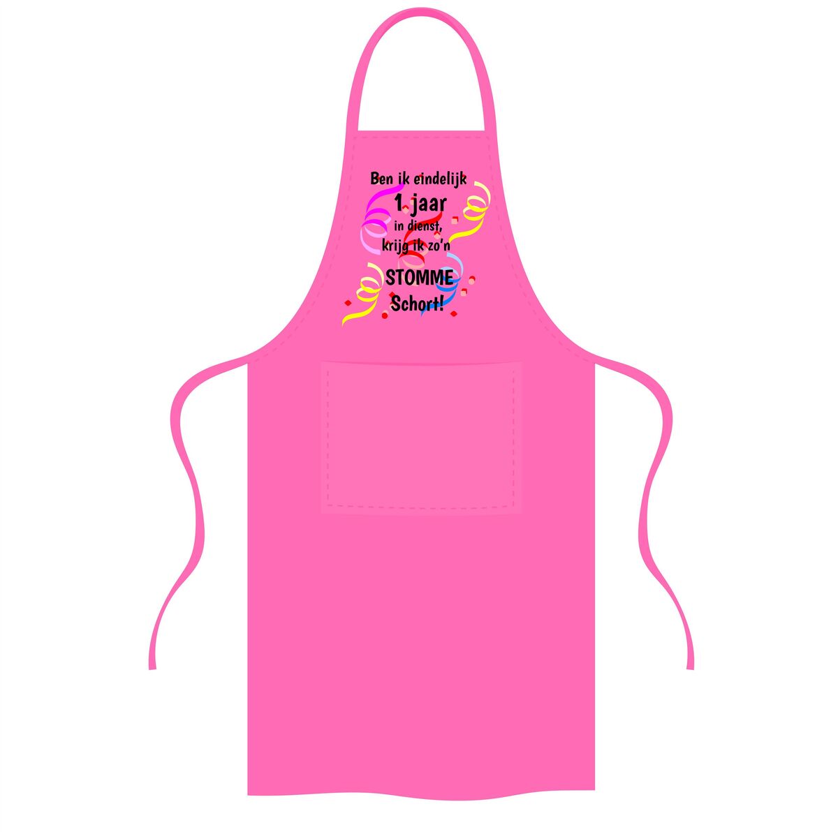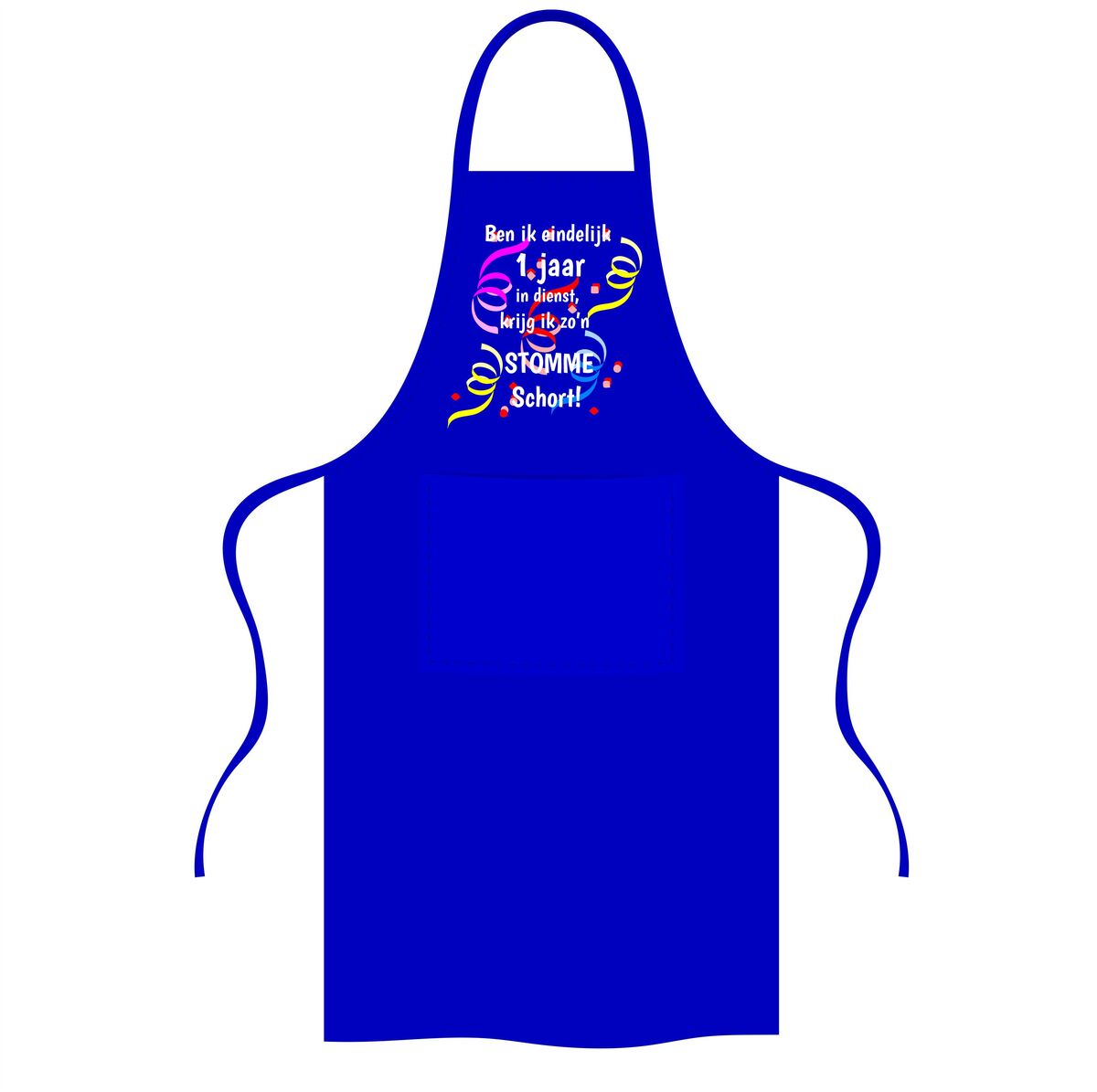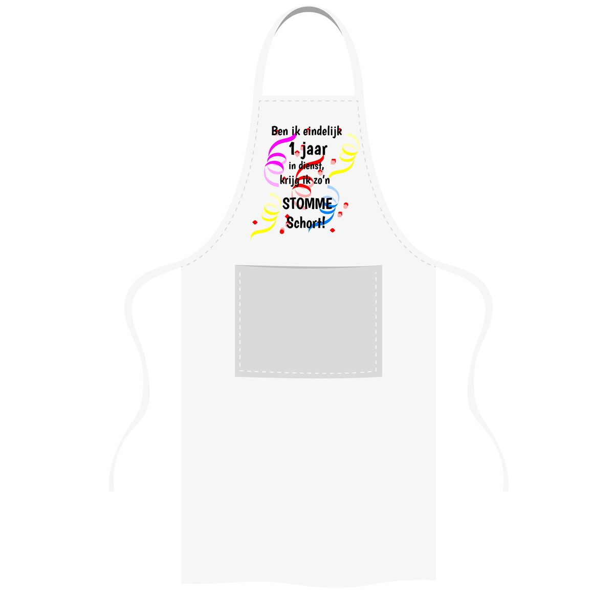 Op zoek naar het perfecte, humoristische cadeau voor een 1-jarig dienstjubileum? Deze schort is een gegarandeerde publiekslieveling! Met de hilarische tekst “Ben ik eindelijk 1 jaar in dienst, krijg ik zo’n stomme schort” zet je elke collega meteen in het middelpunt van de aandacht.