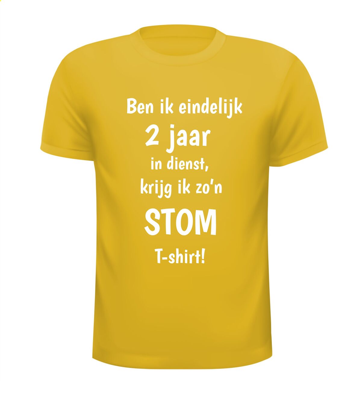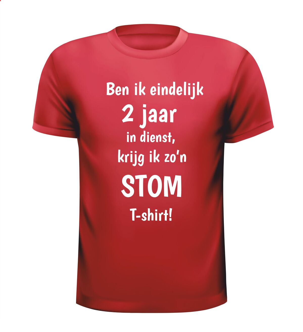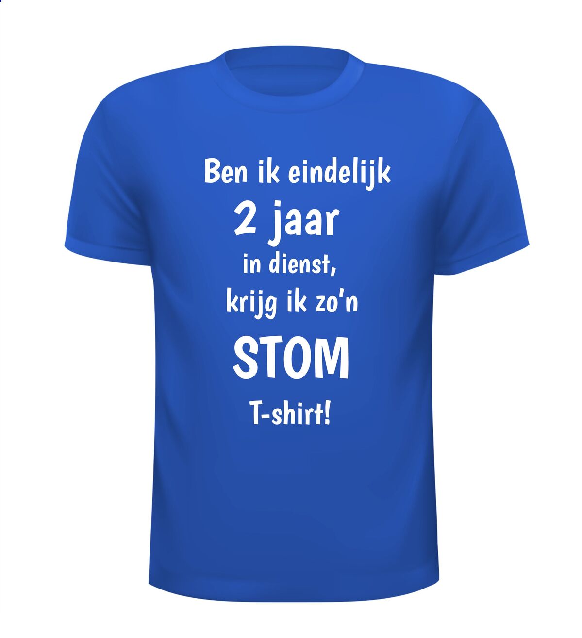Na twee jaar hard werken, meedenken, oplossen, bijspringen en waarschijnlijk meer doen dan in je functieomschrijving stond, verdien je natuurlijk… een t-shirt. En niet zomaar één, maar het iconische “Ben ik eindelijk 2 jaar in dienst, krijg ik zo’n stom shirt” jubileumshirt — hét shirt voor iedereen die hun werkjubileum graag viert met een flinke dosis humor.