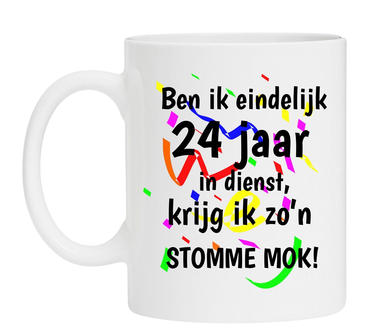 Op deze full colour mok staat de orginele tekst: ben ik endelijk 24 jaar dienst krijg ik zo'n stomme mok.