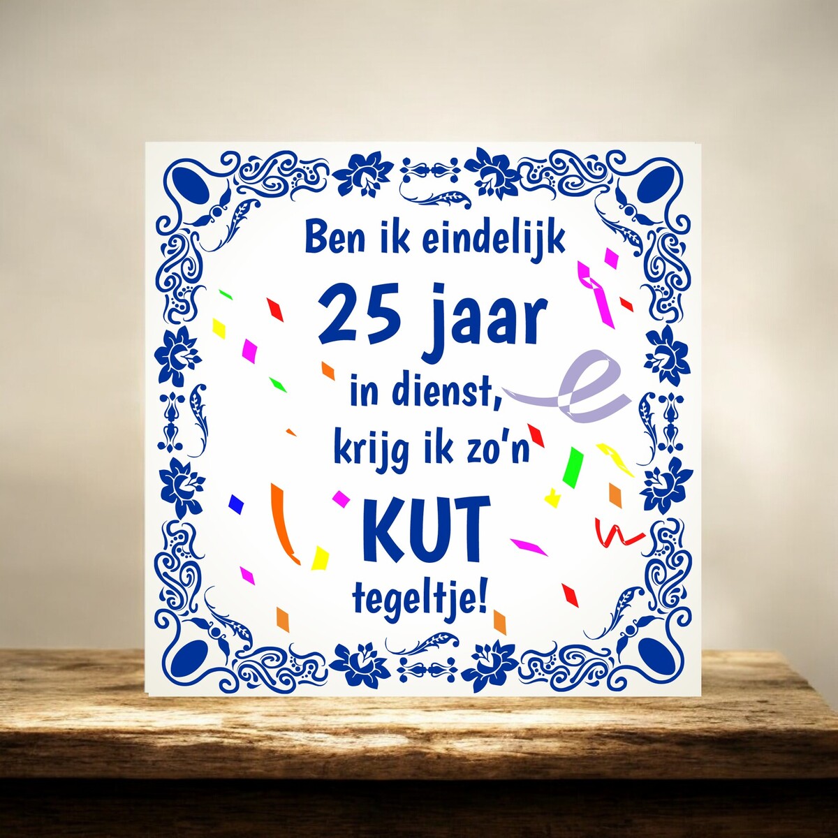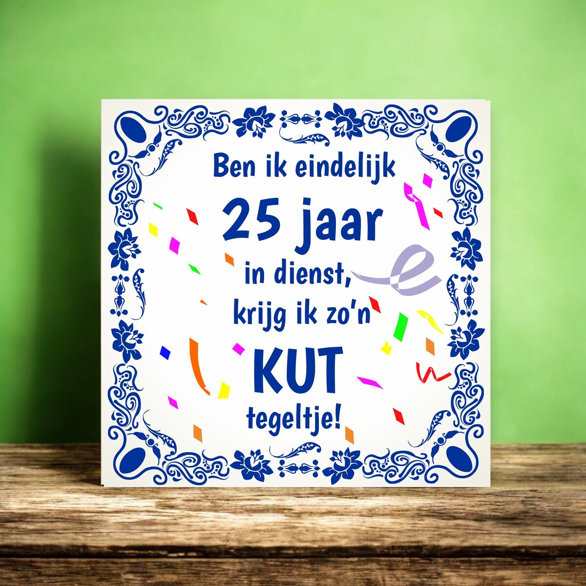 Leuke en feestelijke tegel met grappige tekst voor 25 jarig dienstverband. Op deze full colour tegel staat de tekst: ben ik eindelijk 25 jaar in dienst, krijg ik zo'n lullig tegeltje. De afmeting van de feestelijke tegel is 15 x 15 cm.