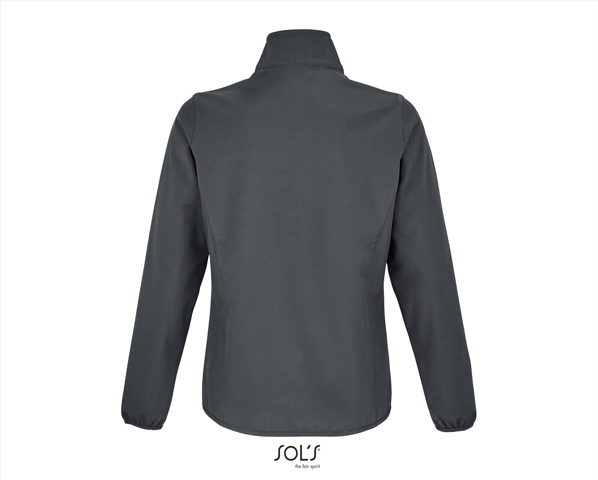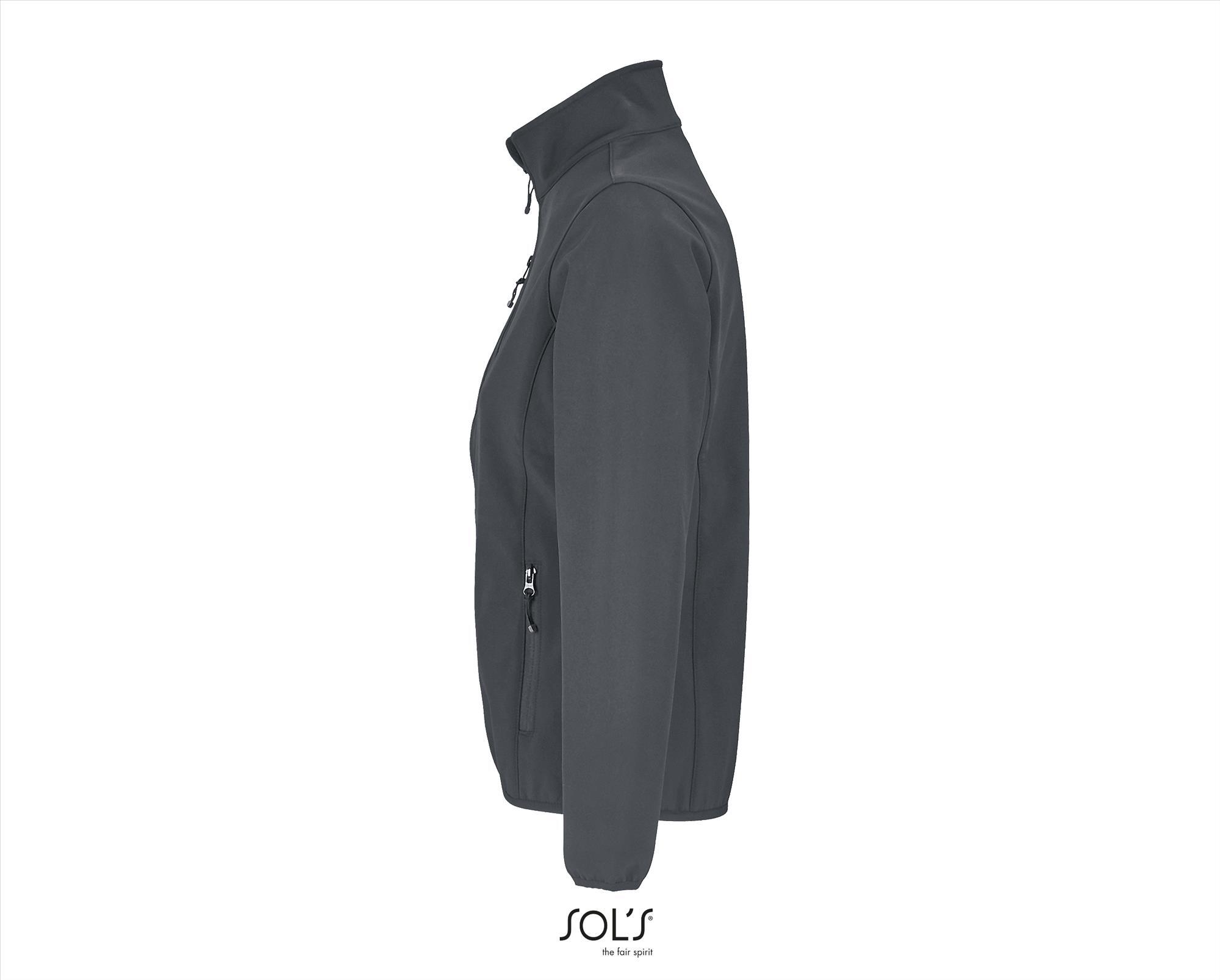 3 laags Softshell Jacket houtskool grijs voor dames met gerecycled polyester. Merk:SOL'S Falcon Women. Materiaal:94% Recycled Polyester - 6% Elastane. Dikte: 270 g/m2. Foto met model erop is een sfeer foto kleur buiten beschouwing houden. Land van herkomst:Bangladesh.