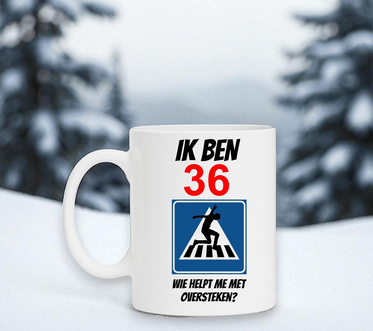 Full colour mok met de grappige tekst: ik ben 36 jaar wie helpt me oversteken?