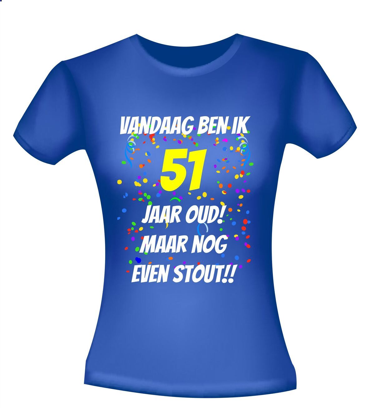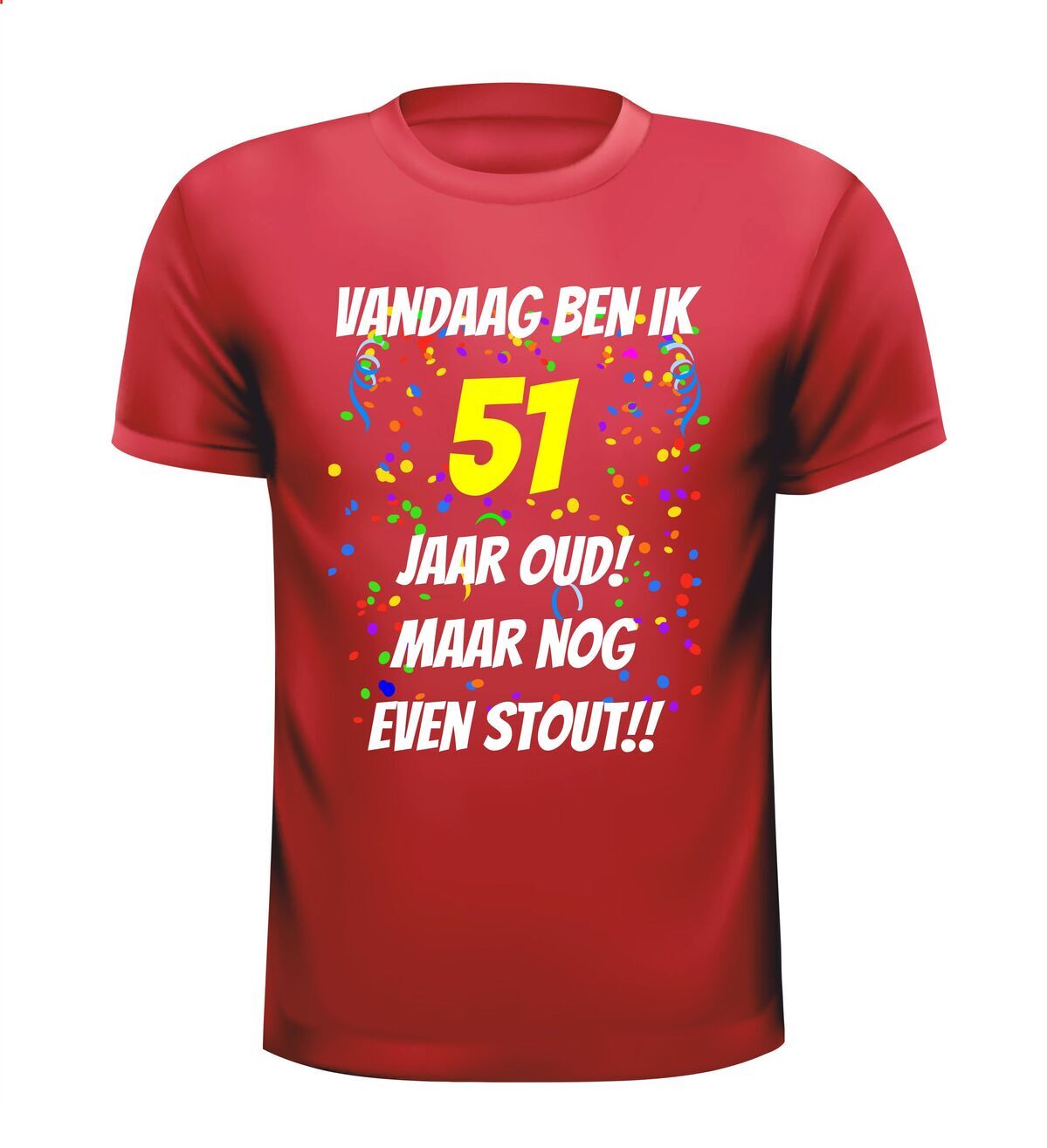 Verjaardag shirt voor een 51e verjaardag. Dit leuke leeftijd t-shirt met de tekst: vandaag ben ik 51 jaar oud, maar nog even stout is een van de vele shirts die wij in de collectie hebben voor verjaardagen.