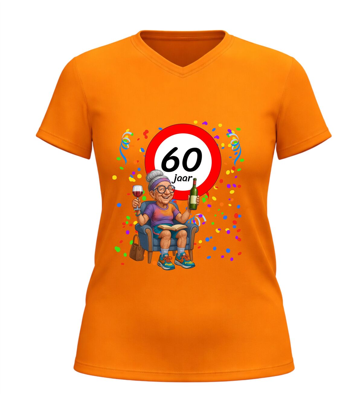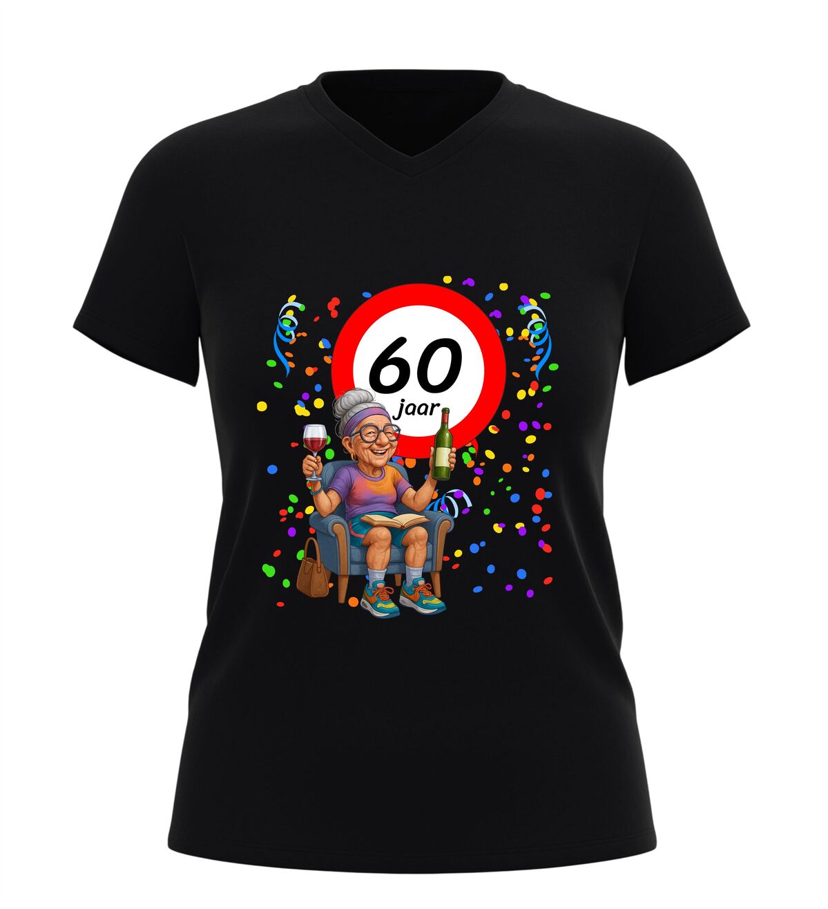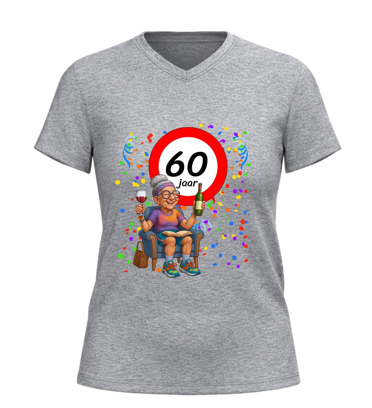 Ben je op zoek naar een dames T-shirt 60 jaar, verjaardags shirt dames, V-hals shirt voor 60e verjaardag of een origineel cadeau voor een vrouw van 60 jaar? Dan is dit shirt een uitstekende keuze. Door de combinatie van comfort, humor en herkenbaar design is het een populair verjaardagscadeau dat perfect past bij deze mijlpaal.