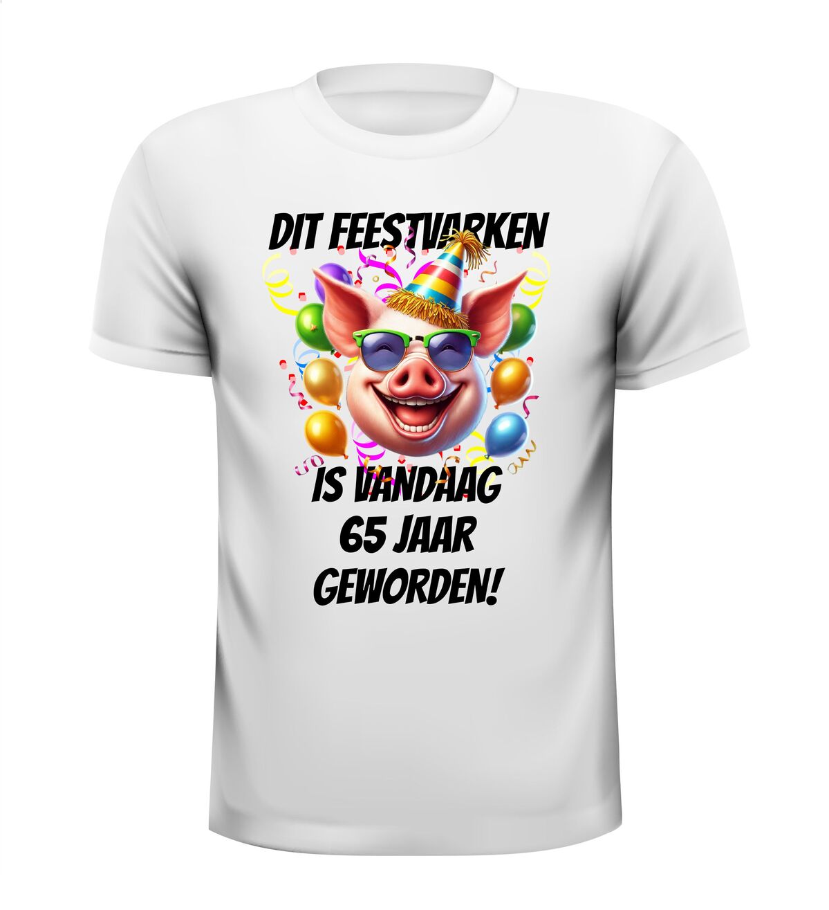 Wanneer je 65 jaar wordt kun je dit niet ongemerkt voorbij laten gaan. Wat is er leuker om de 65 jarige extra in de schijnwerper te zetten met dit mooie en grappige leeftijd shirt. Dit orginele ful colour shirt met de tekst dit feestvarken is vandaag 65 jaar geworden is erg leuk om kado te geven, maar ook cadeau te krijgen.