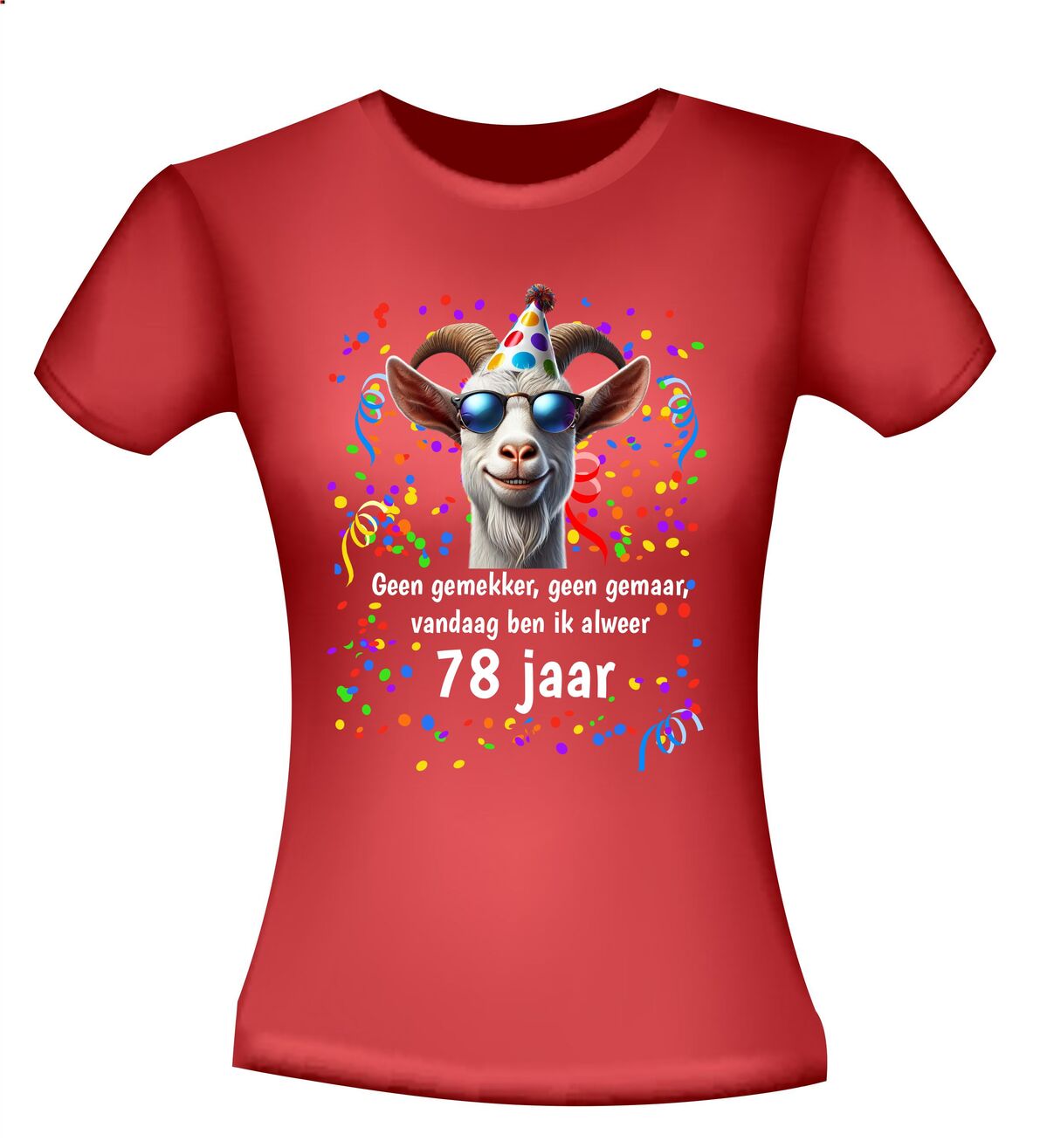 Leuk verjaardag shirt met mooie full colour print voor een 78e verjaardag. Op dit shirt staat de orginele en grappige tekst: geen gemekker, geen gemaar vandaag ben ik 78 verjaardag.