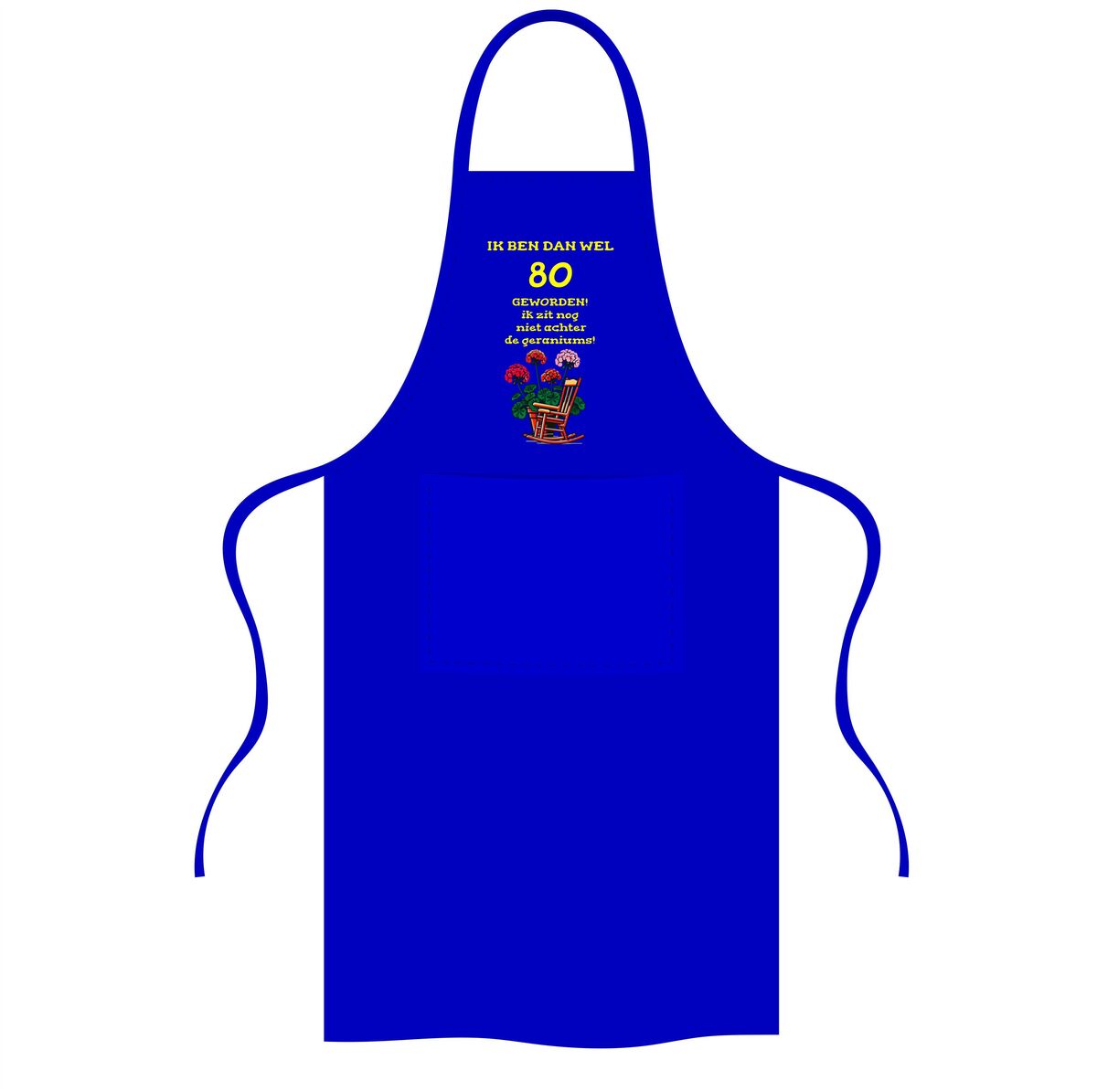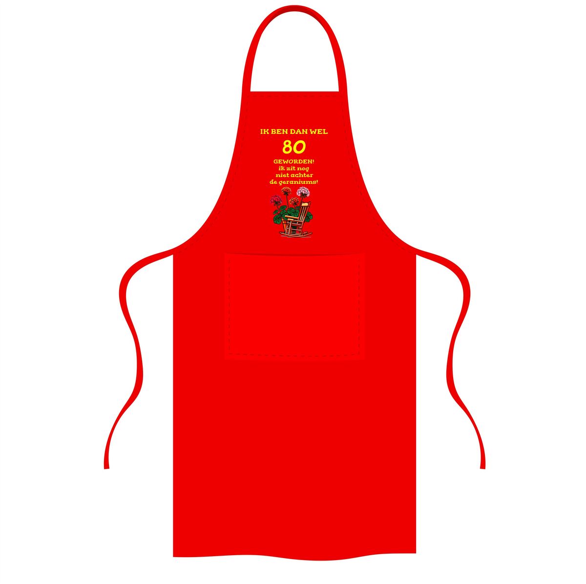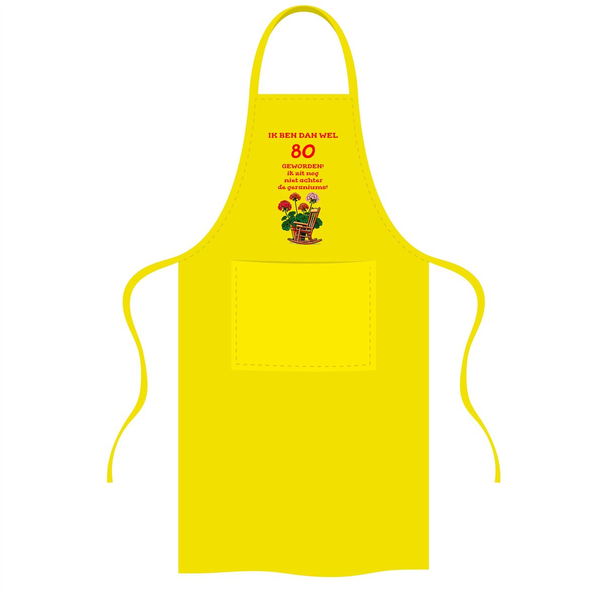 Vier 80 jaar met humor en energie met deze originele schort met de tekst ik ben dan wel 80 jaar geworden, ik zit nog lang niet achter de geraniums en een vrolijke afbeelding van geraniums. Dit 80 jaar schort is perfect voor iedereen die laat zien dat leeftijd geen beperking is en dat je ook op tachtigjarige leeftijd nog volop actief bent, zeker in de keuken of achter de barbecue. De combinatie van de grappige tekst en de kleurrijke geraniums zorgt voor een feestelijke en herkenbare uitstraling.