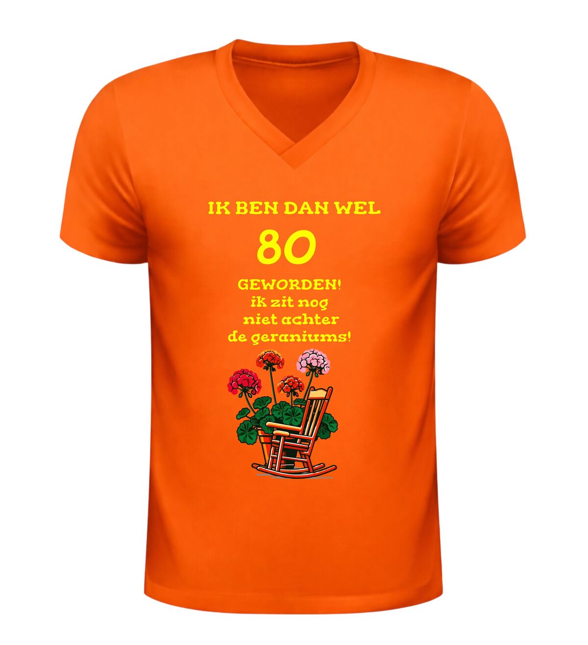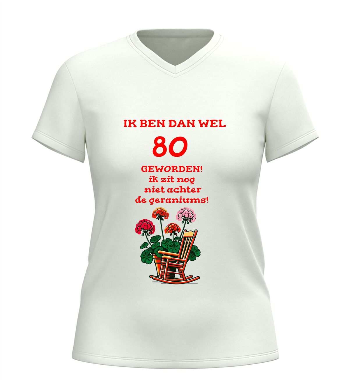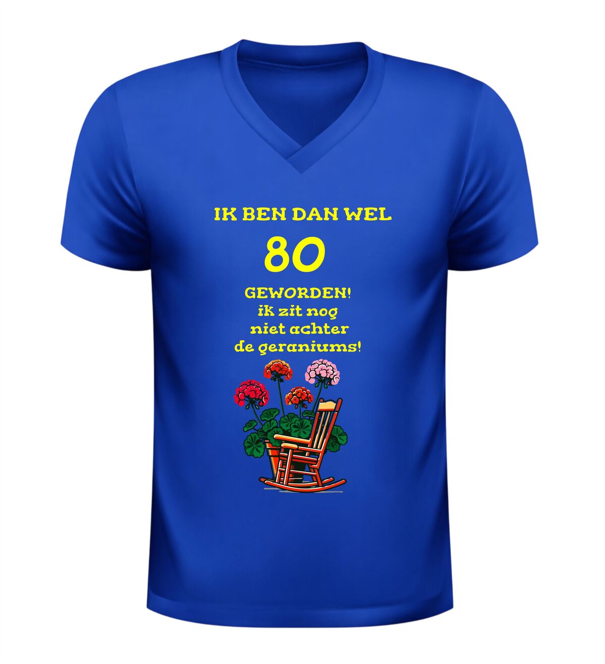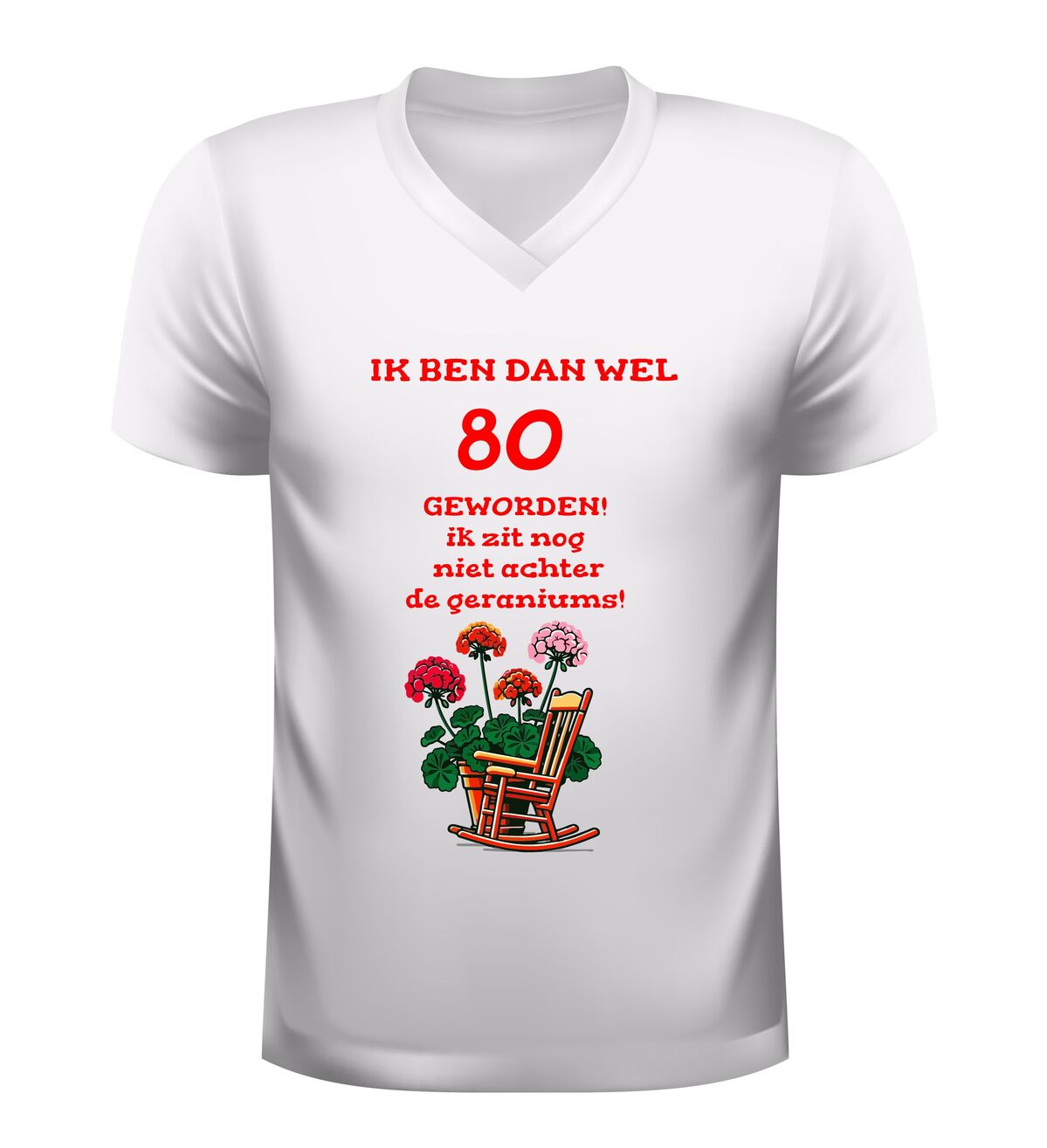 Het shirt is gemaakt van zachte, comfortabele stof en heeft een fijne pasvorm, waardoor het prettig draagt tijdens het feest en daarna. De bedrukking met tekst en geraniums blijft mooi, ook na meerdere wasbeurten. Zoek je een origineel 80 jaar cadeau, een grappig 80e verjaardag shirt of een V-hals T-shirt met de tekst nog lang niet achter de geraniums? Dan is dit feestelijke en humoristische verjaardag shirt de perfecte keuze om 80 jaar op een vrolijke en eigenzinnige manier te vieren.