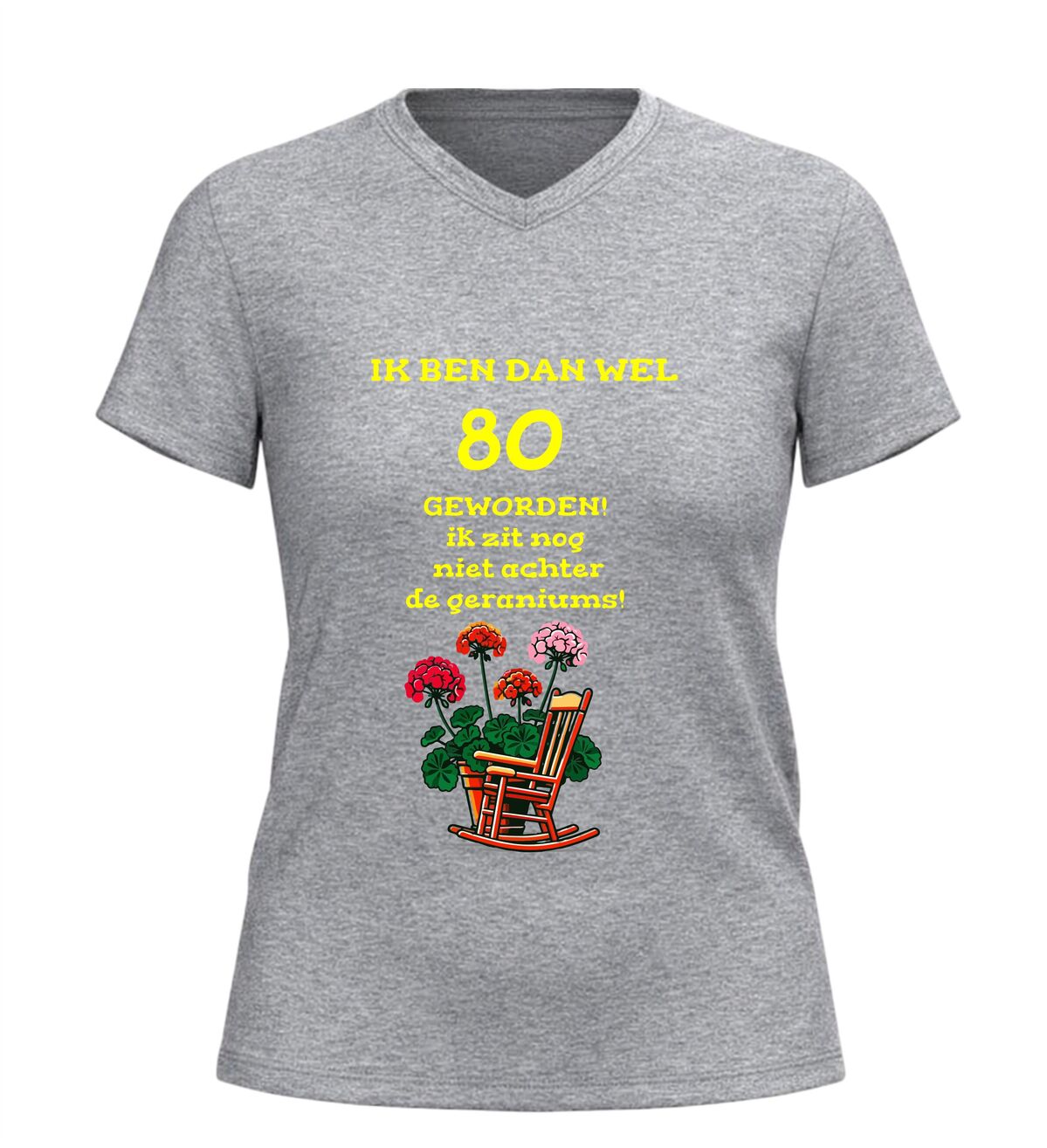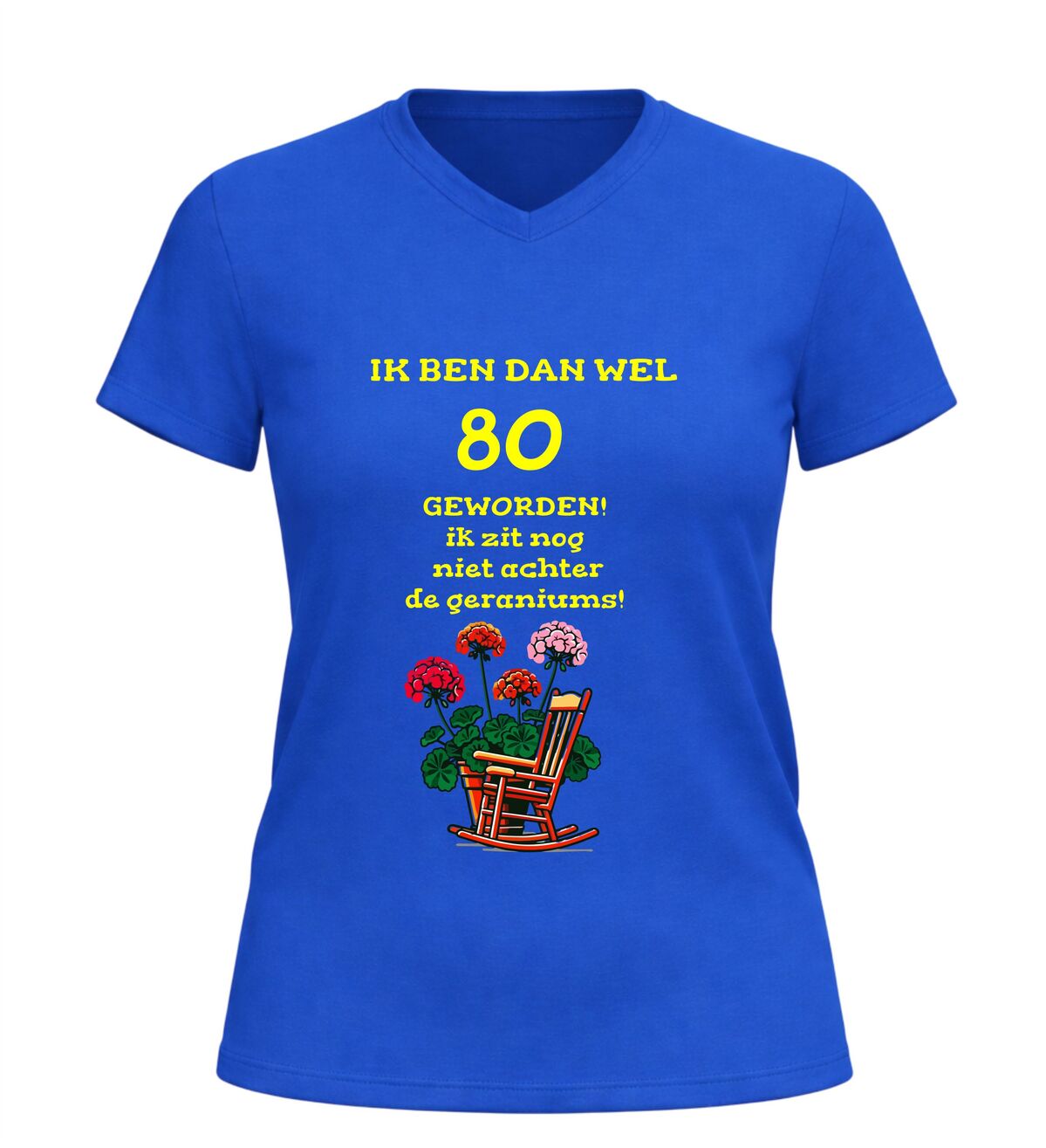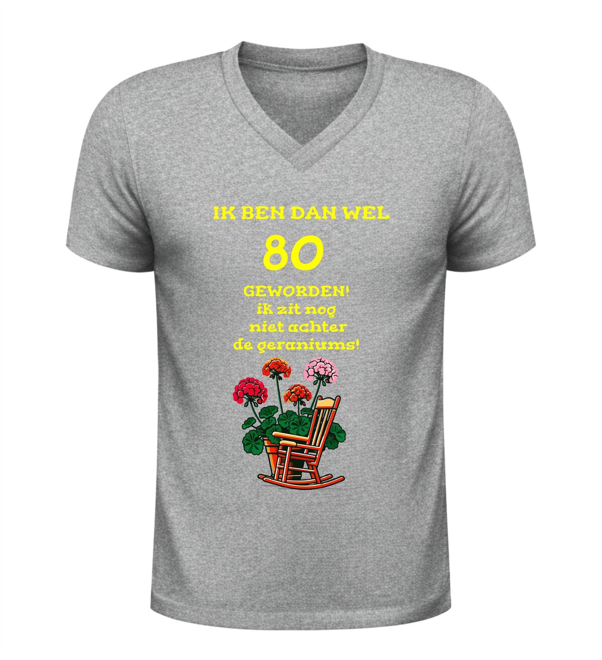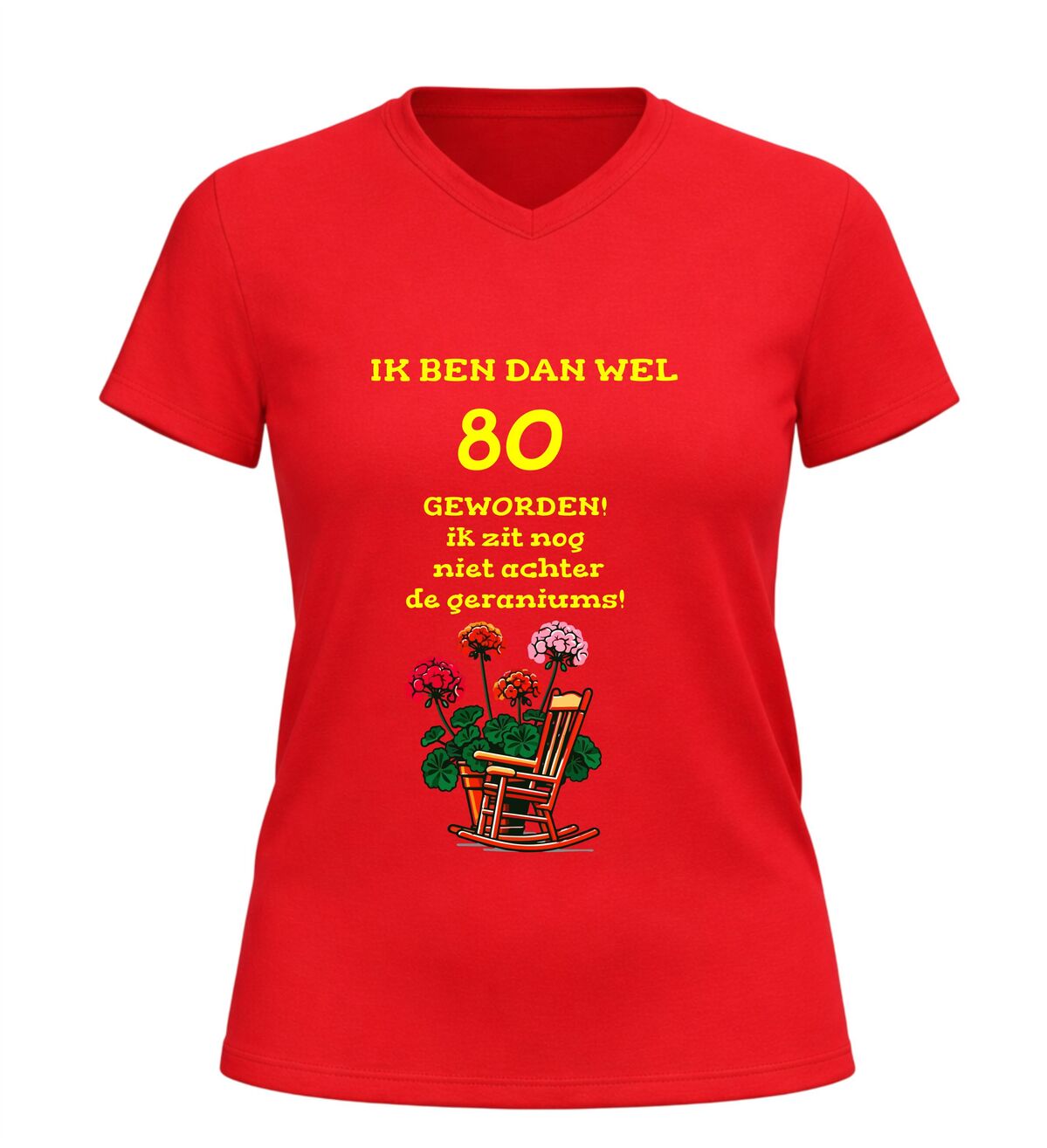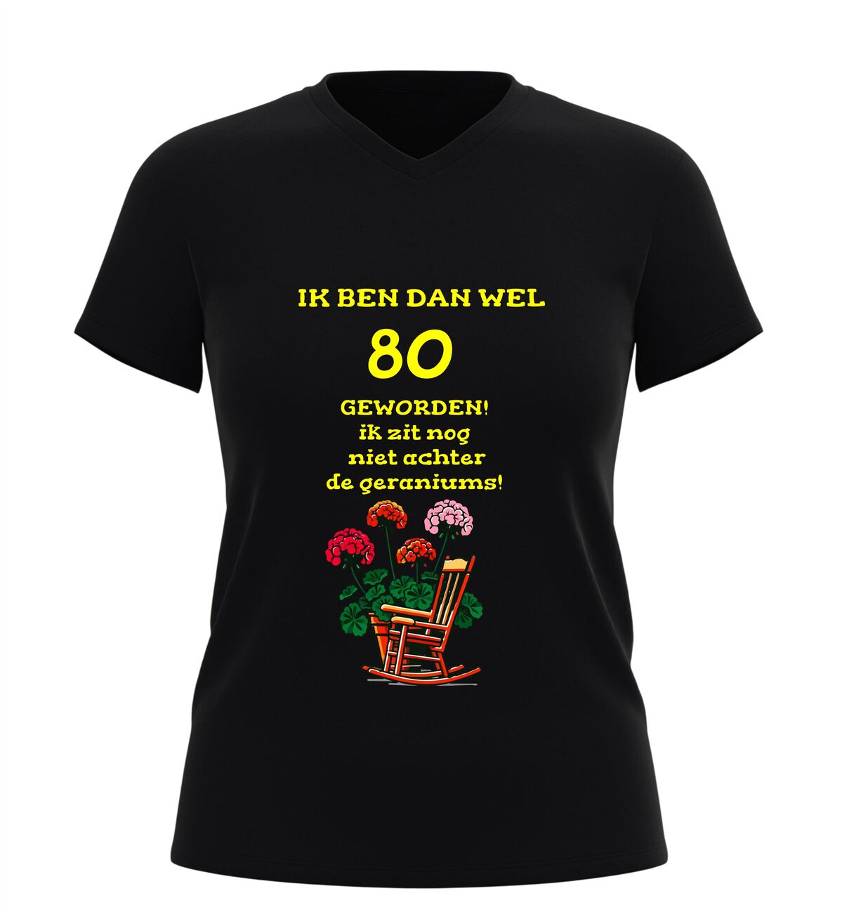 Het shirt is gemaakt van zachte, comfortabele stof en heeft een fijne pasvorm, waardoor het prettig draagt tijdens het feest en daarna. De bedrukking met tekst en geraniums blijft mooi, ook na meerdere wasbeurten. Zoek je een origineel 80 jaar cadeau, een grappig 80e verjaardag shirt of een V-hals T-shirt met de tekst nog lang niet achter de geraniums? Dan is dit feestelijke en humoristische verjaardag shirt de perfecte keuze om 80 jaar op een vrolijke en eigenzinnige manier te vieren.