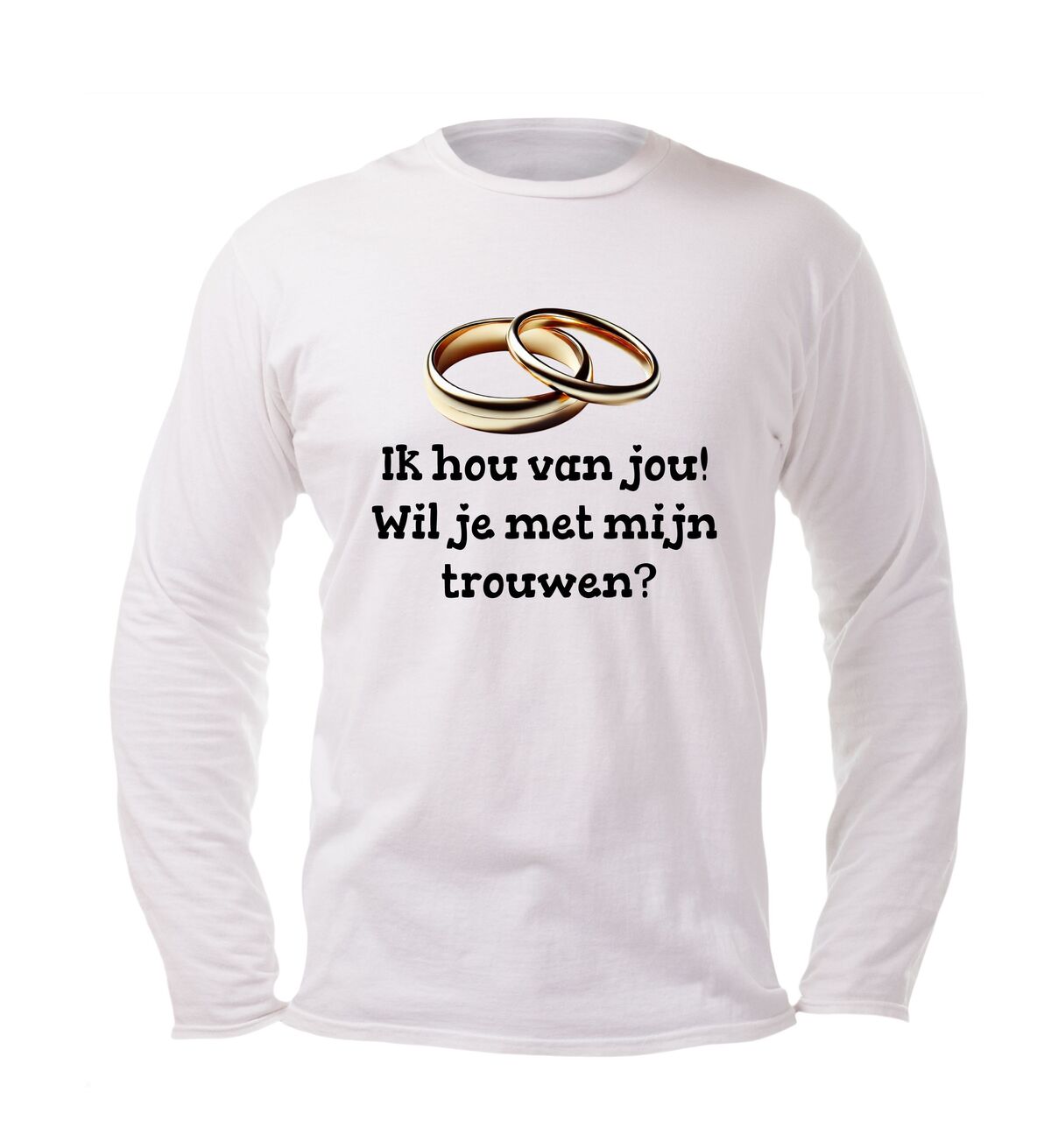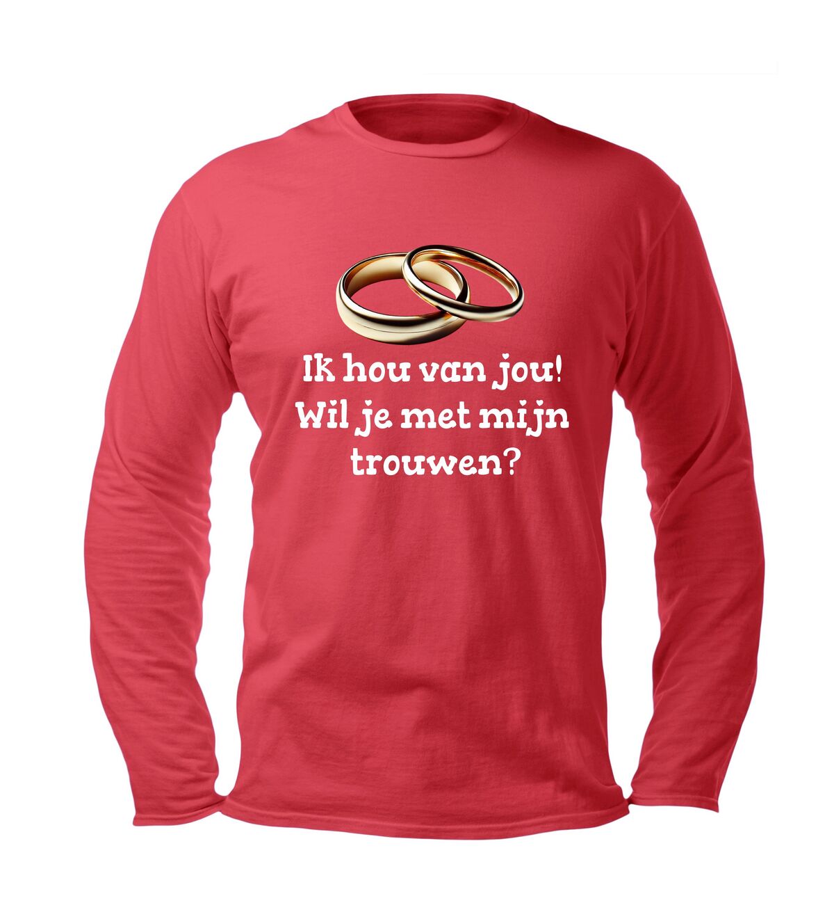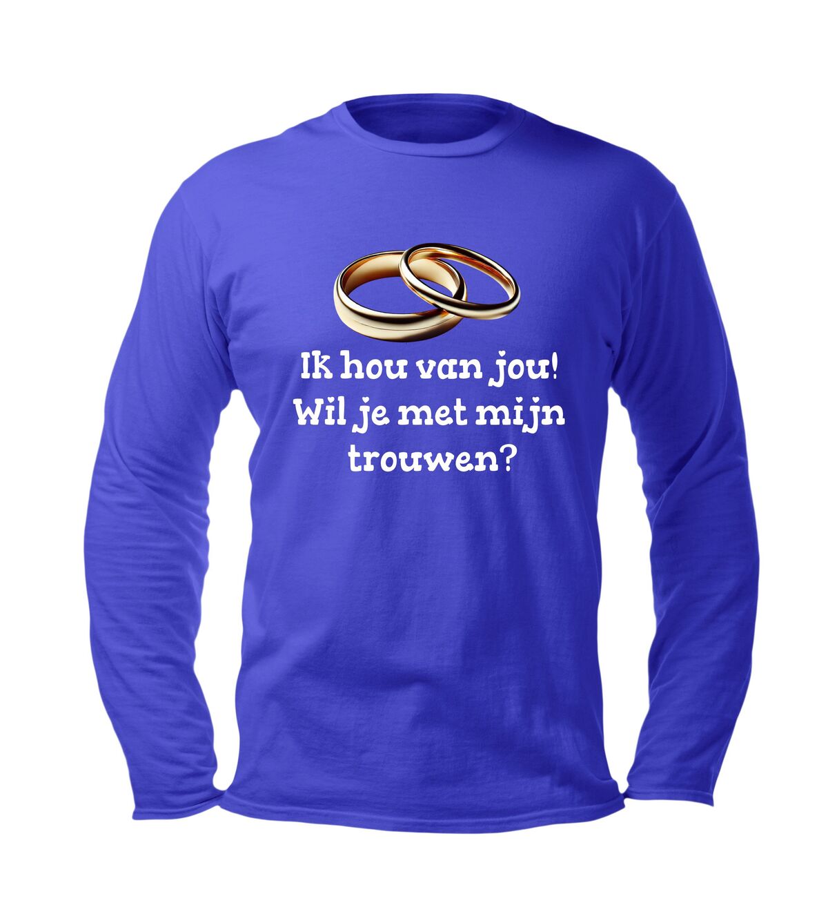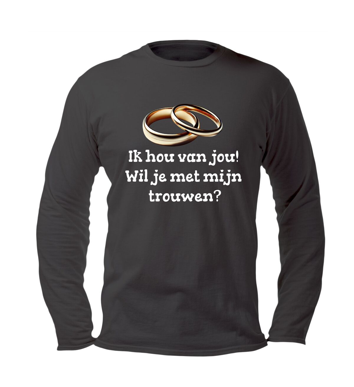 Soms zeggen woorden niet genoeg… maar deze longsleeve doet het voor je. Met de liefdevolle tekst “Ik hou van jou, wil je met me trouwen?” en een subtiel design met trouwringen, draag jij een boodschap die recht uit het hart komt. Perfect voor een verrassend aanzoek, een romantisch cadeau of gewoon om je liefde te laten stralen.
