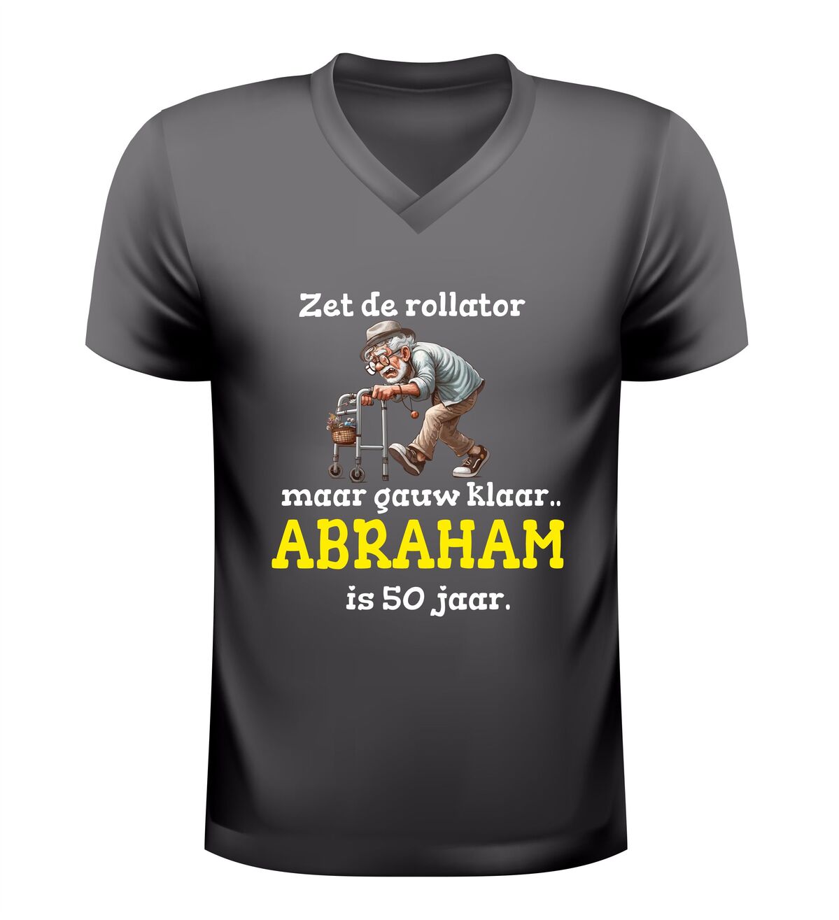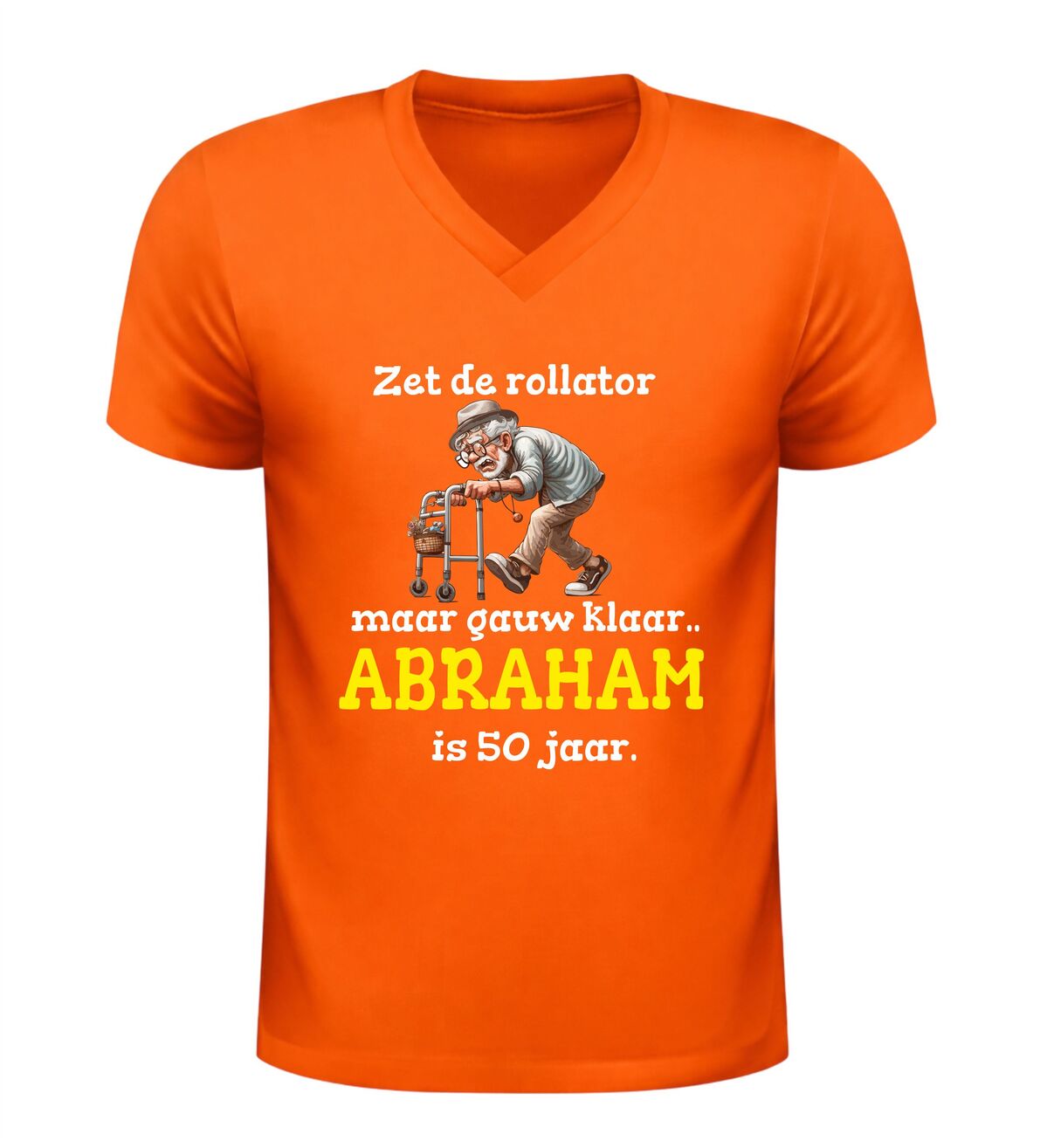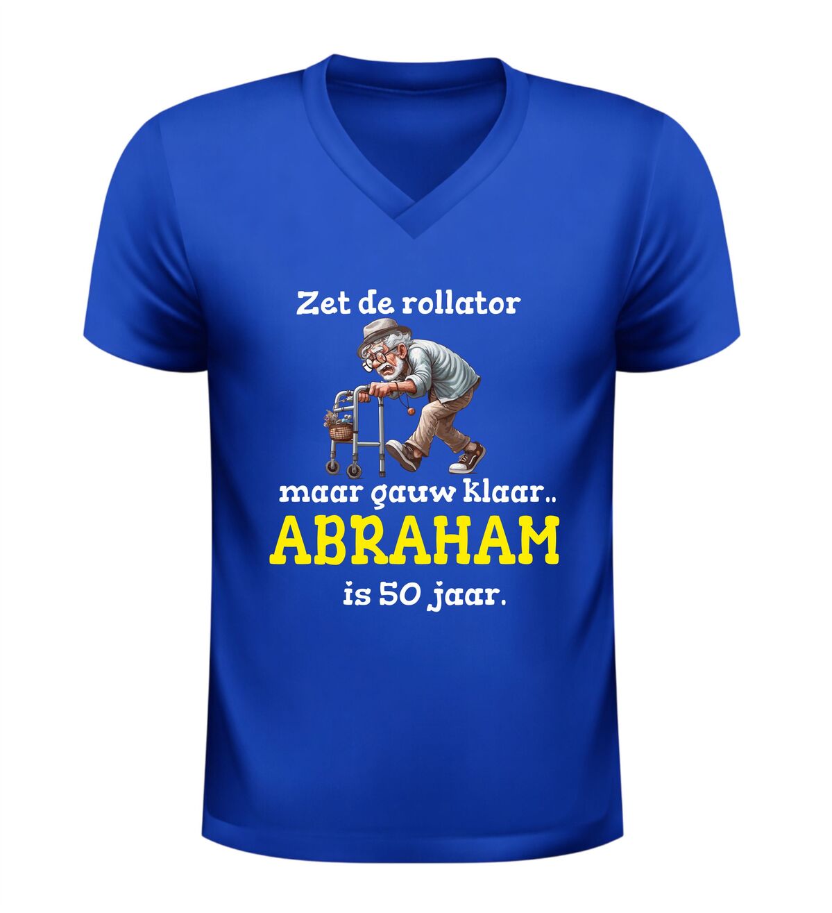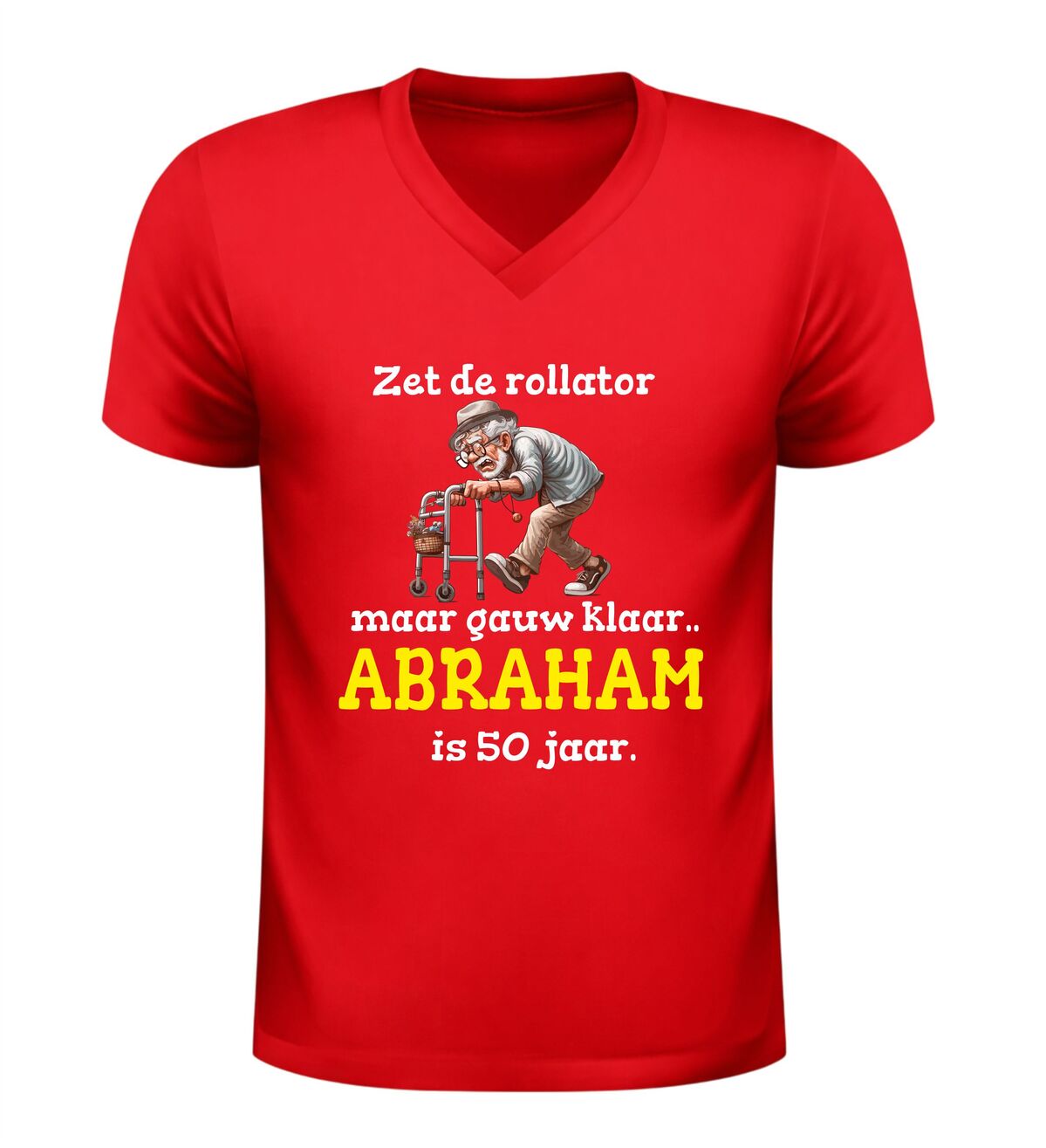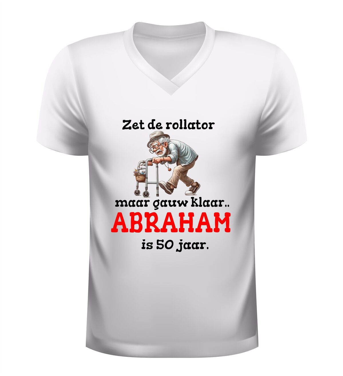Dit V-hals shirt met de tekst zet de rollator maar klaar want abraham is 50 jaar en de grappige afbeelding van een oude opa met rollator is hét perfecte verjaardag shirt om een 50e verjaardag met humor te vieren. De ludieke opdruk zorgt direct voor lachende gezichten en maakt dit shirt ideaal om te dragen tijdens een Abrahamfeest, verjaardagsfeest of gezellige borrel met vrienden en familie. Dankzij de comfortabele V-hals en prettige pasvorm zit dit verjaardag shirt heerlijk en is het geschikt om de hele dag te dragen. Het speelse ontwerp laat zien dat vijftig worden prima samengaat met zelfspot en gezelligheid. Dit Abraham 50 jaar V-hals shirt is bovendien een origineel cadeau voor mannen die de mijlpaal van vijftig bereiken en er met een knipoog van willen genieten. Met dit verjaardag shirt combineer je comfort, humor en een onvergetelijk moment in één opvallend kledingstuk.