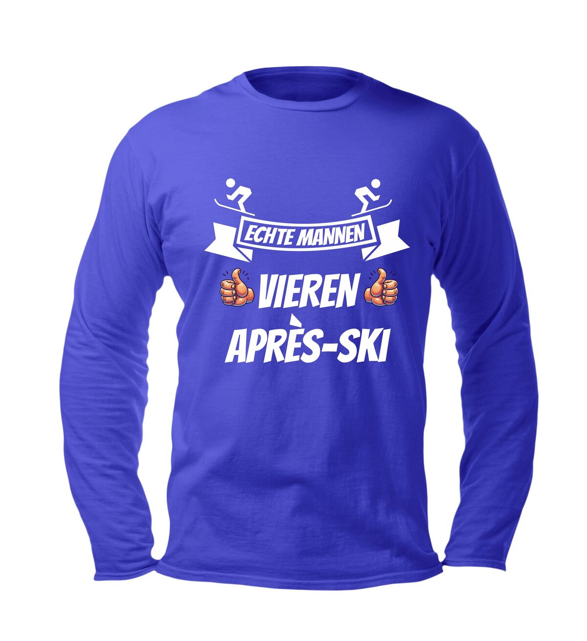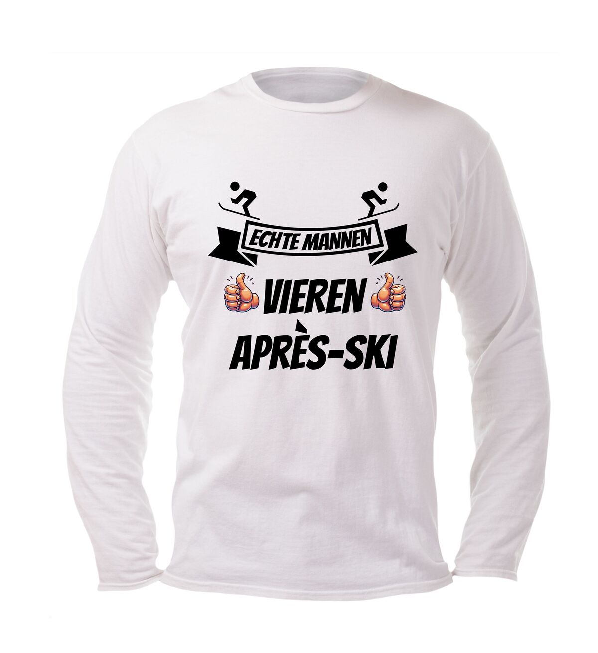 Ben jij meer van de glühwein dan van de piste? Met deze longsleeve laat je iedereen meteen zien waar jij voor naar de bergen komt: het echte feest ná het skiën! De tekst “Echte mannen vieren après-ski” zegt precies wat jij denkt – en zorgt gegarandeerd voor lachende gezichten tijdens elk wintersportavontuur.