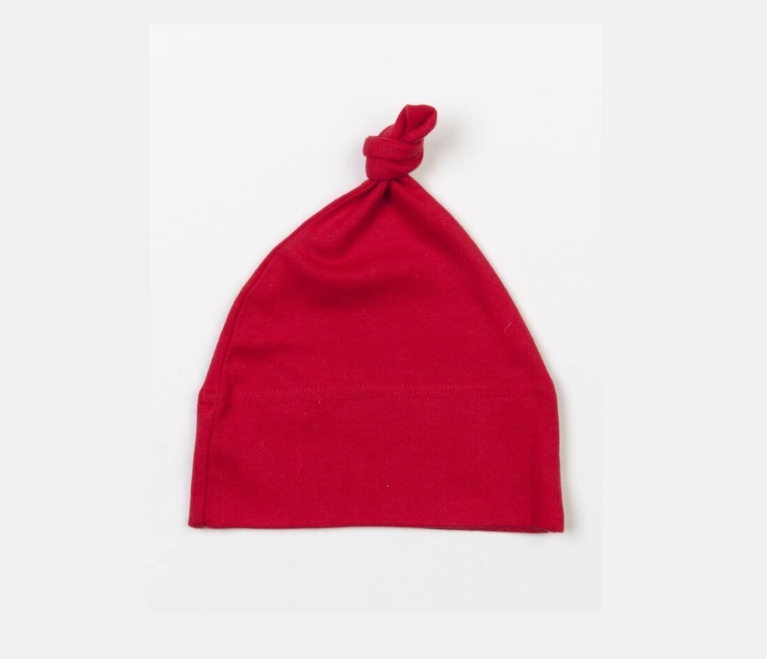Baby muts rood met brede zelfgebonden bandopening voor comfort. Afgewerkt met een enkele knoop bovenaan. Materiaal:100% organic certified katoen. Dikt: 200 g/m2. Merk: babybugz. Foto met baby erop is een sfeer foto kleur buiten beschouwing houden. Land van herkomst: Tanzanie.
