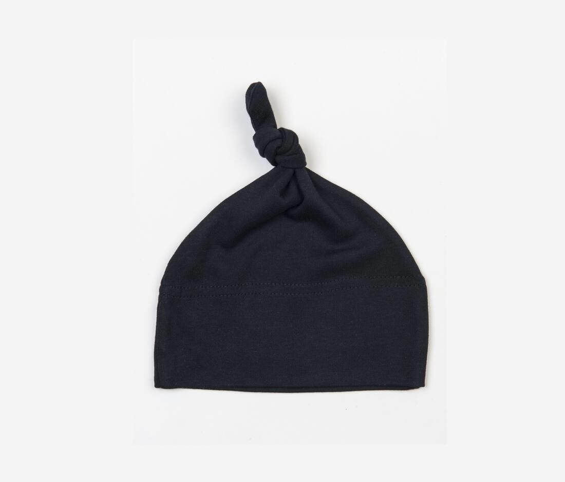 Baby muts zwart met brede zelfgebonden bandopening voor comfort. Afgewerkt met een enkele knoop bovenaan. Materiaal:100% organic certified katoen. Dikt: 200 g/m2. Merk: babybugz. Foto met baby erop is een sfeer foto kleur buiten beschouwing houden. Land van herkomst: Tanzanie.
