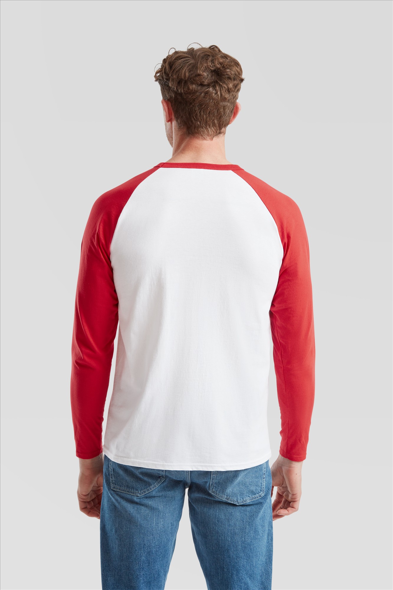 Baseball T-shirt Lange mouw wit met zwarte mouwen. Dit gave fijngebreide baseball shirt lange mouw is voor de stoere vent. Merk: Fruit of Loom. Materiaal:100% Cotton GSM:160 g/m2.