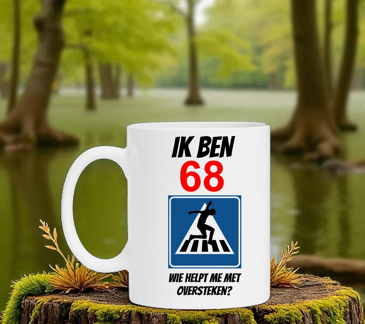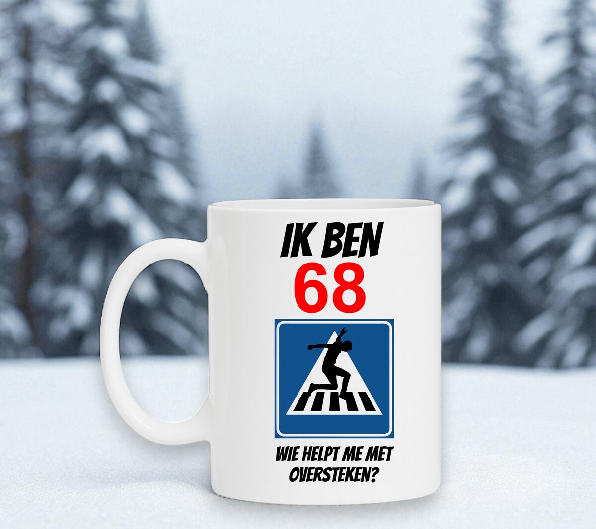 Op deze mok staat de orginele en humoristische tekst: ik ben 68 wie helpt me oversteken?