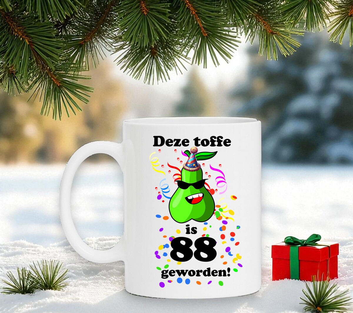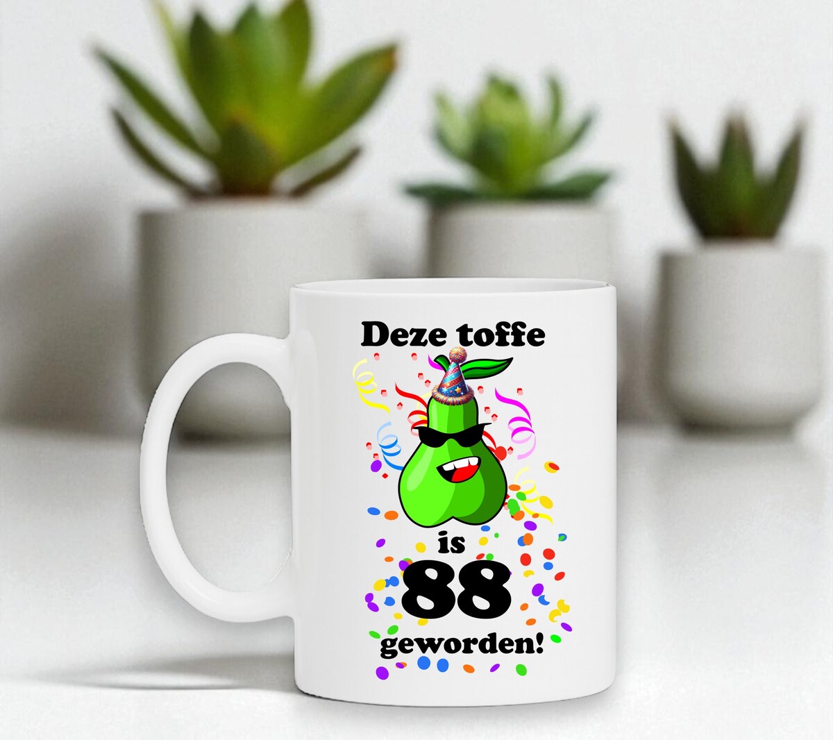 Deze mok is een leuk en orgineel verjaardag cadeau voor een toffe peer die zijn of haar 88e verjaardag viert. Op deze mok staat de grapigge print en tekst: deze toffe peer is 88 geworden.