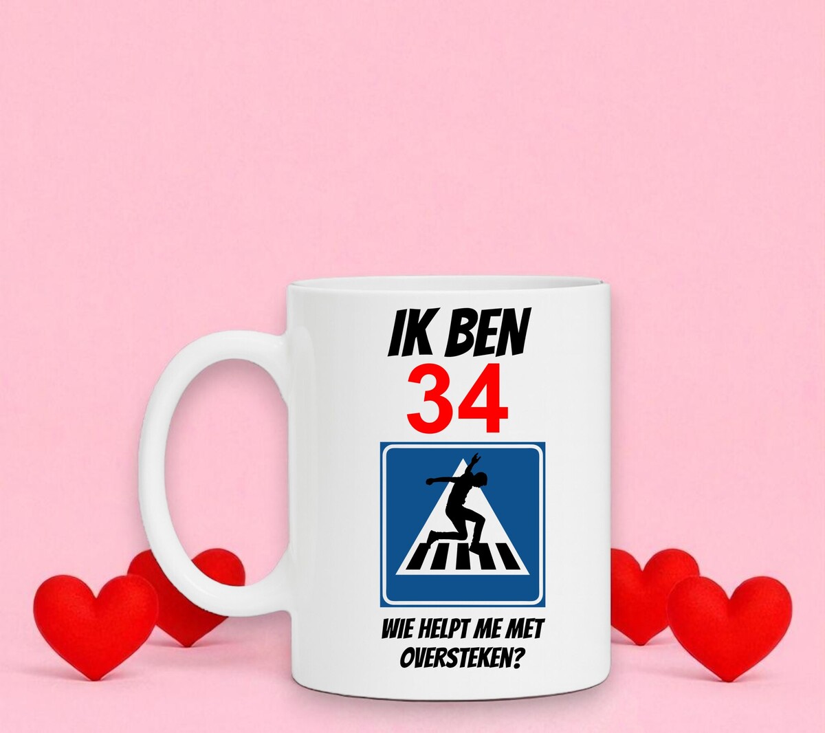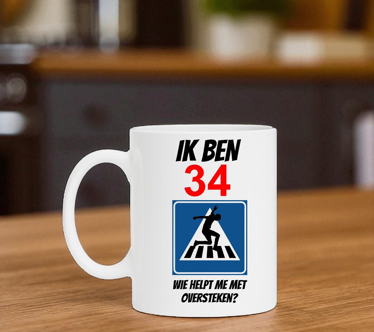 Deze grappige beker met leuke opdruk is een orgineel cadeau tijdens een 34ste verjaardag. Op deze mok staat de full colour tekst: ik ben 34 jaar wie helpt me oversteken?