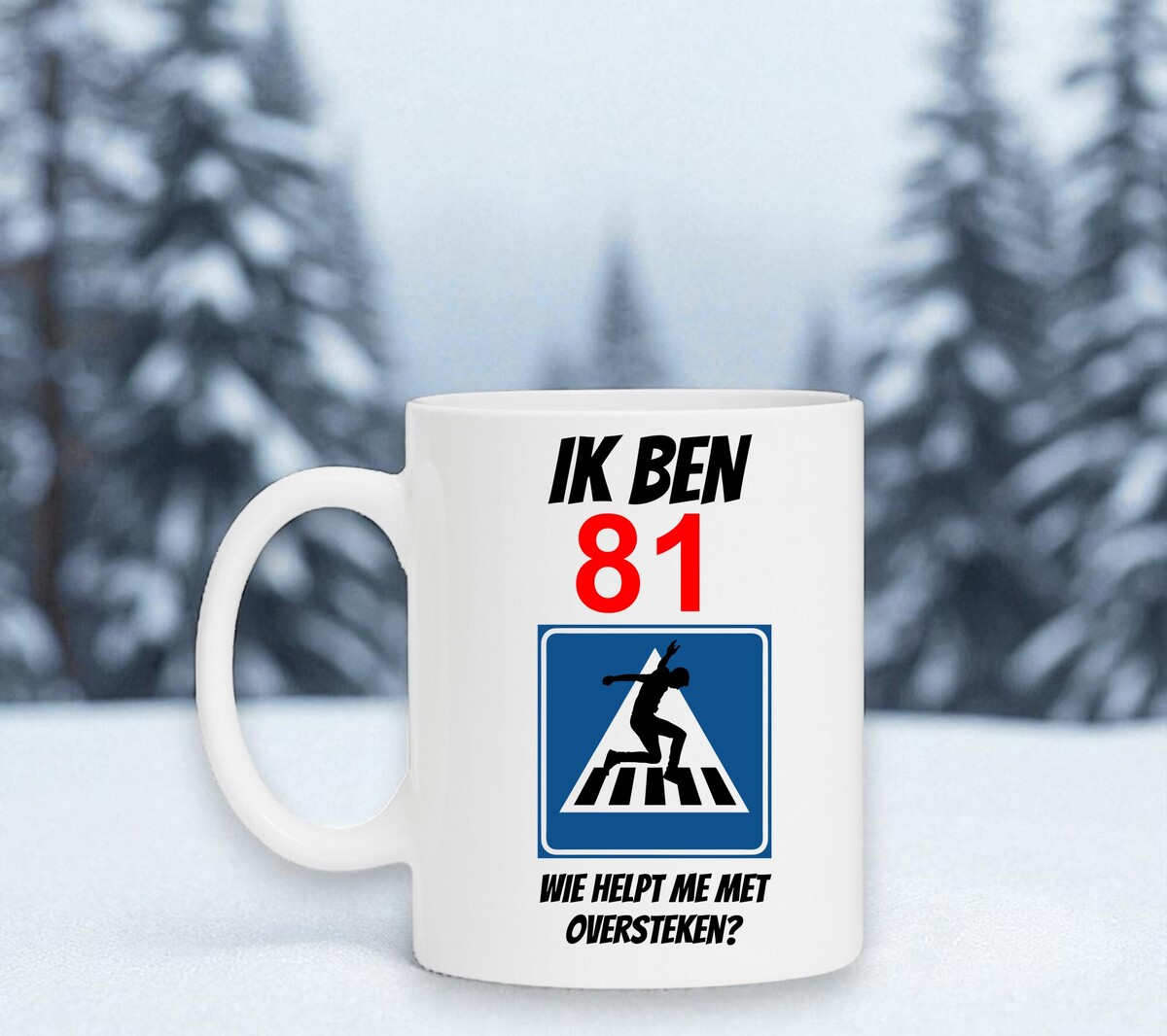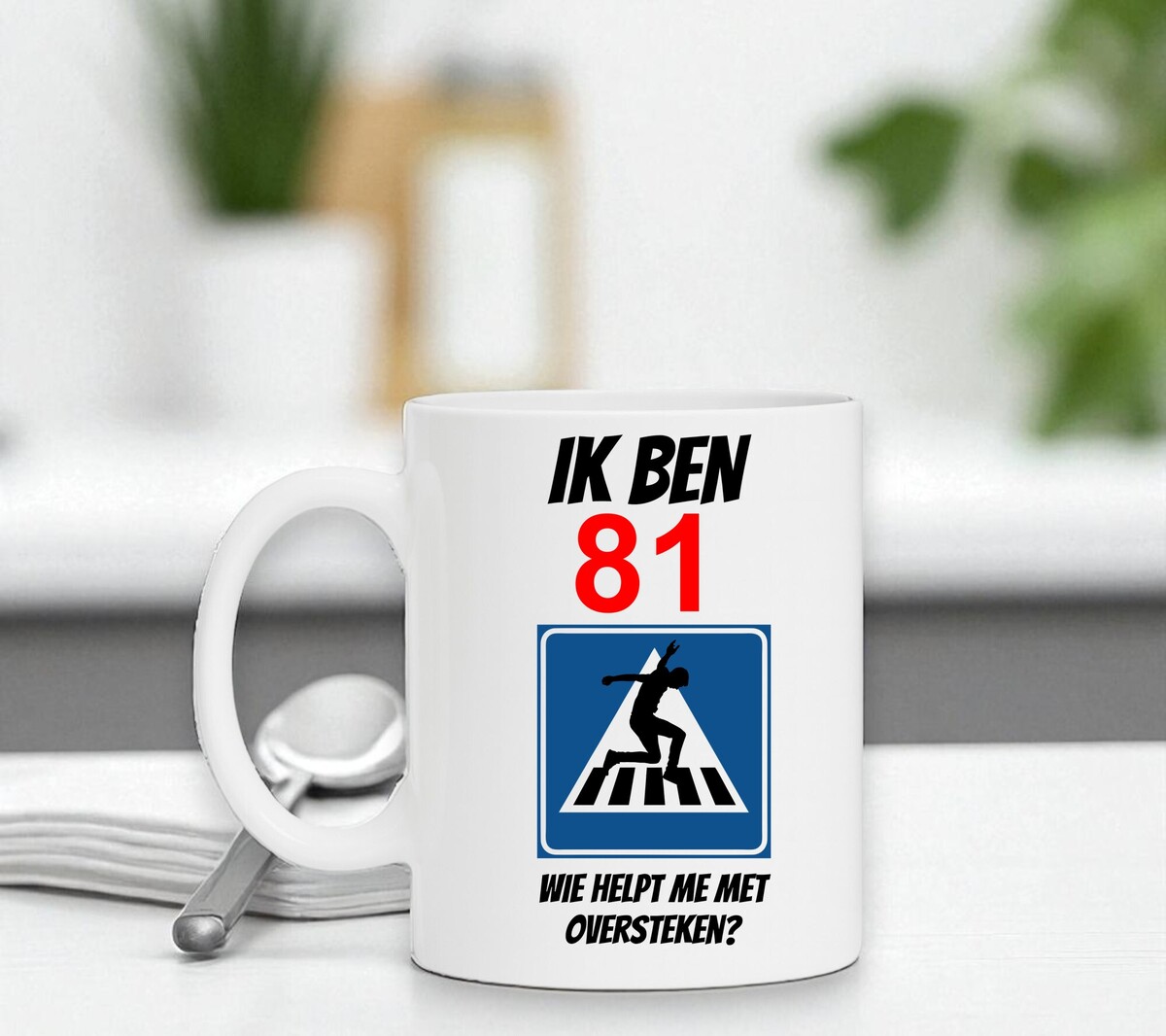 Deze leeftijdsmok voor de leeftijd van 81 jaar is 1 van de velen mokken die wij in ons assortiment hebben. Wij hebben bijna voor elke leeftijd een mok uit voorraad leverbaar. Op deze mok staat de humoristische tekst: ik ben 81 wie helpt me oversteken?