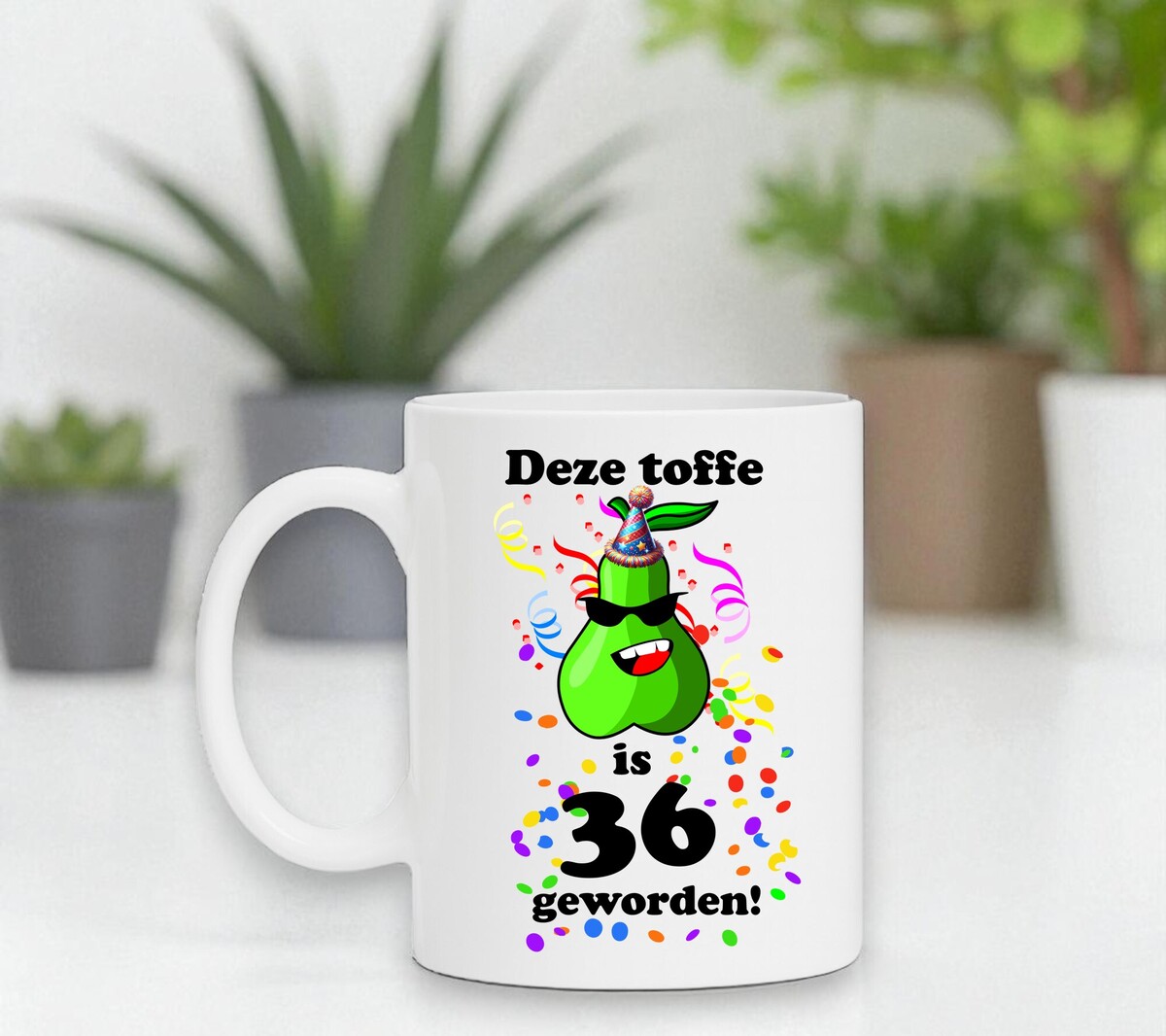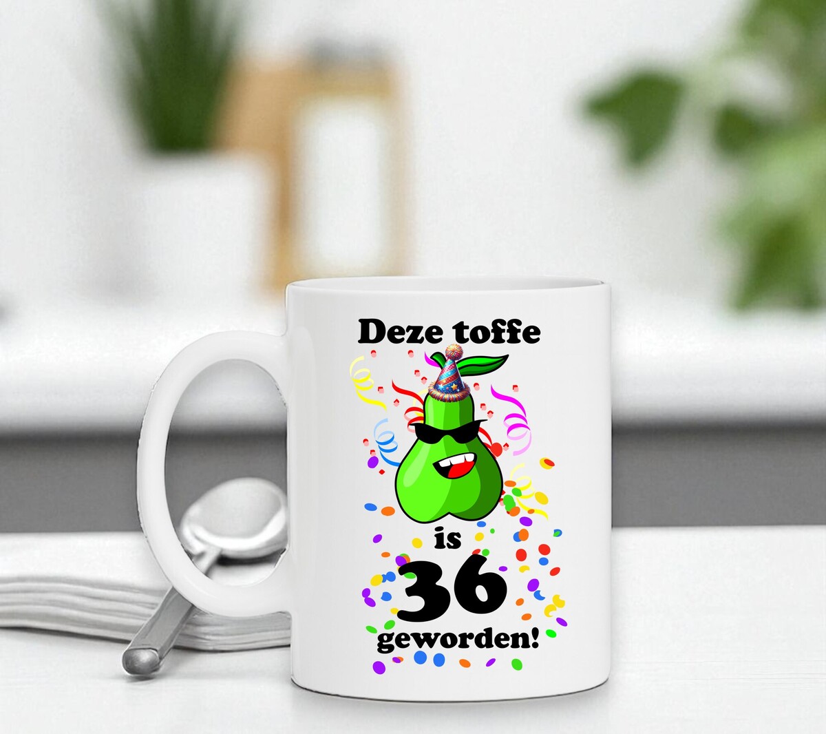 Op deze mooie bedrukte mok staat de grappige print en leuke tekst: Deze toffe peer is 36 geworden.