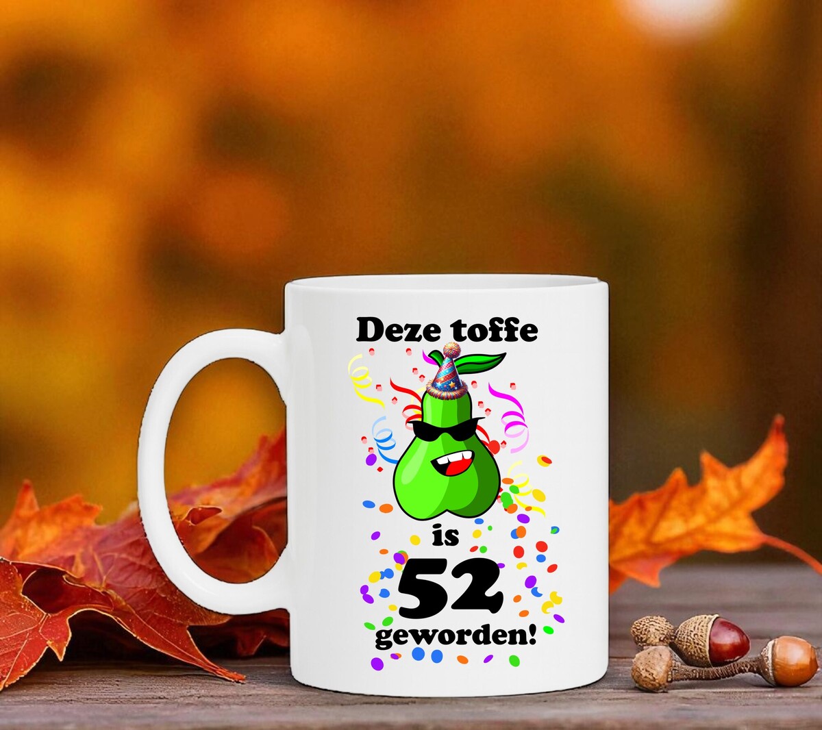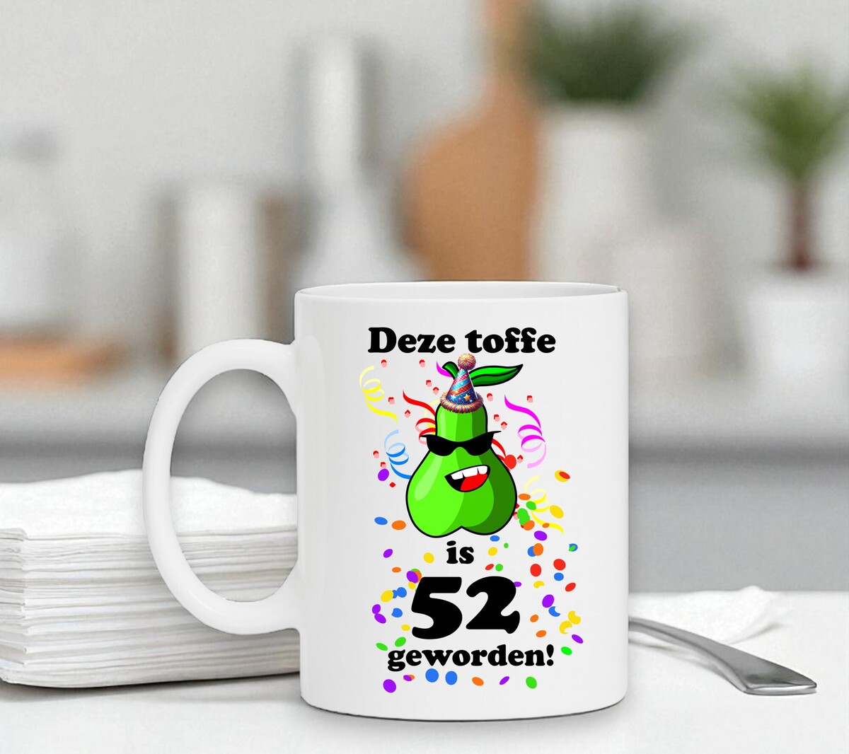 Deze mog met full colour opdruk van een toffe peer is een grappig cadeau voor een 52e verjaardag. Op zoek naar een andere leeftijd mok. Kijk gerust even verder op onze online feestwinkel. Wij hebben een groot assortiment in verjaardag mokken.