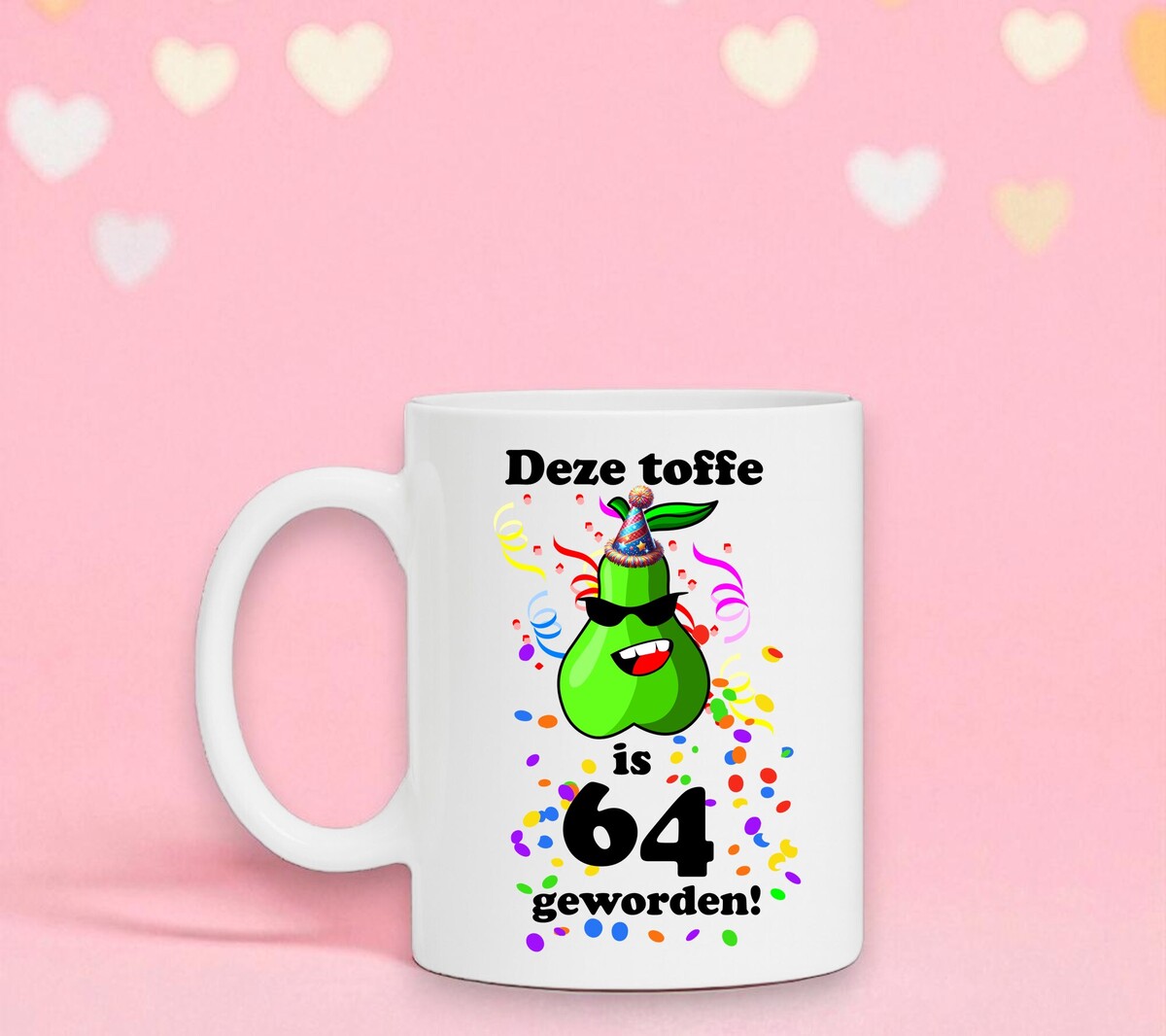 Deze leuke verjaardag mok is een grappig en orgineel cadeau voor een feestelijke verjaardag van 64 jaar. Op deze mok staat de grappige print en tekst: deze toffe peer is 64 geworden.