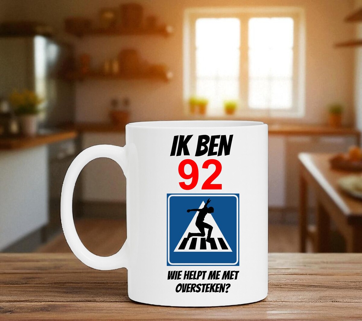 Op deze bedrukte full colour mok staat de orginele tekst: ik ben 92 wie helpt me met oversteken?
