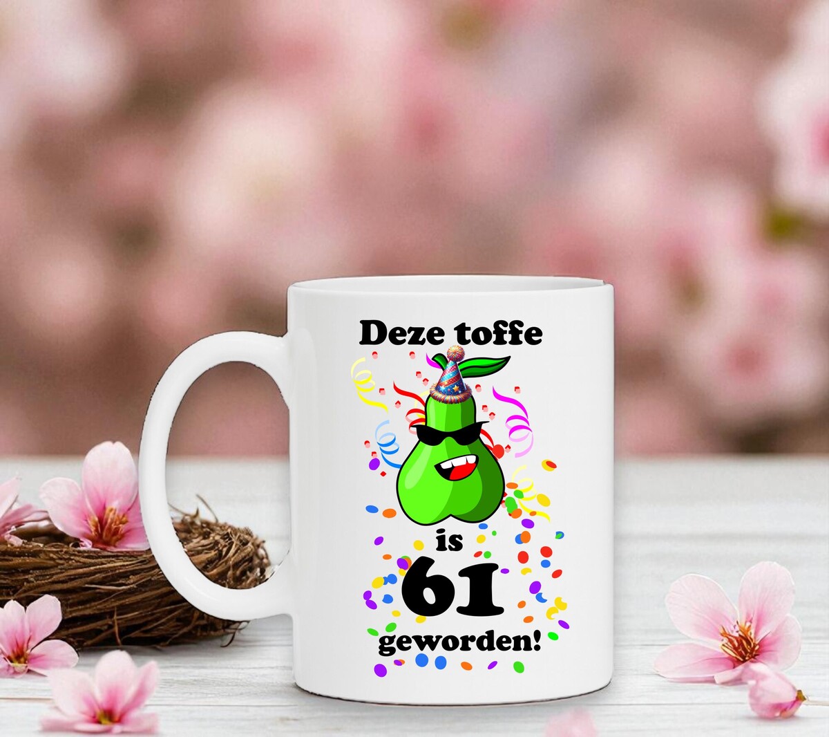 Deze leuke en grappige verjaardag mok is een orgineel cadeau voor een toffe peer die 61 jaar wordt. Op zoek naar andere leeftijds mokken? kijk gerust eens verder na ons ruime assortiment mokken.