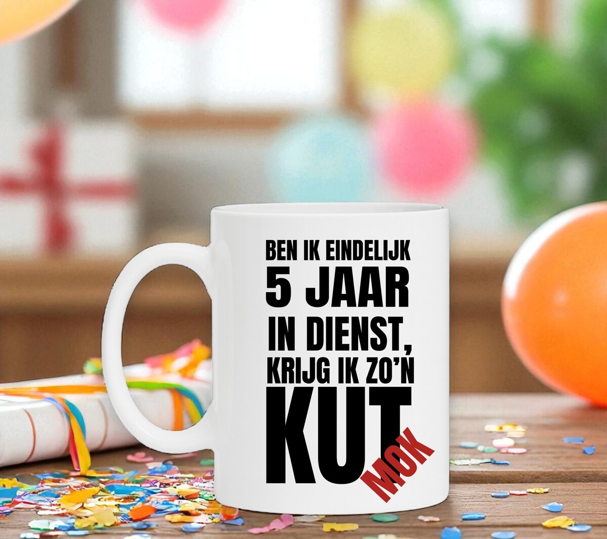 Een grappige koffie voor een collega die 5 jaar in dienst is! De mok is voorzien van de opdruk 'Ben ik eindelijk 5 jaar in dienst krijg ik zo'n kut mok!'. De mok is magnetron en vaatwasserbestendig en de witte mok heeft een hoogte van 96mm en een diameter van 80mm.