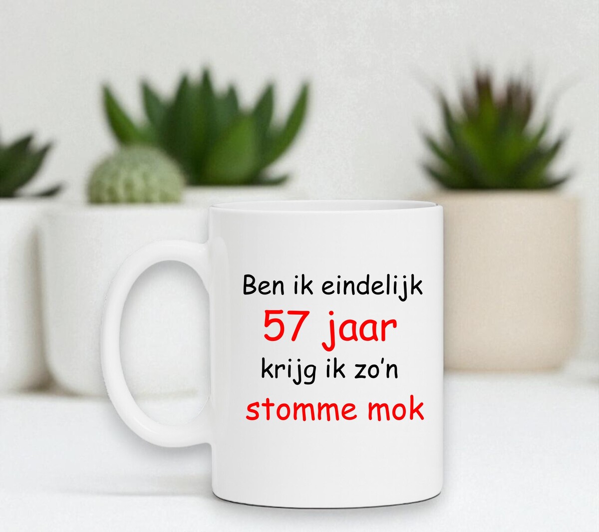 Ben ik eindelijk 57 jaar krijg ik zo'n stomme mok.