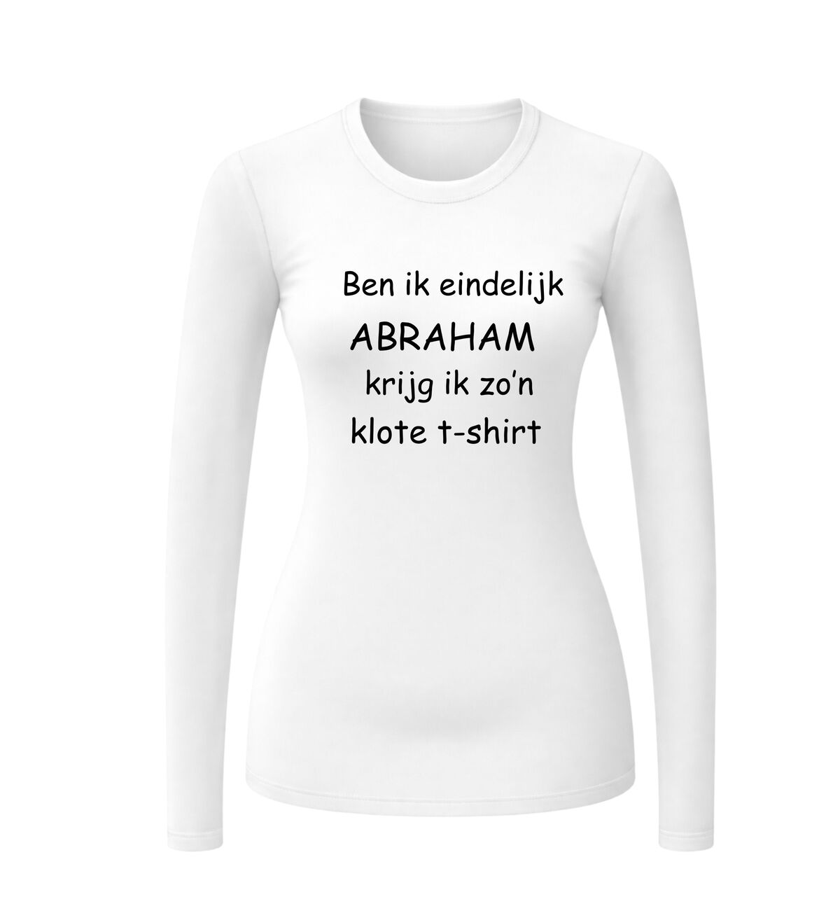 Feestje van een Abraham dan is dit een leuk en origneel kado. T-shirt lange mouw met de tekst : Ben ik eindelijk abraham krijg ik zo klote shirt lange mouw