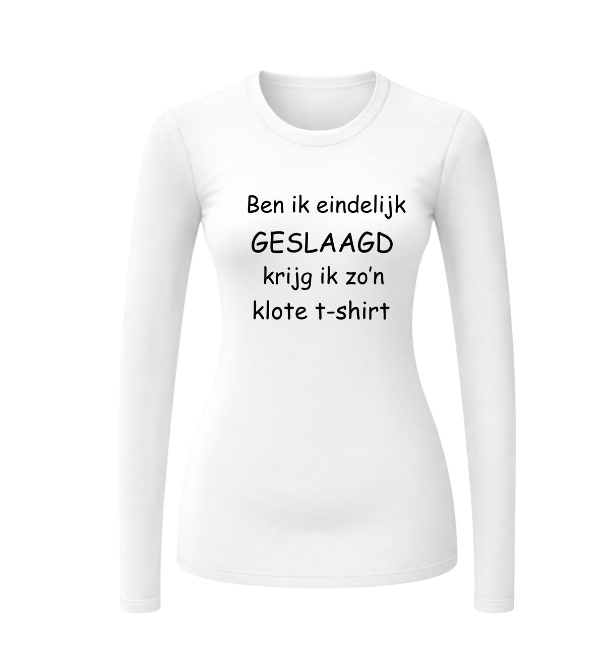 Heb je een feestje van iemand die net voor zijn rijbewijs, school, of ander examen is geslaagd. Dan is dit een orgineel kado een t-shirt lange mouw met de tekst Ben ik eindelijk geslaagd krijg ik zon kut