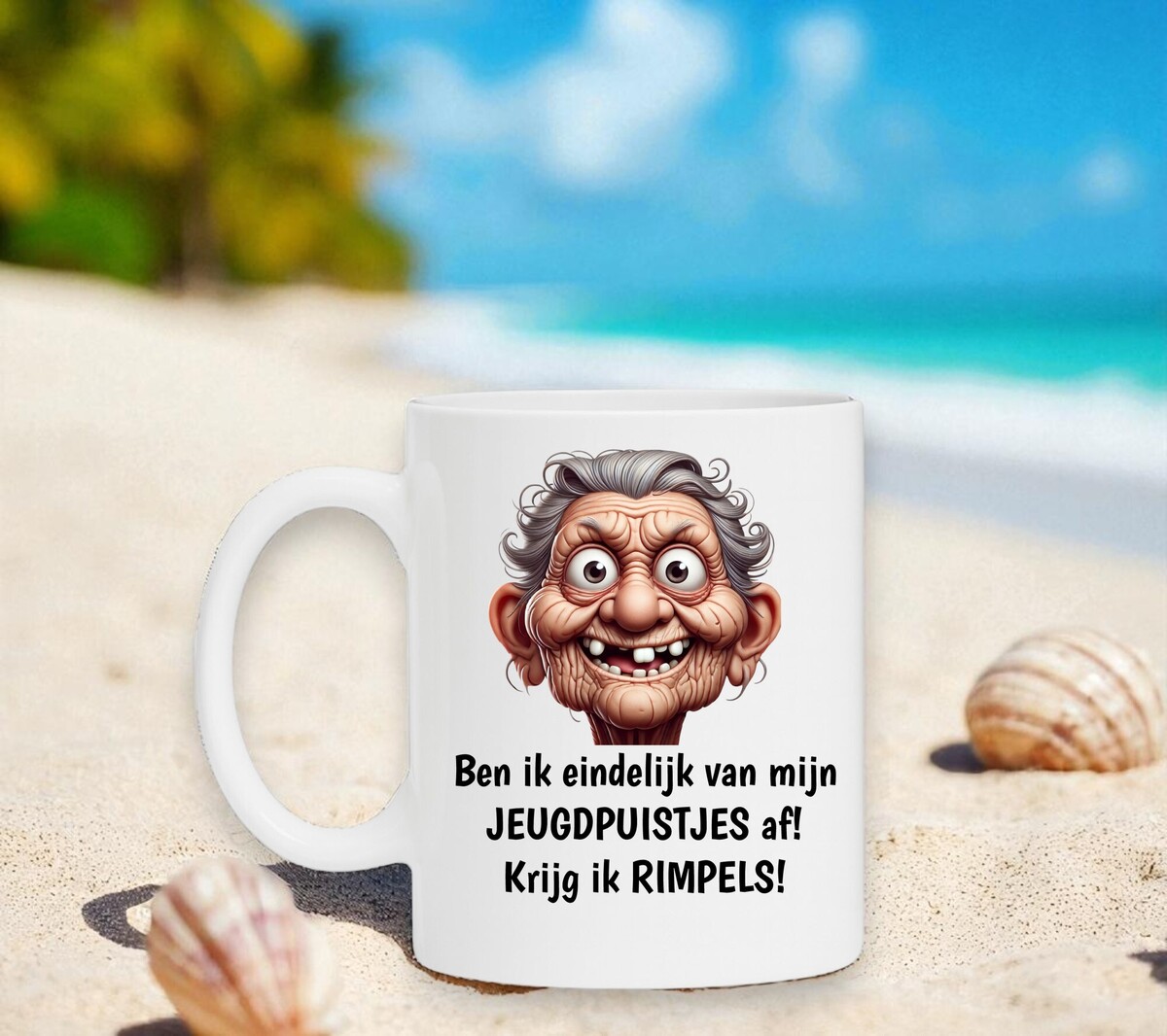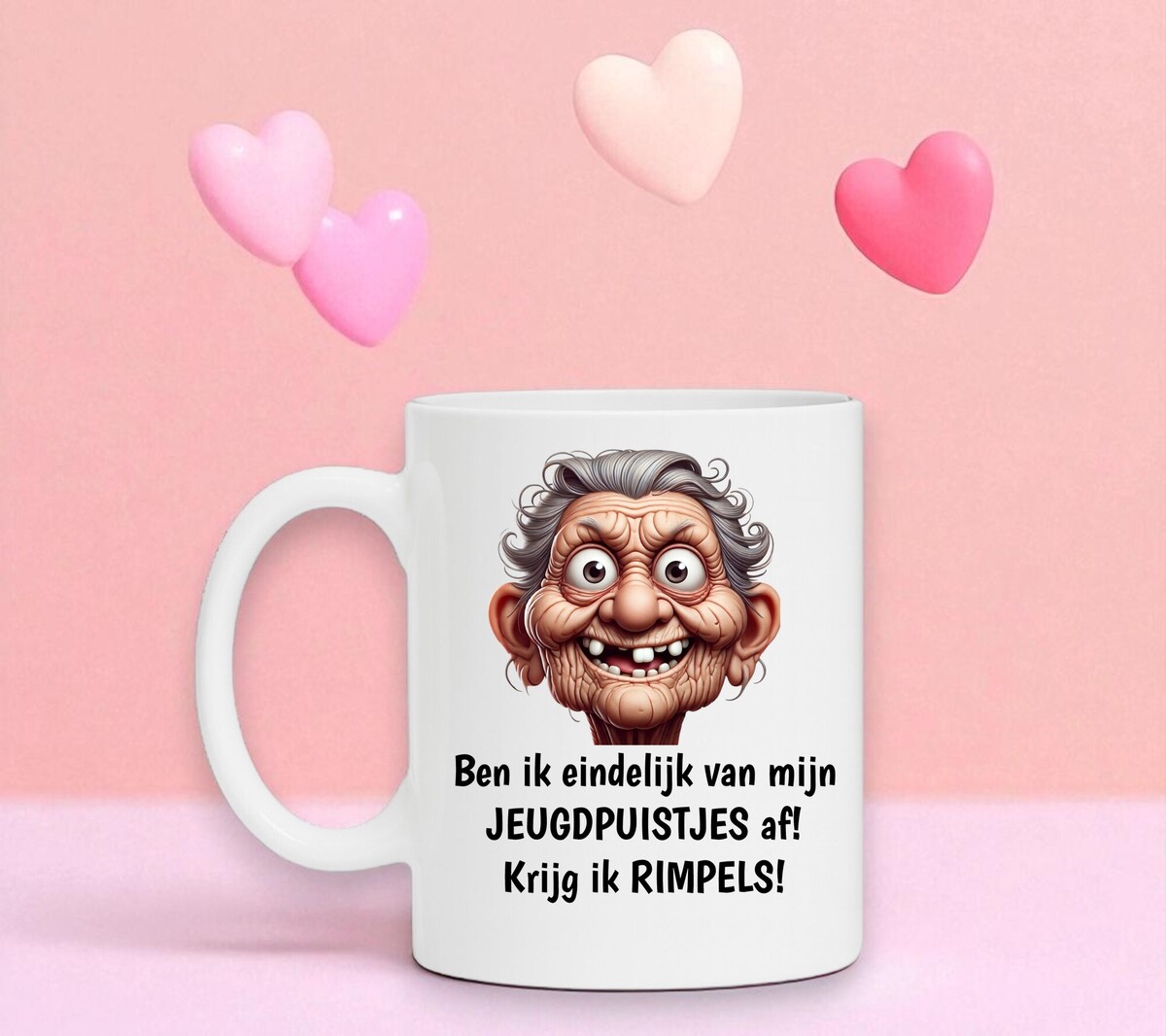 Op zoek naar een cadeau dat gegarandeerd een glimlach op het gezicht tovert? Deze hilarische mok met de tekst 'Ben ik eindelijk van mijn jeugdpuistjes af, krijg ik rimpels!' is het perfecte cadeau voor elke vrouw met een flinke dosis humor! Of ze nu haar ochtendkoffie of avondthee drinkt, deze mok herinnert haar eraan om het leven en het ouder worden met een knipoog te bekijken. Een ideaal verjaardagscadeau voor elke vrouw die haar humor hoog in het vaandel heeft staan – en die haar rimpels graag met een lach verwelkomt De mok is vaatwasserbestendig en heeft een hoogte van 96mm en een diameter van 80mm.