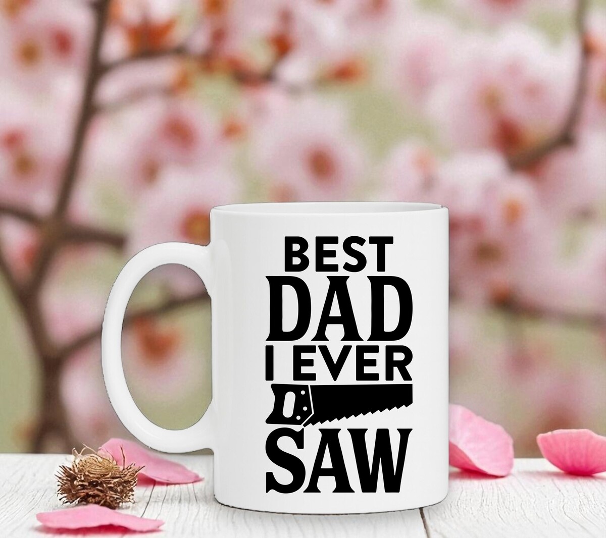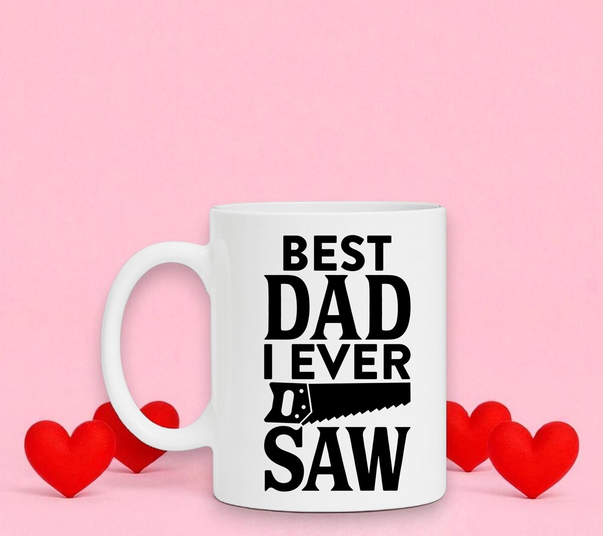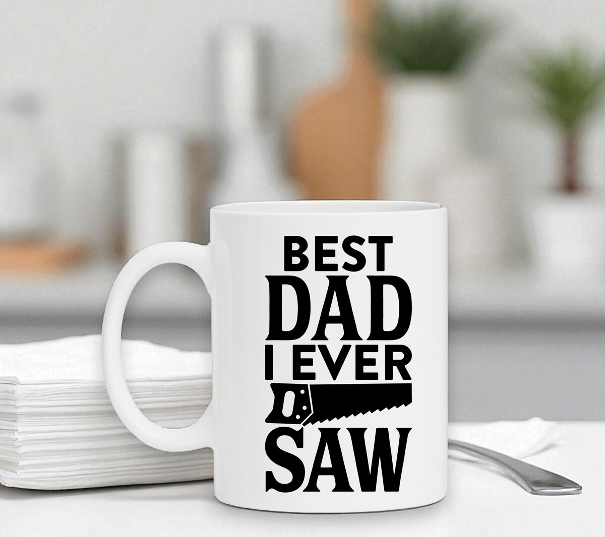 Superleuk Vaderdag koffiemok met opdruk 'Best dad i ever saw'. De mok is vaatwasserbestendig, microgolfbestendig en heeft een hoogte van 96mm en een diameter van 80mm.