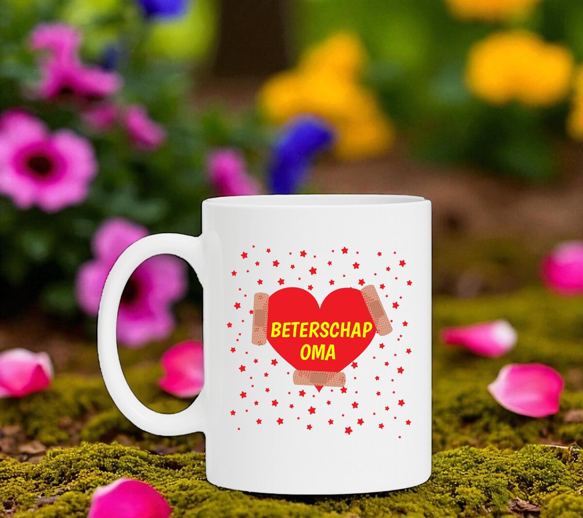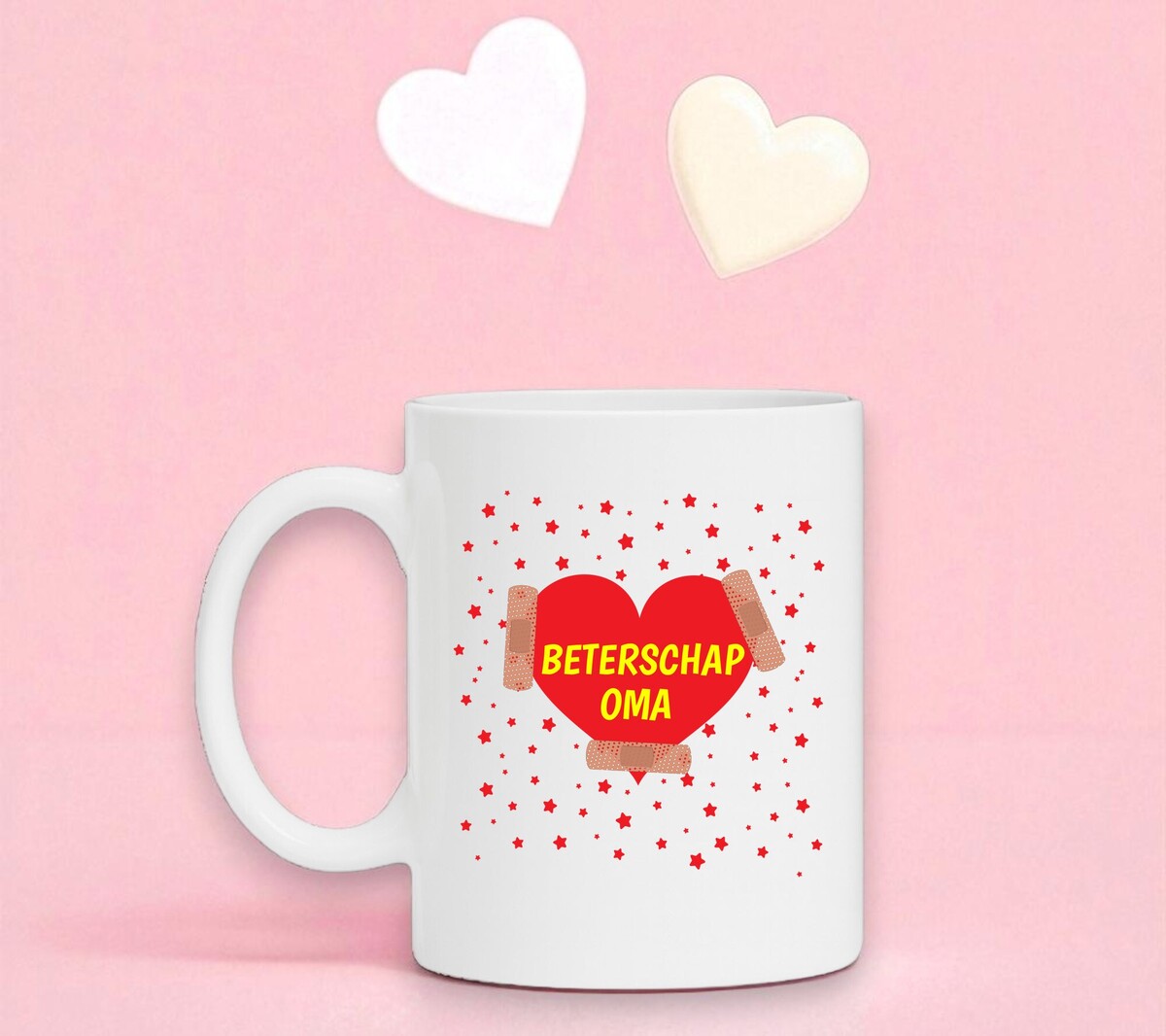 Een leuk verrassing voor je zieke oma is deze beterschap oma koffiemok! Op de koffiemok is een groot rood hart gedrukt die aan elkaar wordt gehouden met pleisters. In het grote rode hart staat met gele letters de tekst ‘Beterschap oma’. Om het grote rode hart staan allemaal rode sterren om de boel op te vrolijken!