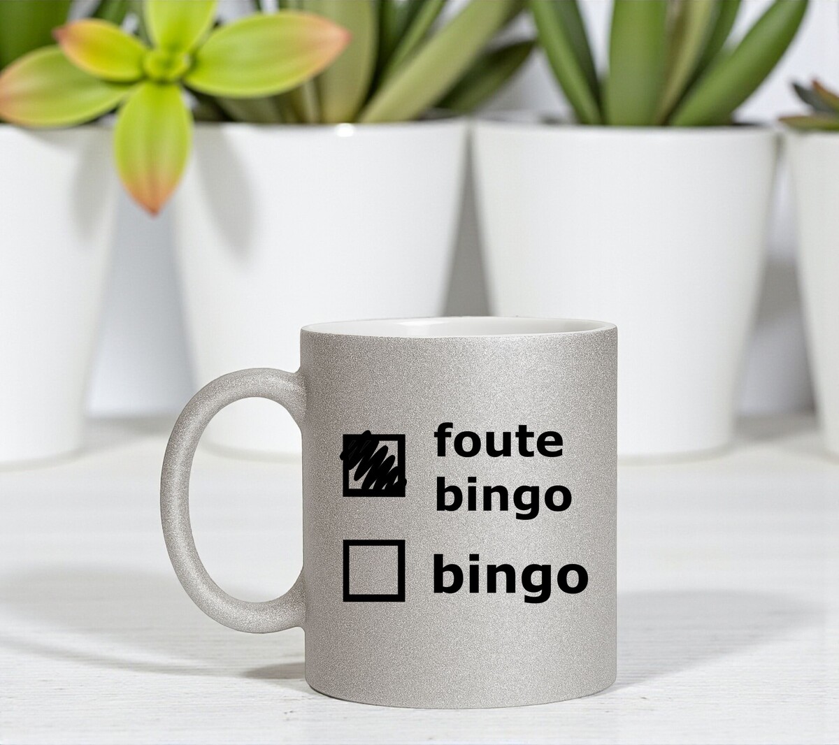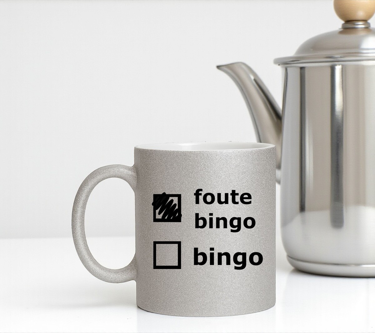 Ben jij klaar om je bingo-avond een tikkeltje fouter te maken? Maak kennis met de glitterende zilveren mok die net zo hard straalt als jij wanneer je “BINGO!” schreeuwt voordat de rest überhaupt hun kaart heeft kunnen checken.