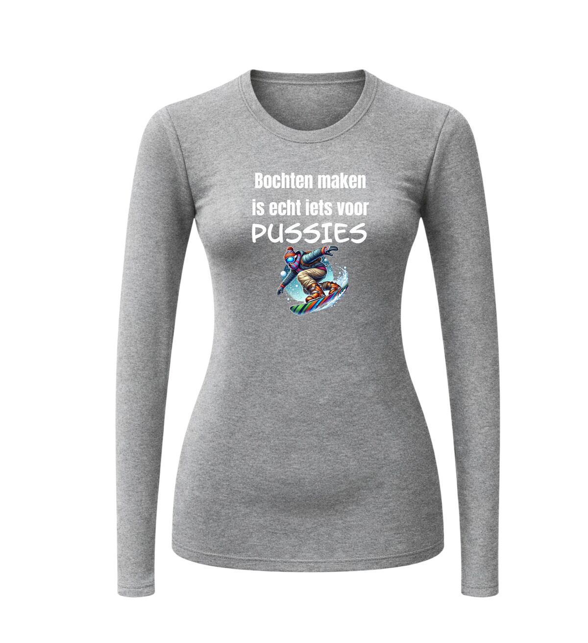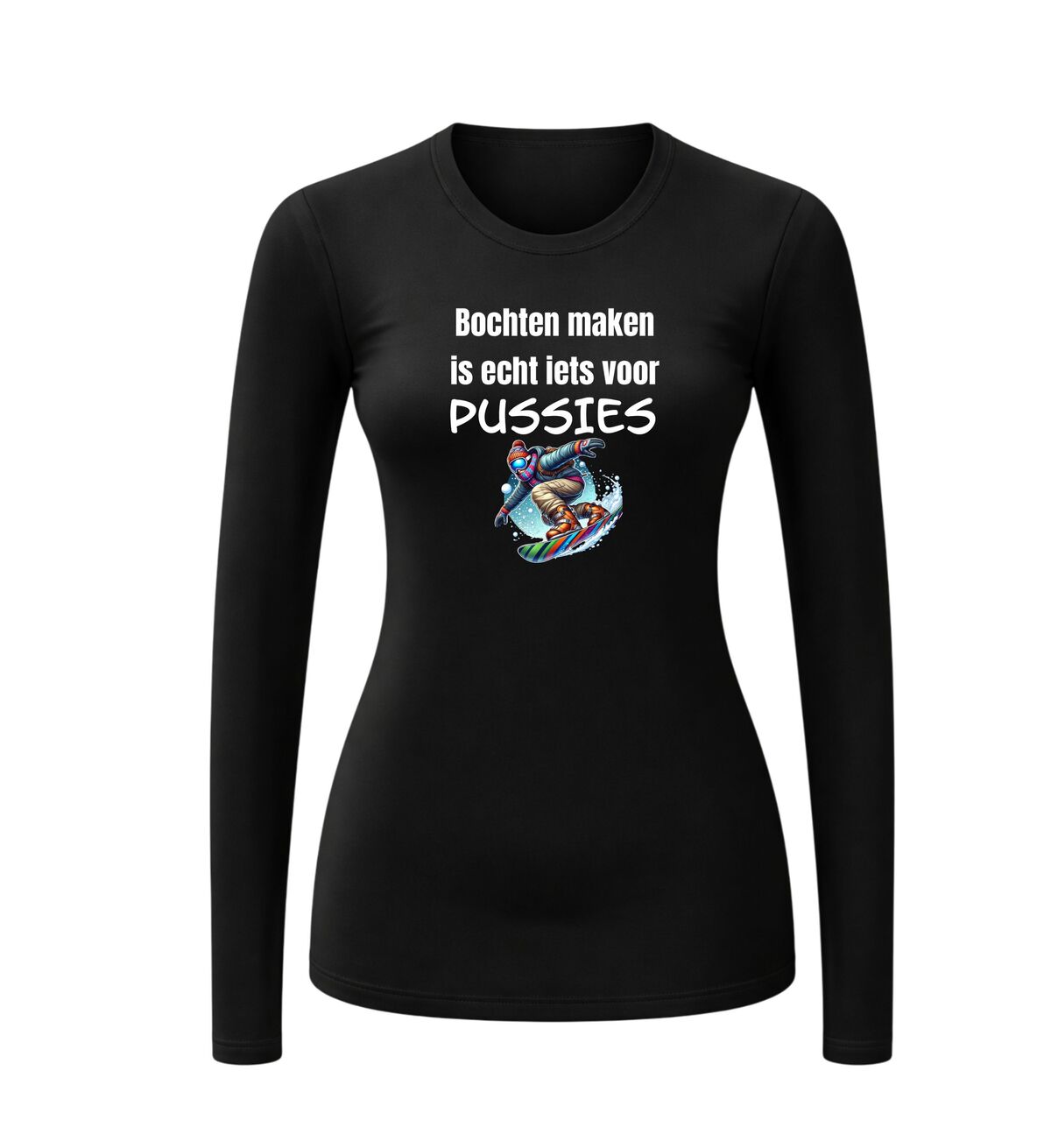 Dit t-shirt lange mouw is speciaal gemaakt voor de wintersportvakantie. Dit shirt met lange mouw, met de tekst: bochten maken is echt iets voor pussies dit zul je direct opvallen op de apre ski party.