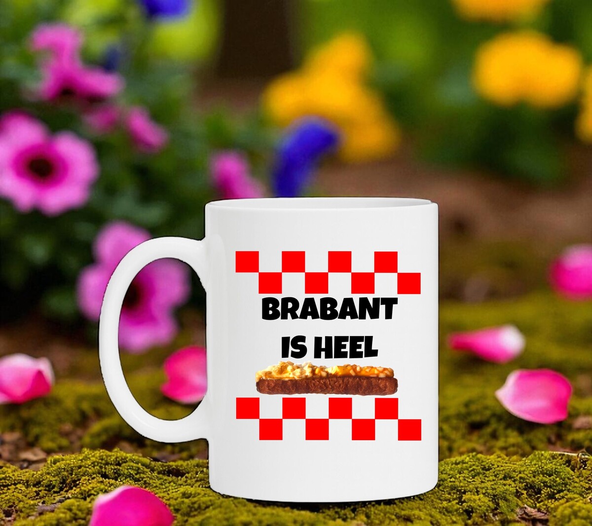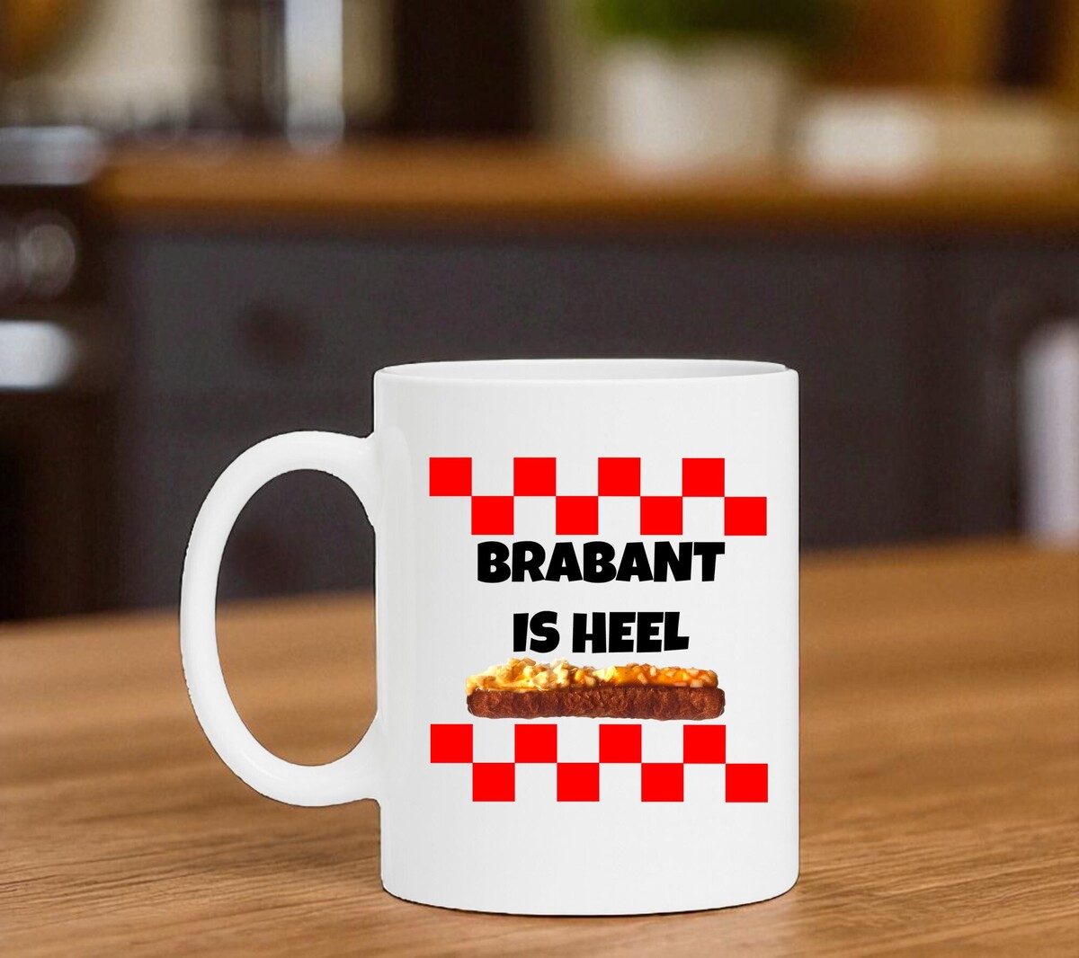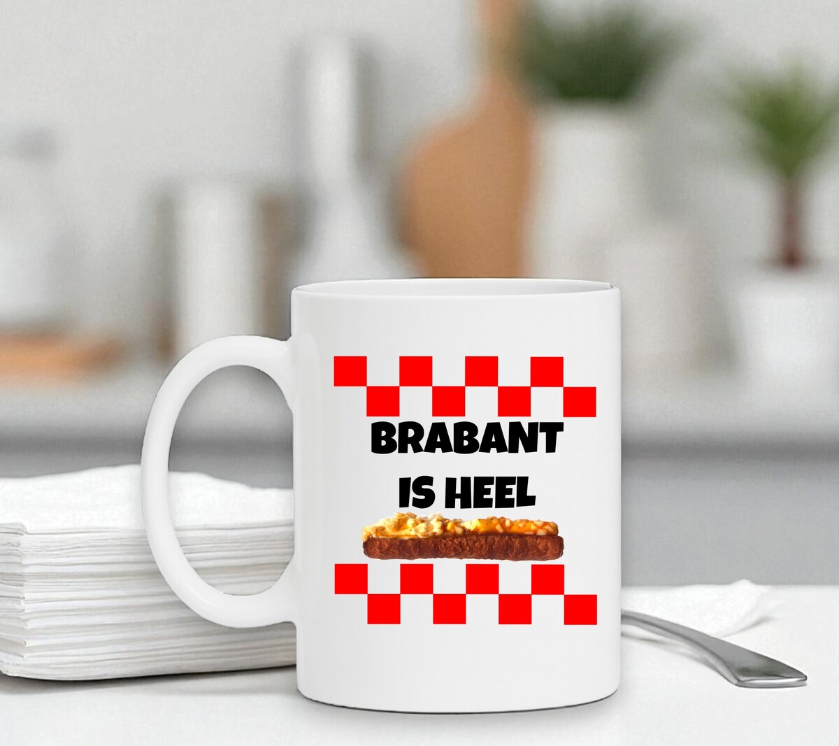 Een prachtige koffiemok als jij trots bent op Brabant. Op de koffiemok staat de tekst ‘Brabant is hee heel … ‘ Speciaal is uitgevoerd als een frikandel speciaal.
