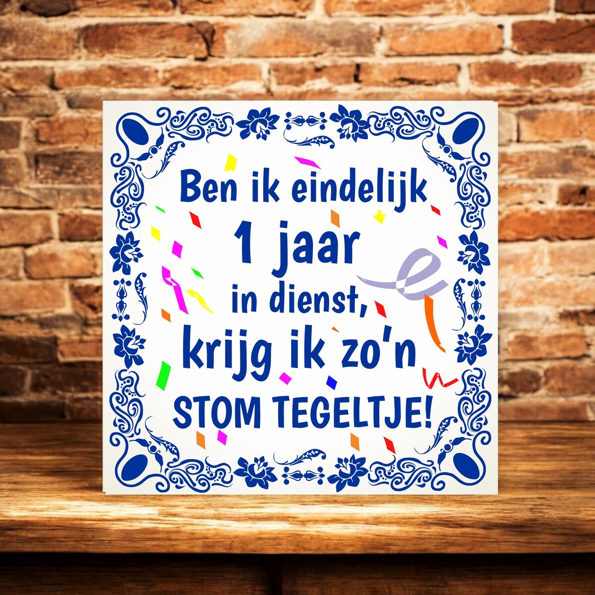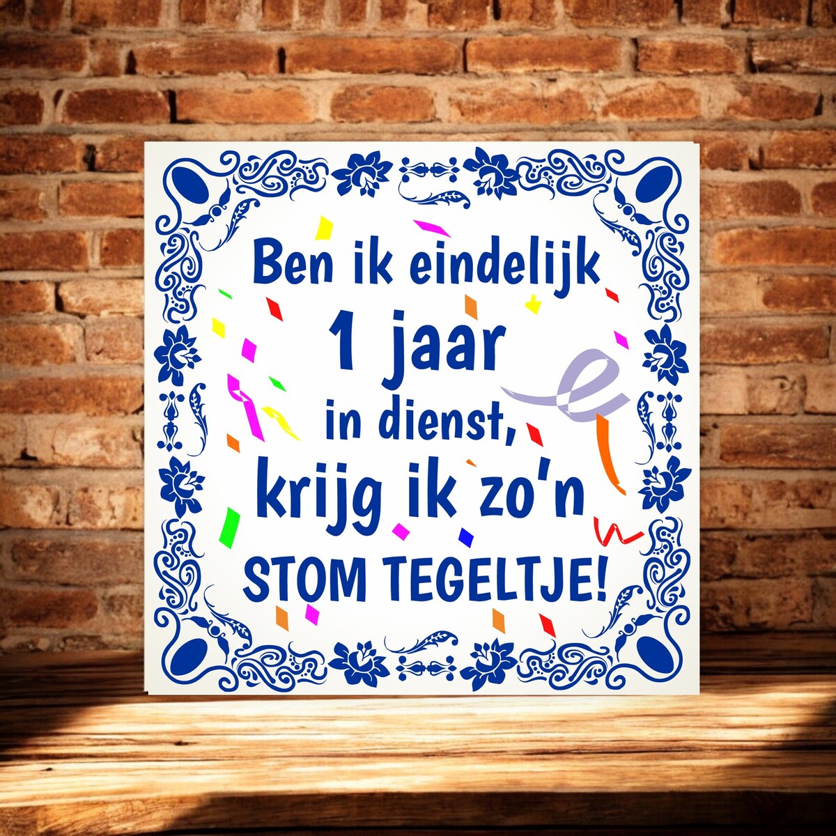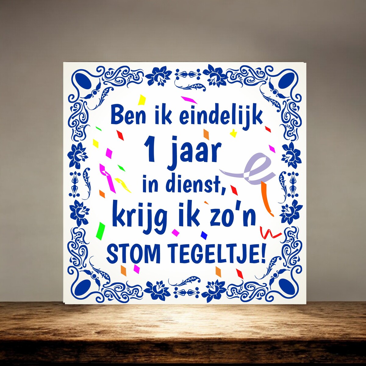 Op deze spreukentegel staat de humoristische tekst: Ben ik eindelijk 1 jaar in dienst ik zo'n stom tegeltje.