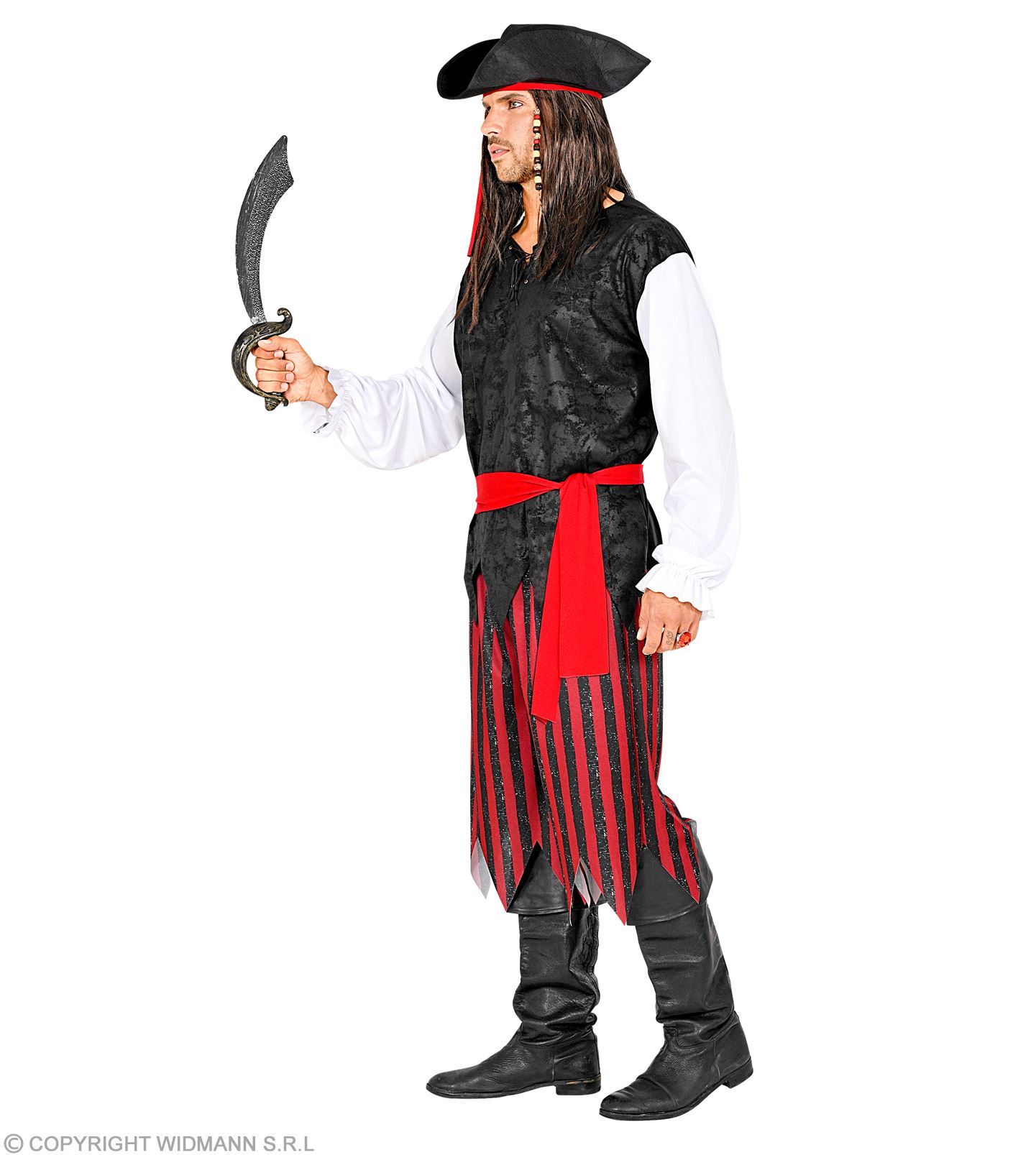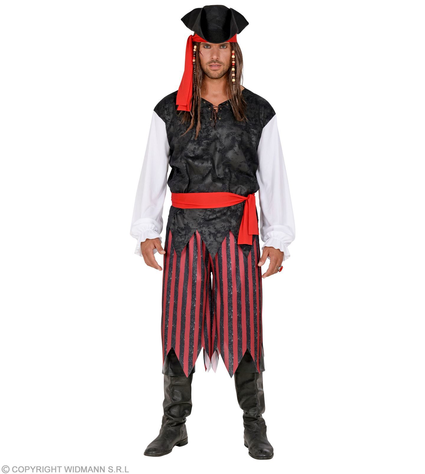 Caraïbische piraten kostuum heren volwassen. Bestaande uit: shirt met vest, broek, riem, hoofdband, hoed.