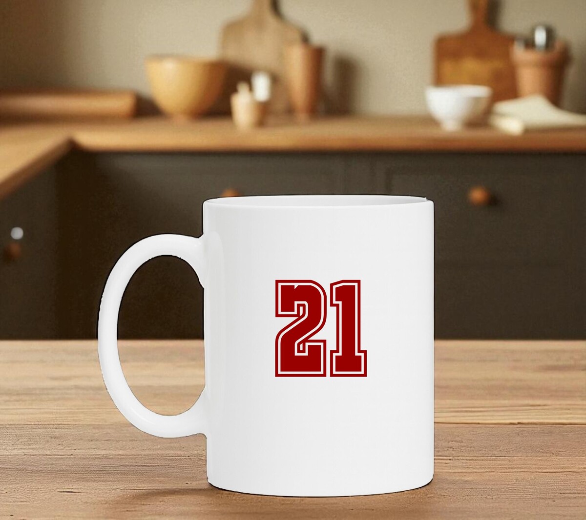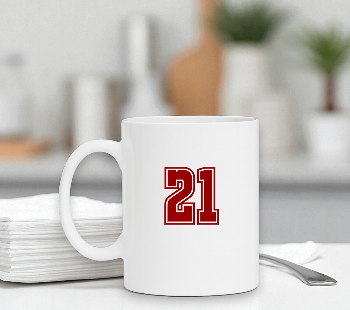Een witte koffiebeker met het getal 21 als opdruk. Hoogte mok 9cm.