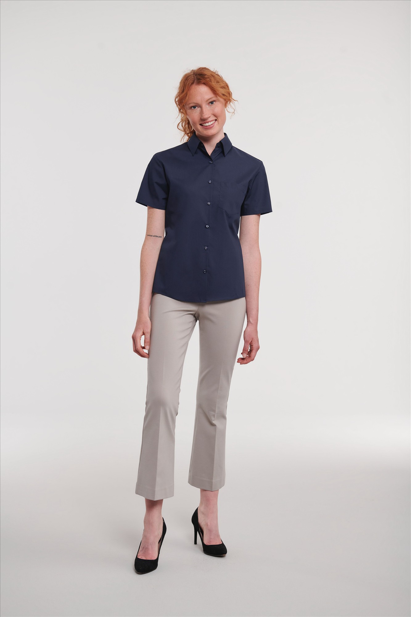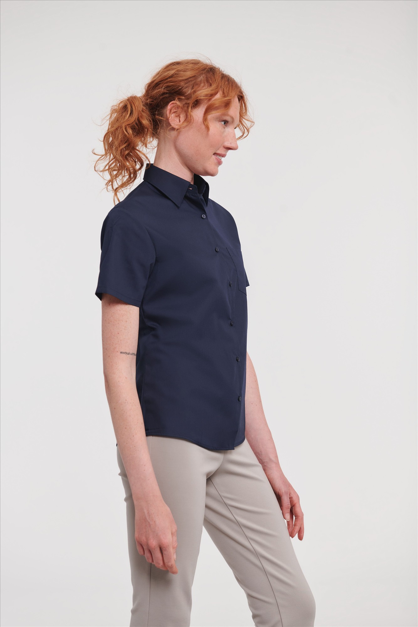 Dames blouse wit korte mouw te personaliseren met klassieke kraag en licht afgeronde onderzijde. Leuke moderne blouse met korte mouw en een borstzakje. Easy care en gaat t/m 4XL. Merk: Russell Ladies SS Clas. Polycotton Poplin Shirt. Materiaal:65% Polyester - 35% Cotton Poplin. Dikte: 110 g/m2. Land van herkomst:Bangladesh. De foto van het model dient ter illustratie van de sfeer. Gelieve geen aandacht te besteden aan de kleur.