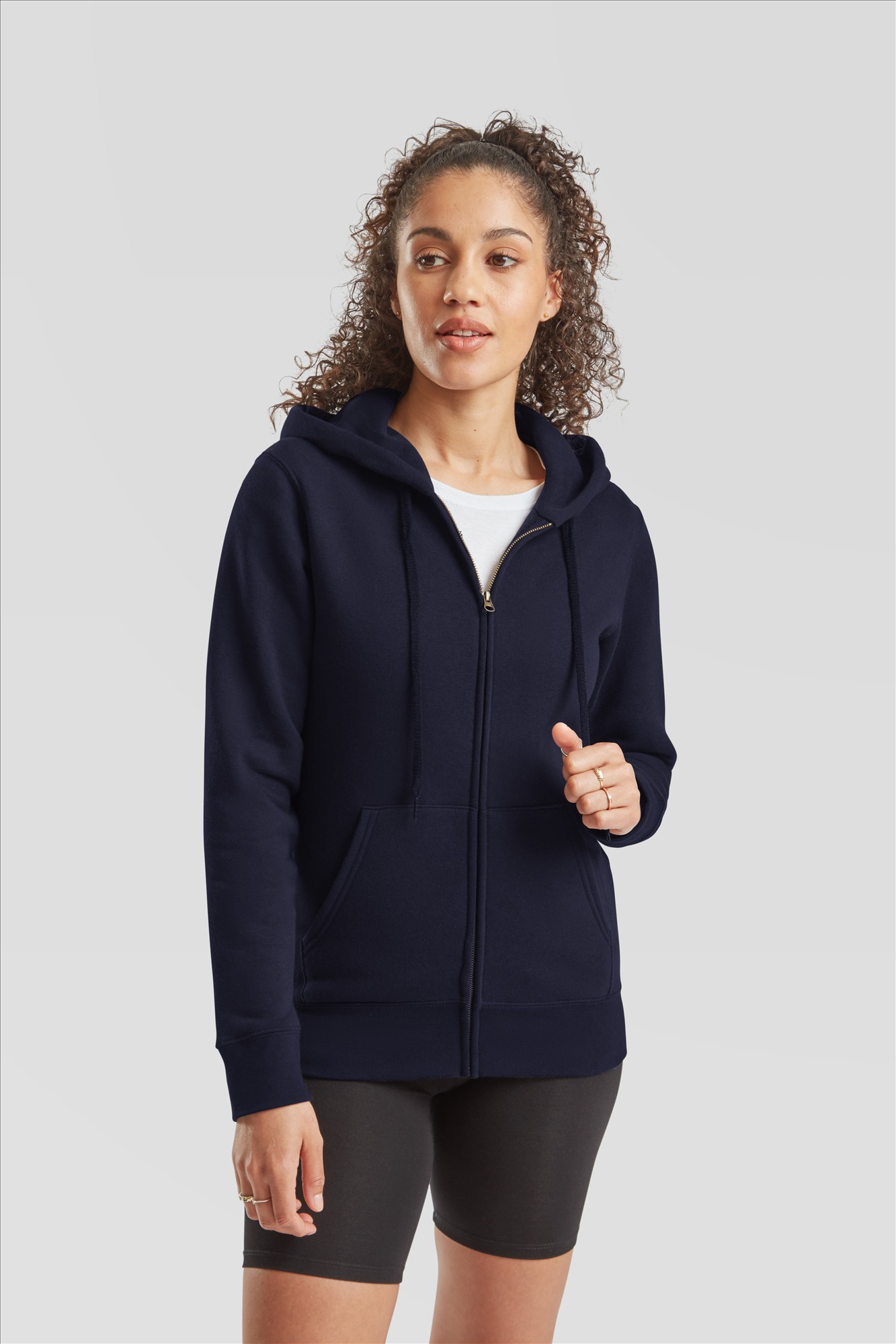 Dames sweat jacket / hoodie wit met gevoerde capuchon met dezelfde kleur plat trekkoord. Rib boorden van Cotton - Elastaan. 2 steekzakken. Bedekte metalen rits om beter te kunnen bedrukken. Single jersey verstevigingsband in de nek. Voorgevormde zijnaden voor een vrouwelijke pasvorm. Merk: Fruit of the Loom Lady-Fit Premium Hooded Sweat Jacket. Materiaal:Materiaal:70% katoen - 30% Polyester. Dikte:260 g/m2. Foto met model erop is een sfeer foto kleur buiten beschouwing houden. Land van herkomst: Egypte.