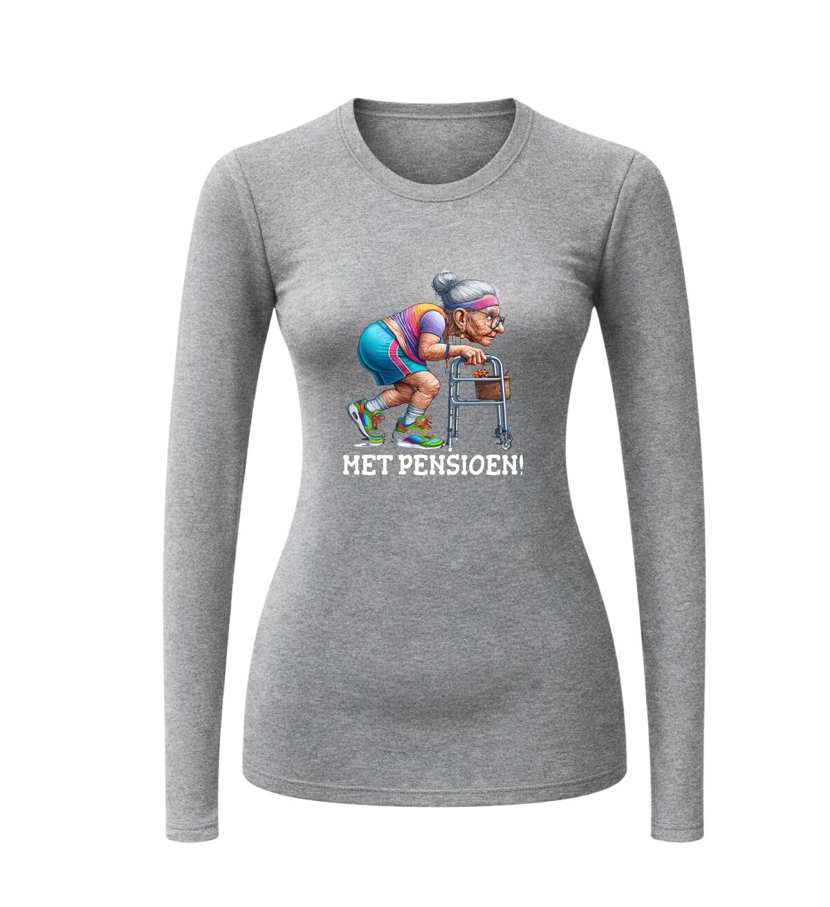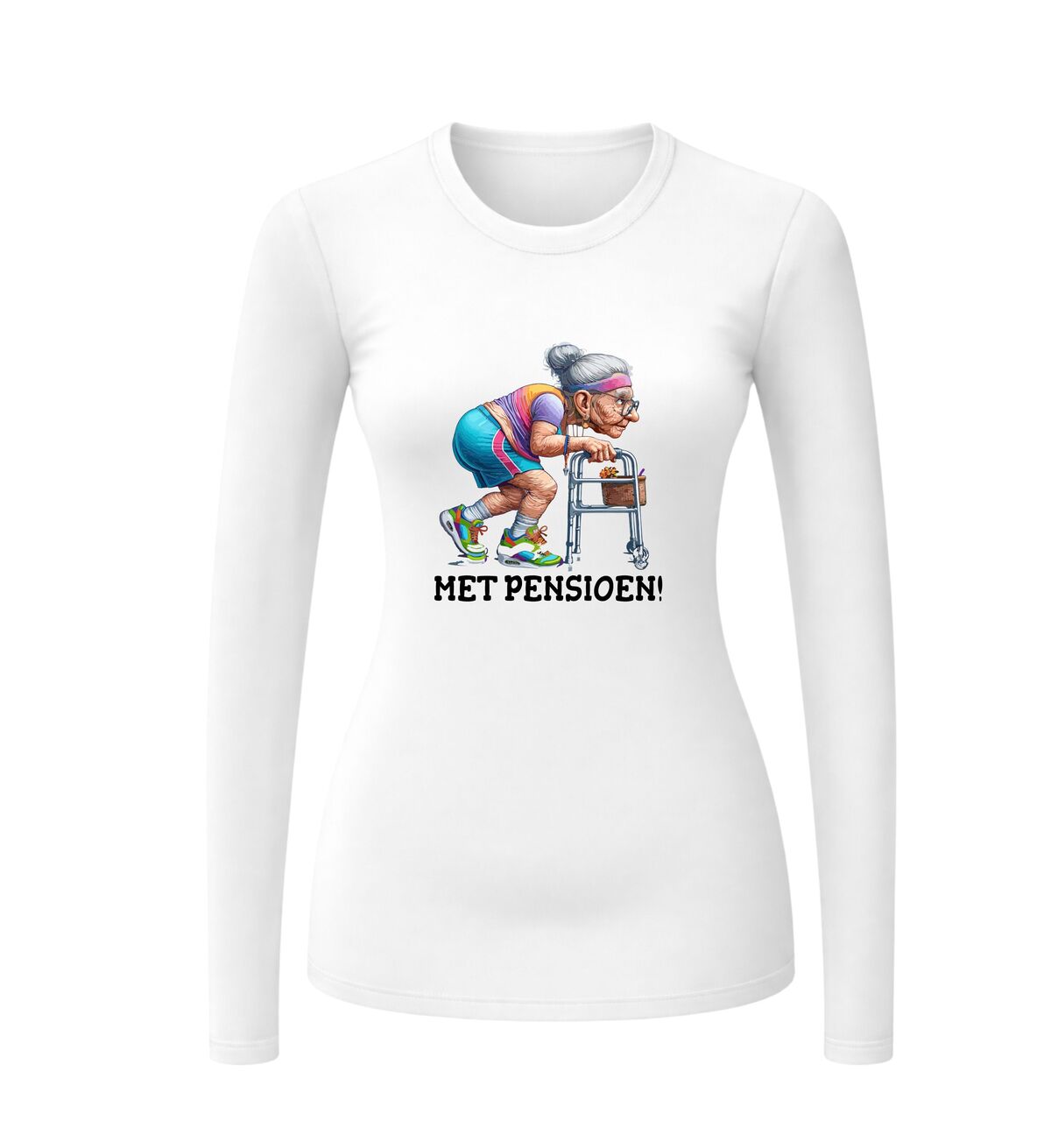 Deze dames longsleeve met de tekst Met Pensioen en een humoristische afbeelding van een oude dame achter een rollator is het perfecte kledingstuk om een nieuw hoofdstuk in stijl én met een knipoog te vieren. Pensioen betekent eindelijk tijd voor jezelf, geen wekker meer, geen vergaderingen en vooral doen waar je zin in hebt. Met deze longsleeve laat je aan iedereen zien dat het pensioen officieel is begonnen en dat jij er volop van geniet, het liefst met humor.