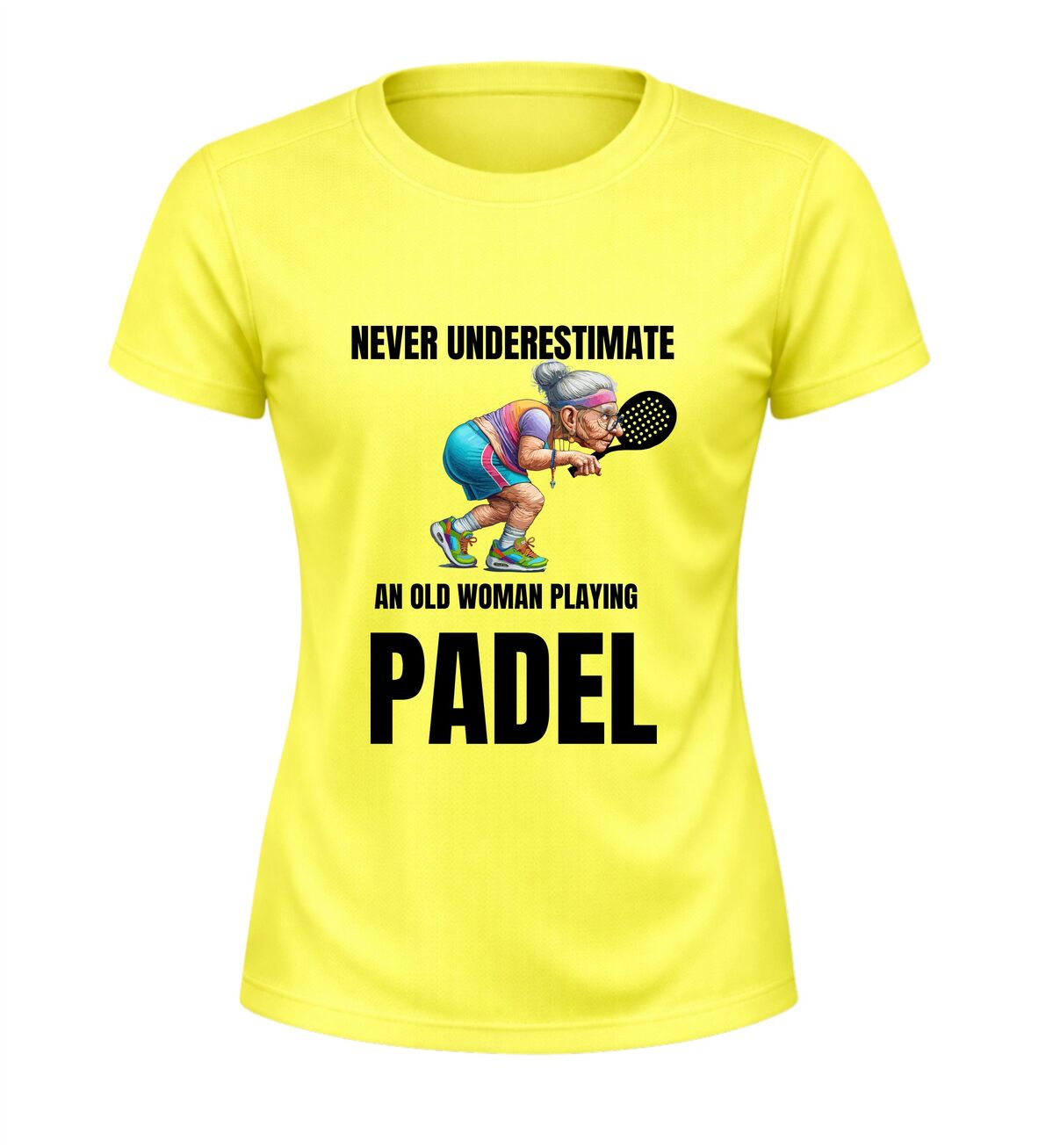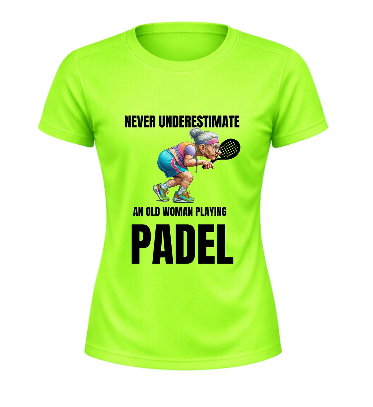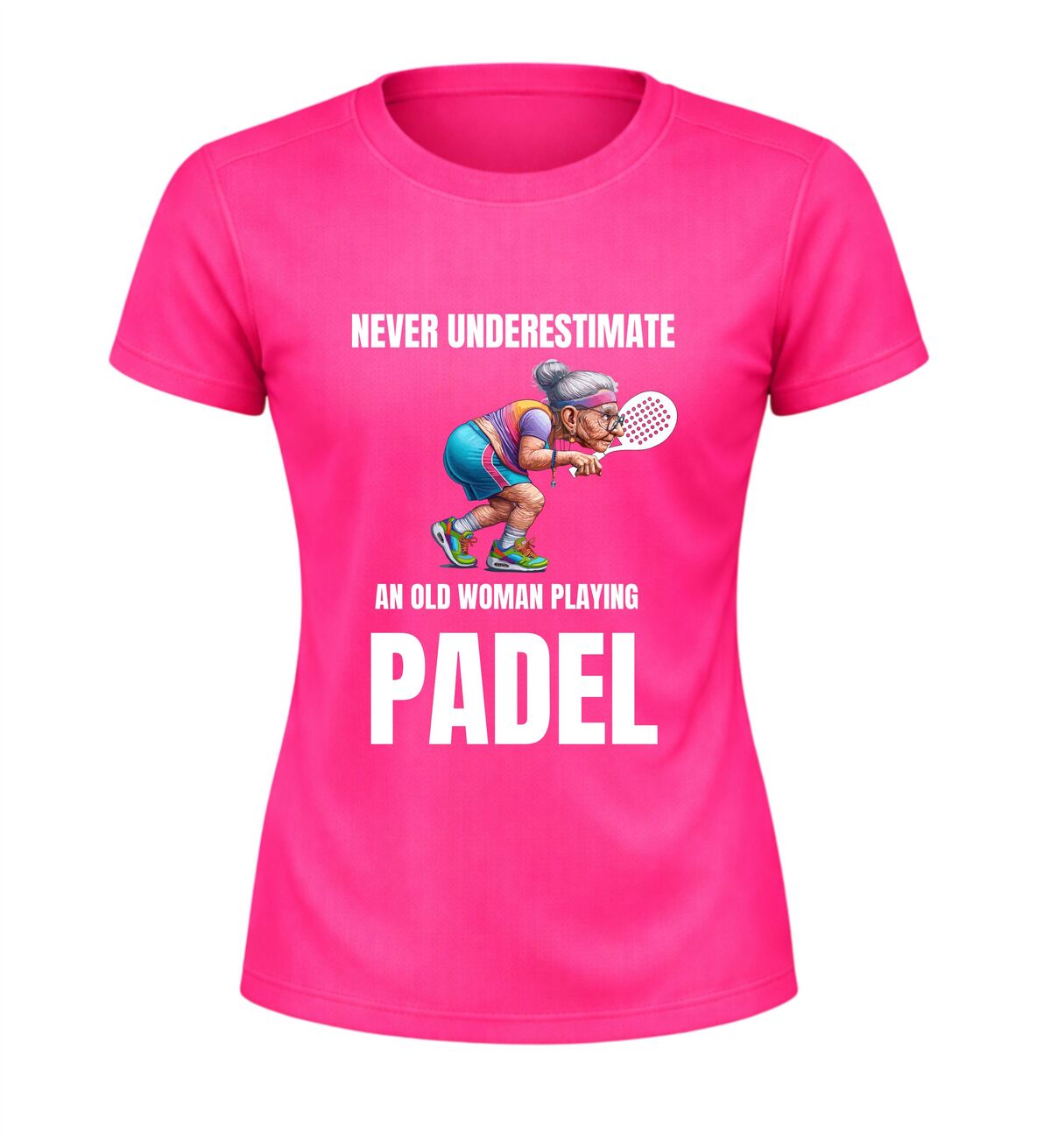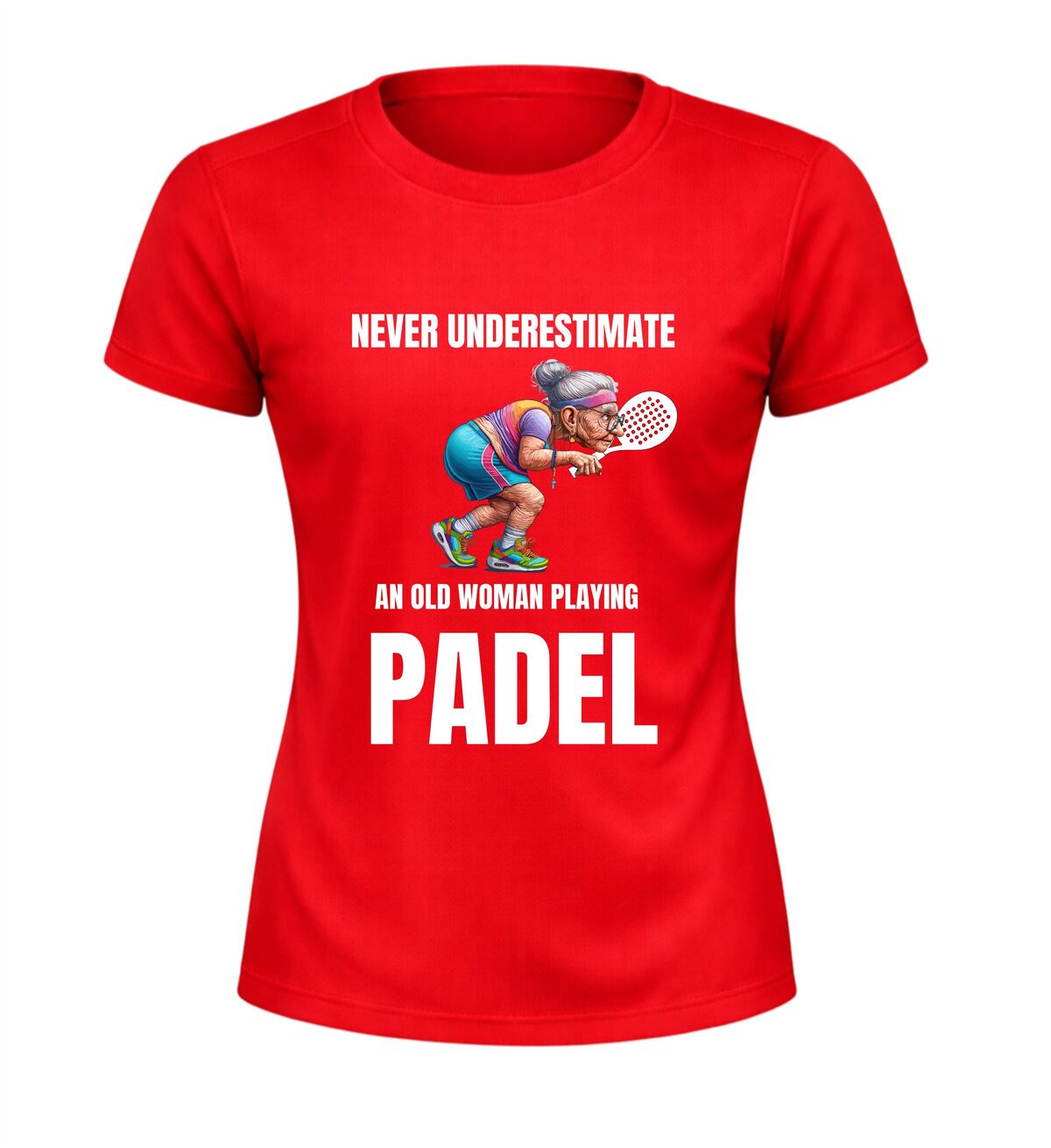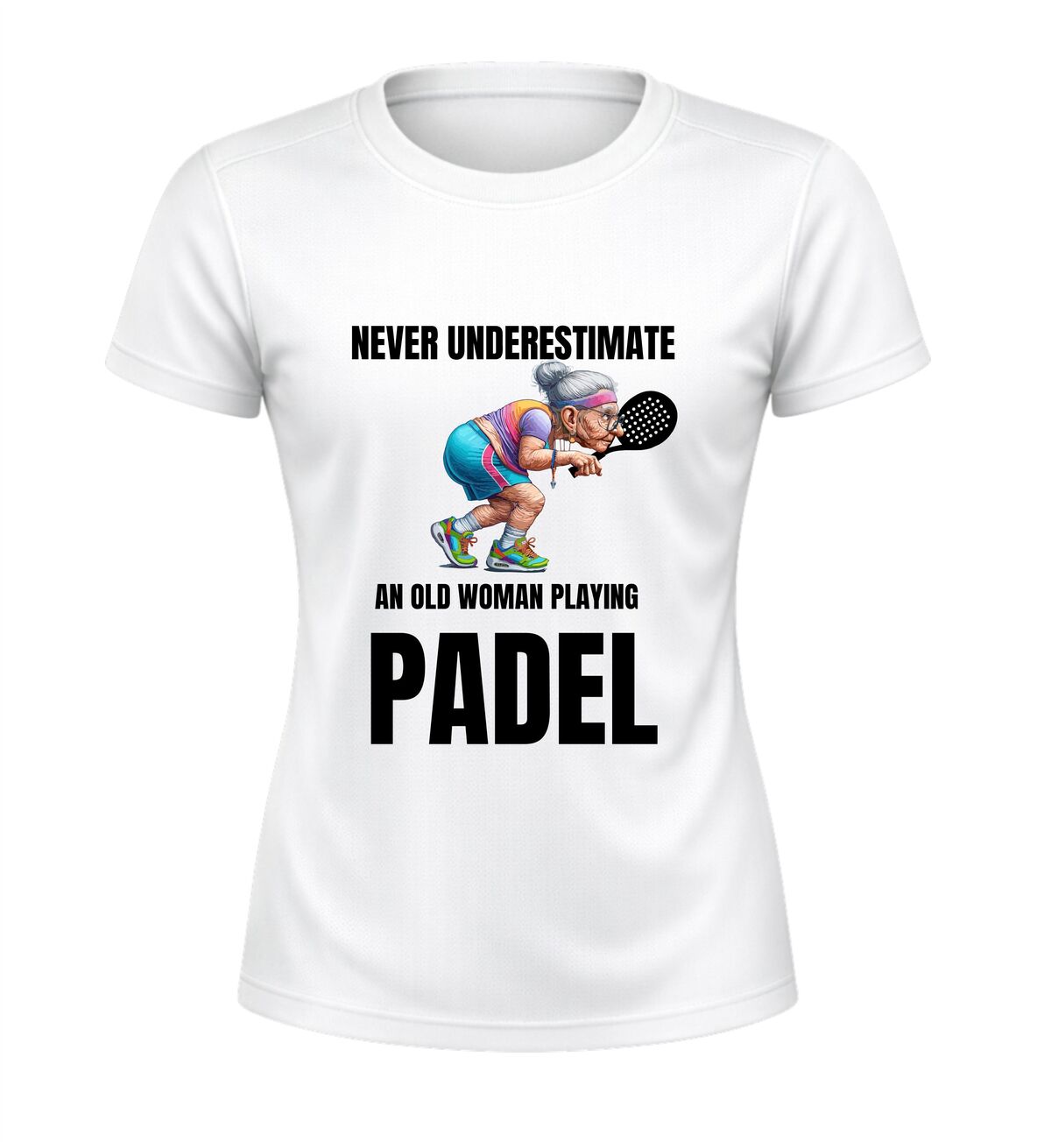 Dit sportshirt met de tekst never underestimate an old woman playing padel en een afbeelding van een oude dame met een padel racket is perfect voor fanatieke padel speelsters met gevoel voor humor. Het shirt is gemaakt van licht en ademend sportmateriaal en biedt een comfortabele pasvorm tijdens padel wedstrijden en trainingen. De opvallende tekst en afbeelding maken dit padel sportshirt ideaal als sportkleding of als grappig cadeau voor een vrouw die laat zien dat ervaring telt op de baan.