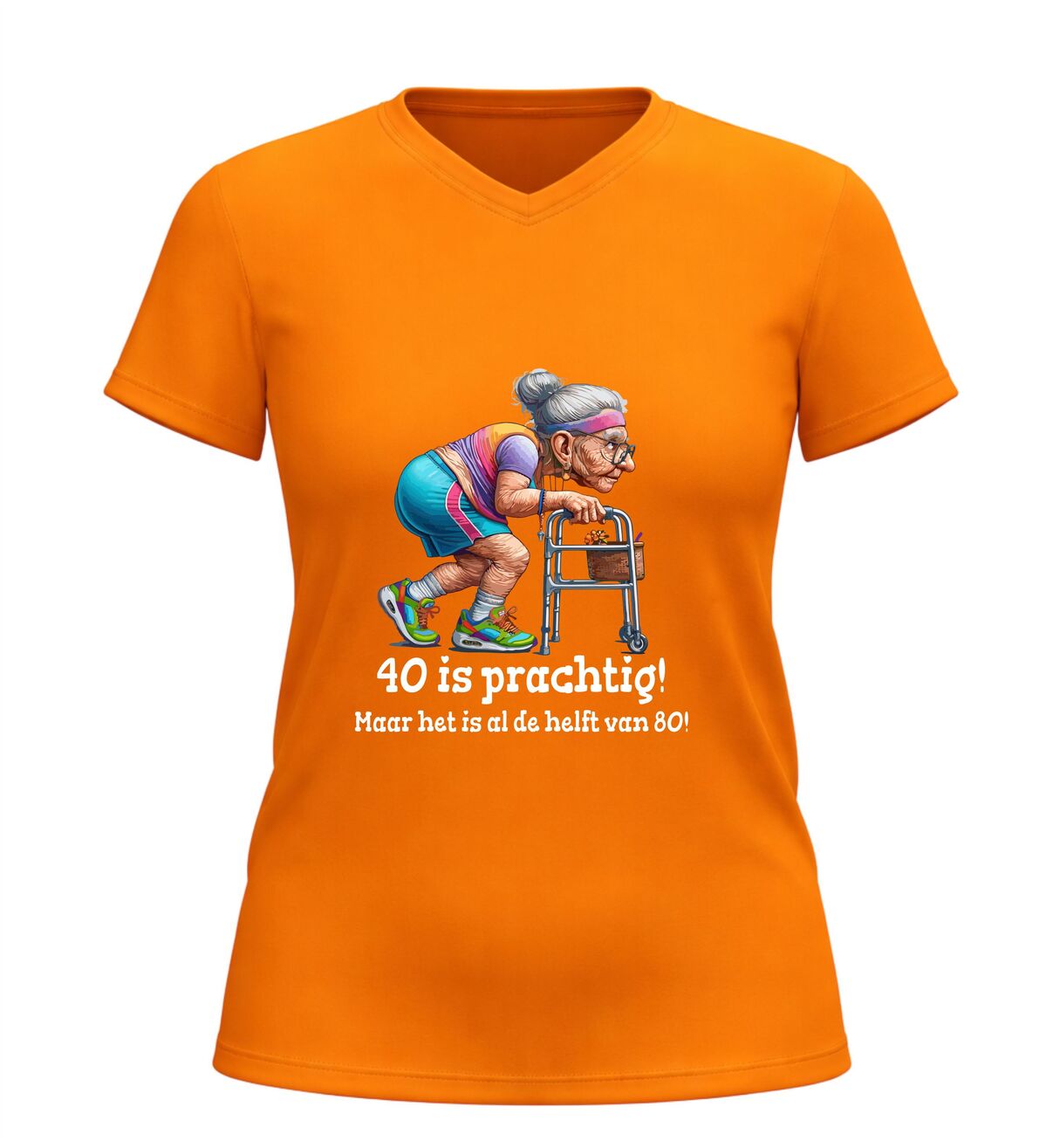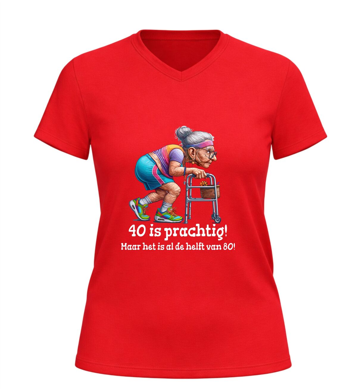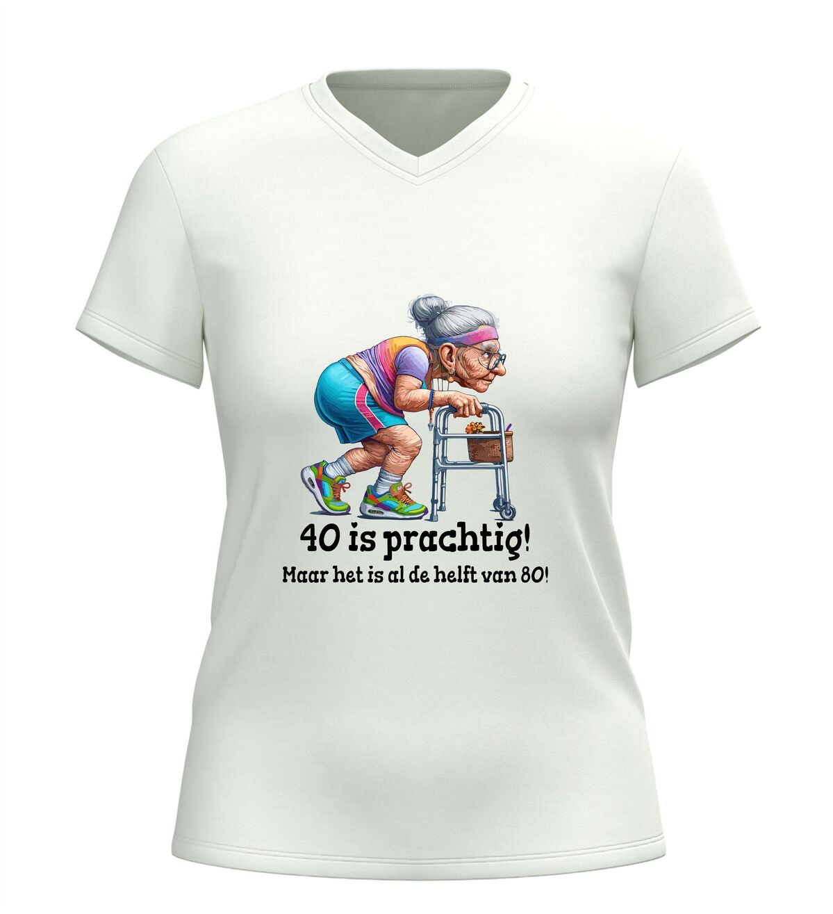 Dit dames shirt met de tekst 40 is prachtig, maar het is alweer de helft van 80 en de grappige afbeelding van een oude dame met rollator is het perfecte verjaardag shirt voor een 40e verjaardag vol humor. De speelse en herkenbare opdruk zorgt direct voor een lach en maakt dit shirt ideaal om te dragen tijdens een verjaardagsfeest, etentje of gezellige borrel. Dankzij de comfortabele pasvorm is dit verjaardag shirt prettig om de hele dag te dragen, terwijl de ludieke print laat zien dat veertig worden ook met een flinke dosis zelfspot gevierd mag worden. Dit dames verjaardag shirt is bovendien een origineel cadeau voor vrouwen die 40 worden en houden van een grapje. Met dit 40 jaar verjaardag shirt combineer je humor, comfort en feestelijke uitstraling in één opvallend kledingstuk.