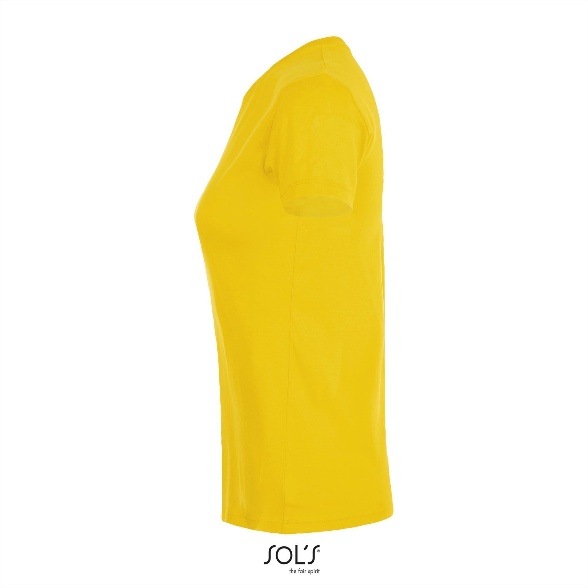 Een lekker zittend T-shirt dames met ronde hals in een mooie gele kleur. Materiaal: 100% Semi-Combed Ringspun katoen. Merk: Sol's Regent Women. Dikte 150 g/m2.