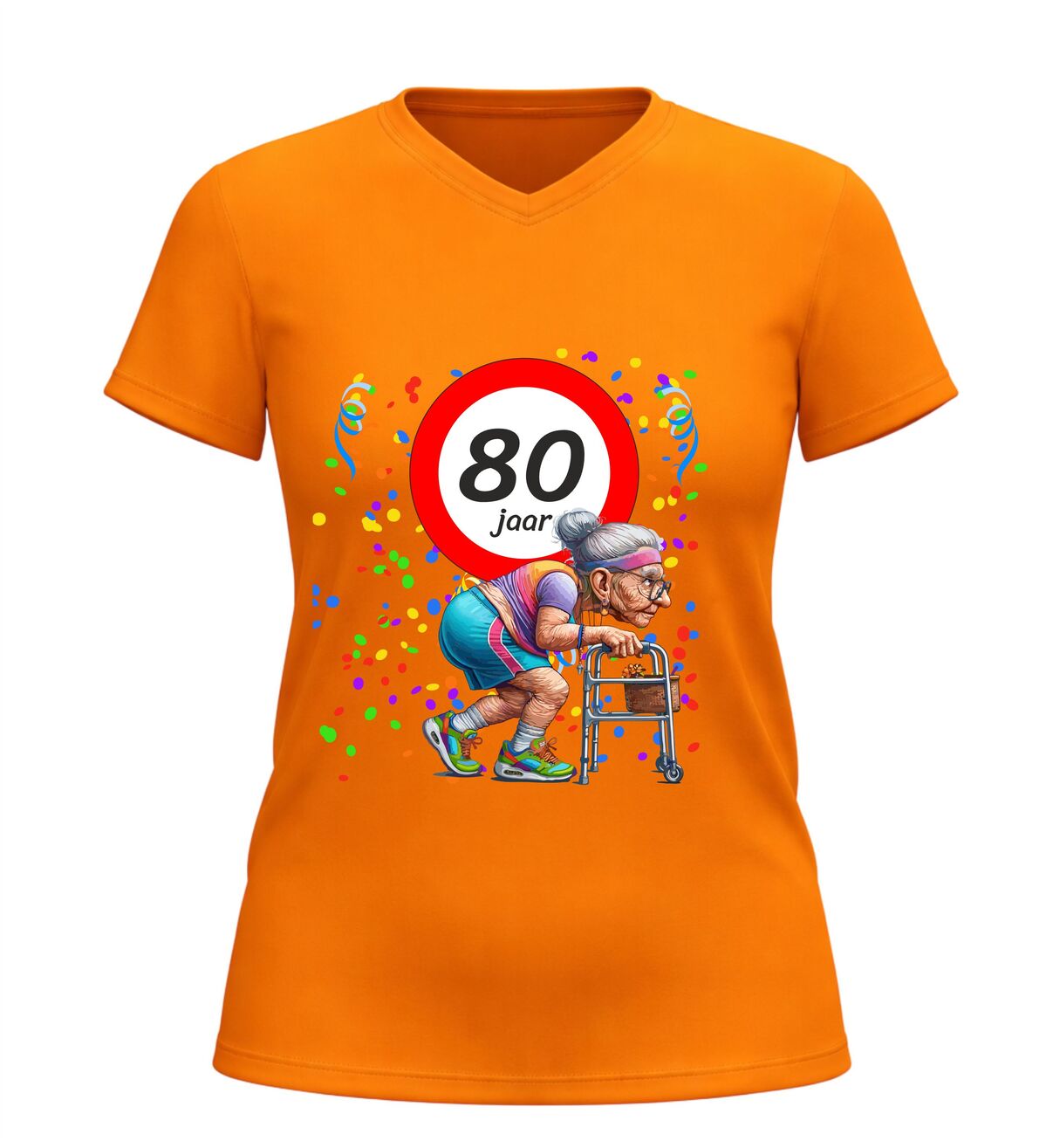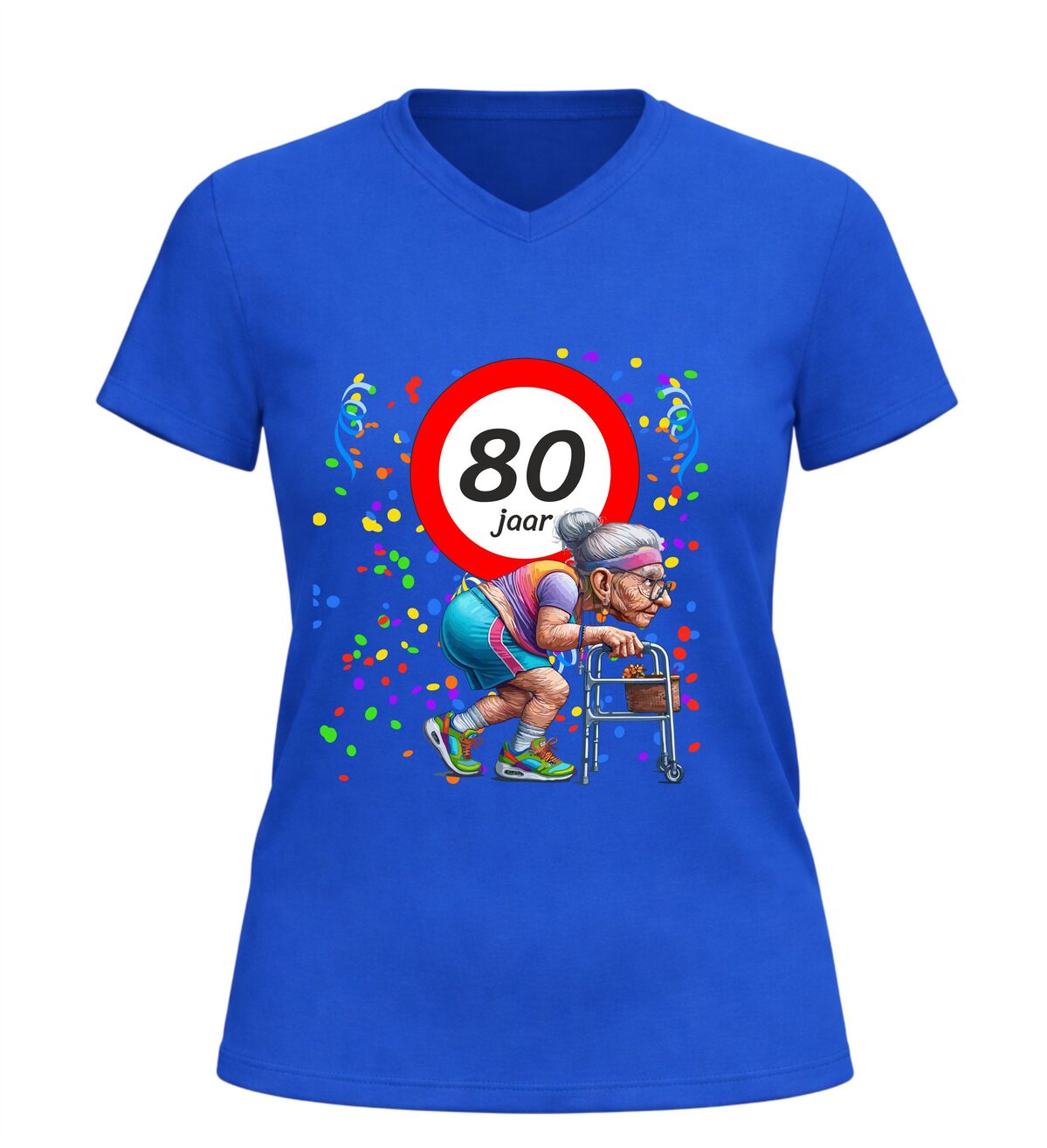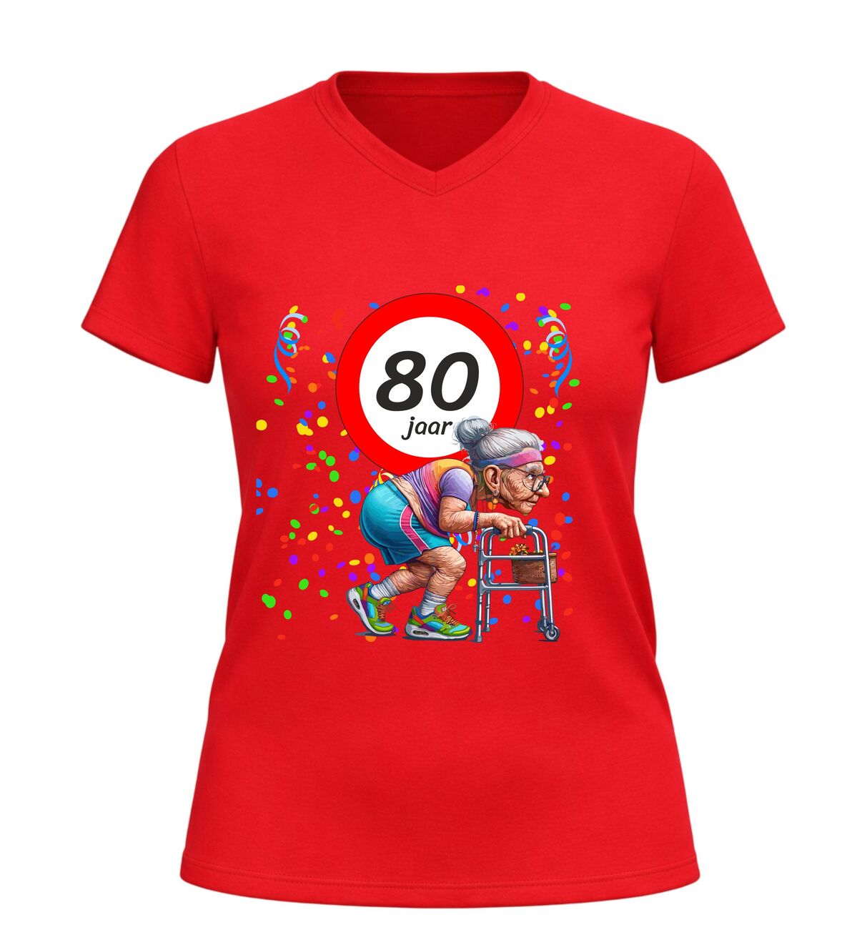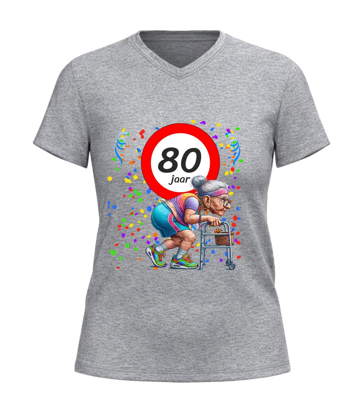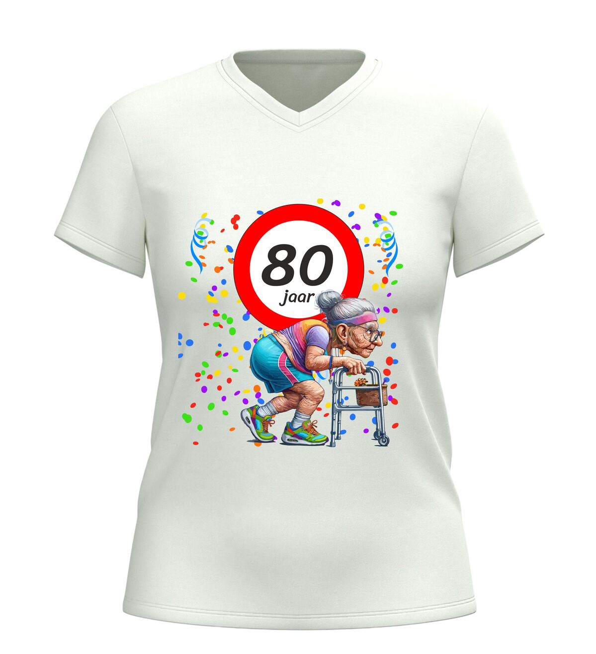 Tachtig jaar en nog steeds het stralende middelpunt van het feest. Dit dames V-hals shirt met de leeftijd 80 jaar en een grappige afbeelding van een oude dame achter haar rollator bewijst dat ouder worden vooral draait om humor en zelfspot. Want wie 80 wordt, mag dat vieren met een grote glimlach en een flinke knipoog.