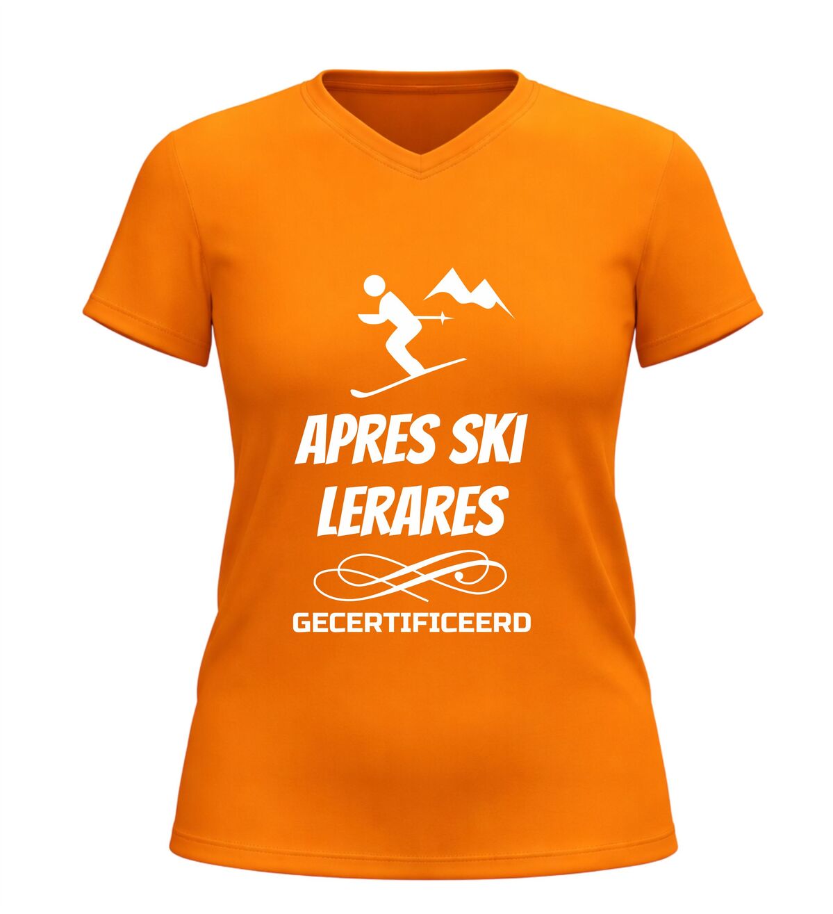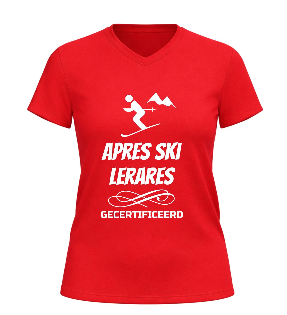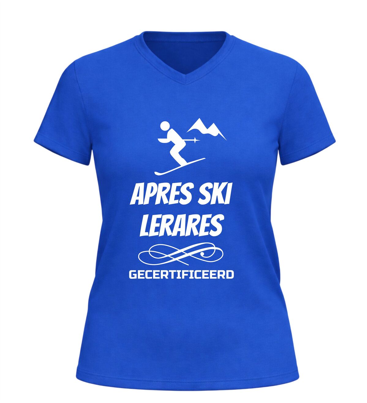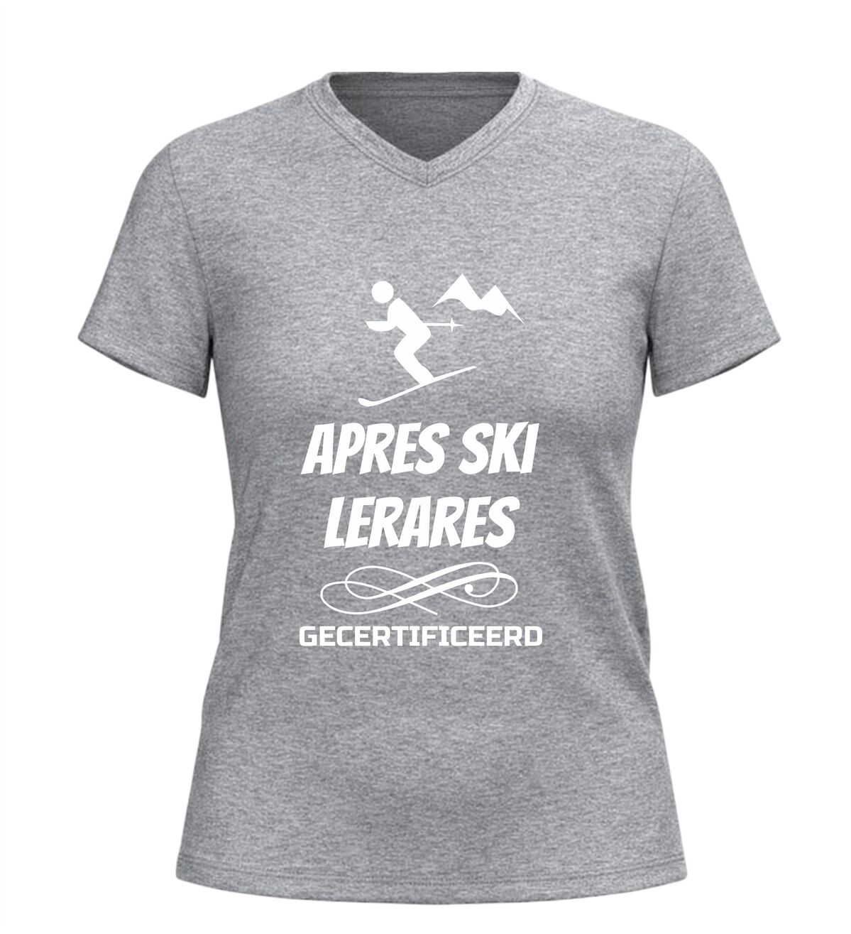 Voor iedereen die de après-ski minstens zo serieus neemt als het skiën zelf is dit dames v-hals shirt après Ski Lerares een absolute must-have. De humoristische tekst après Ski lerares met daaronder gecertificeerd maakt meteen duidelijk dat jij precies weet hoe een geslaagde wintersportdag moet worden afgesloten.