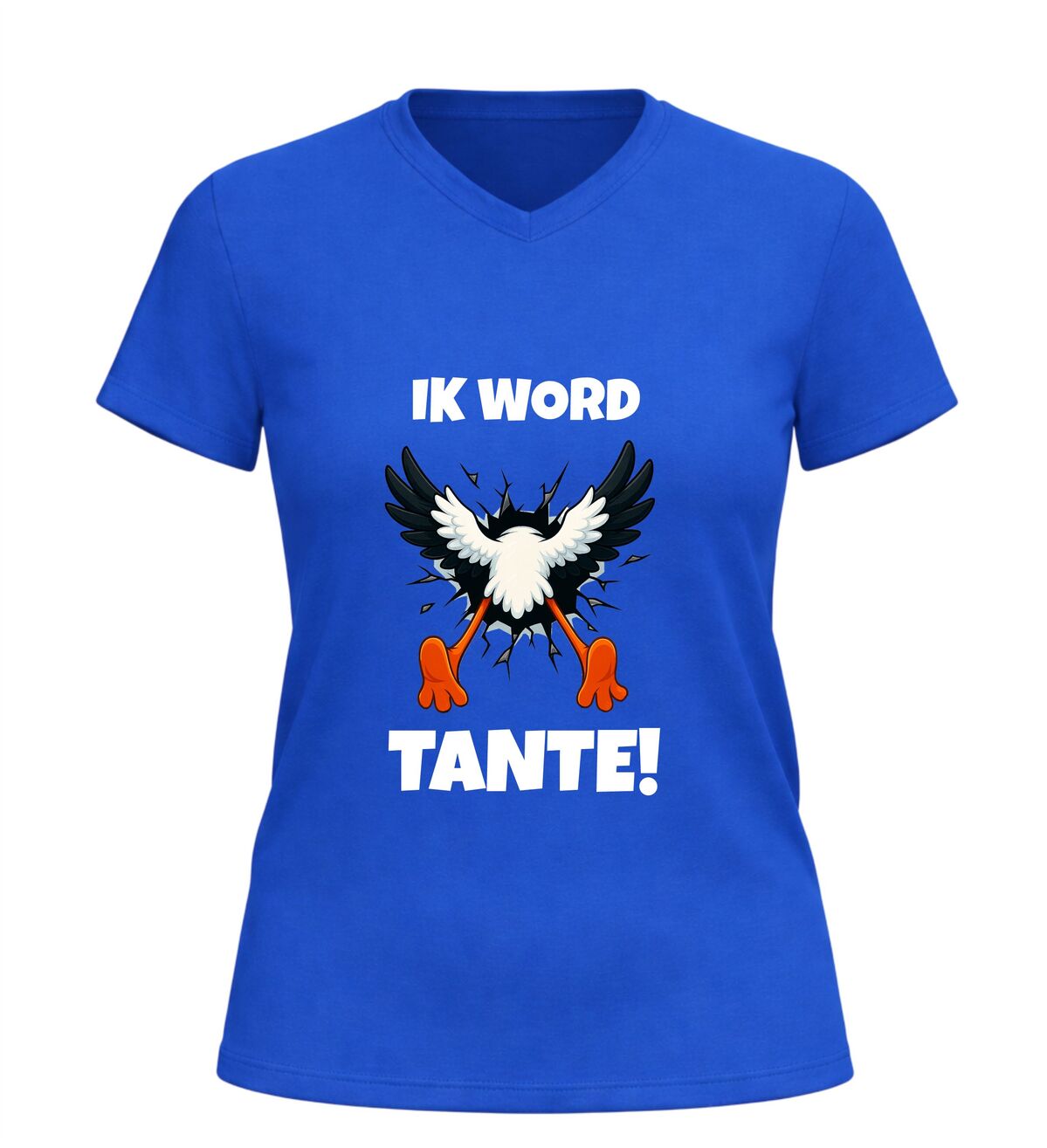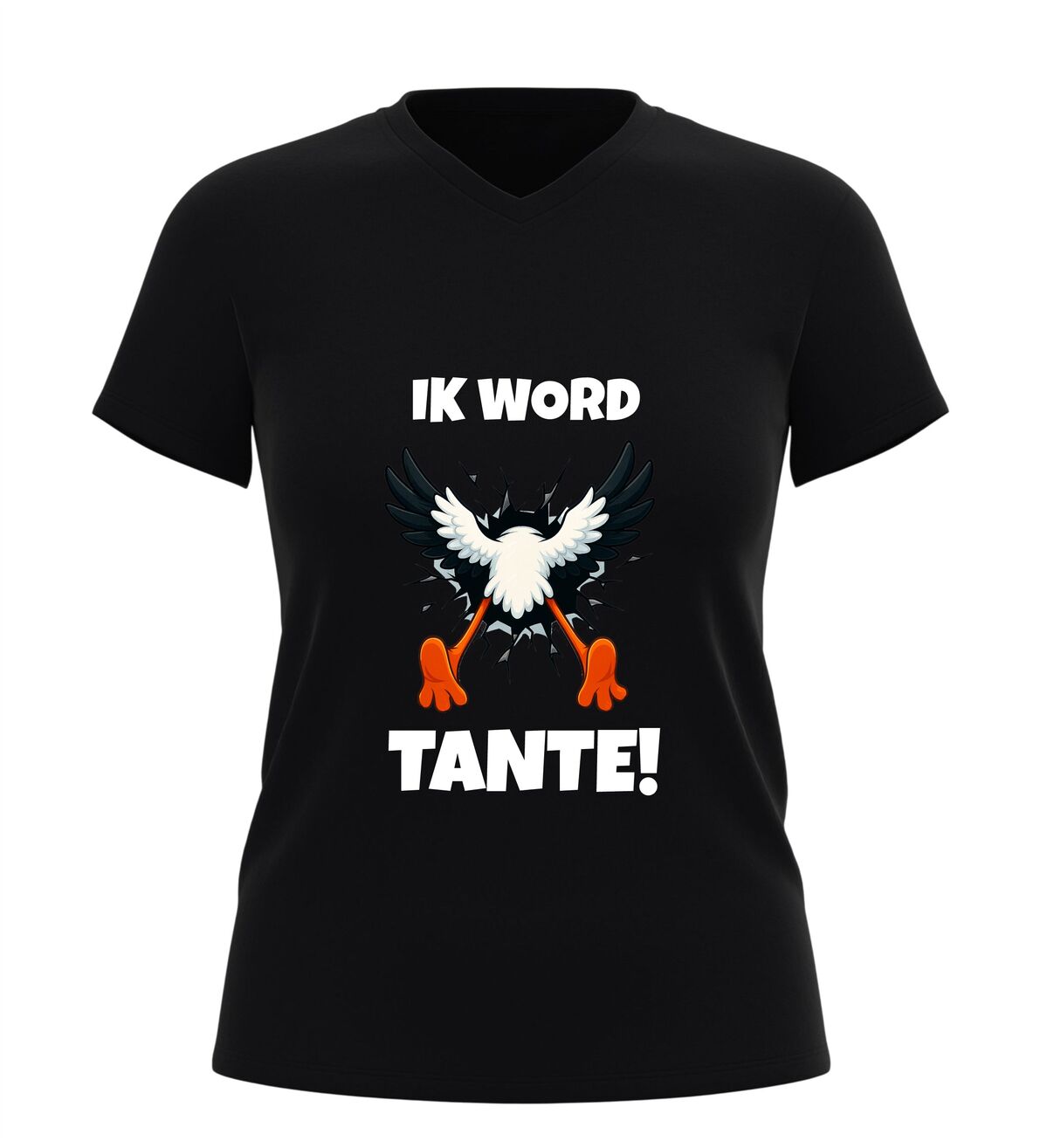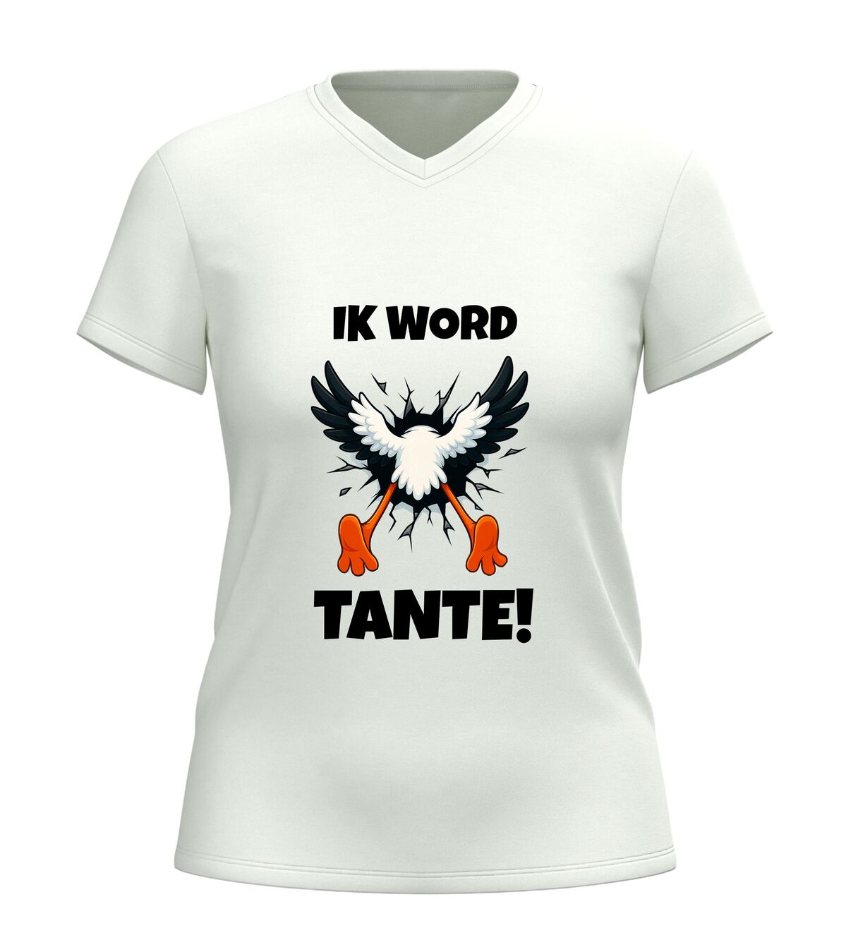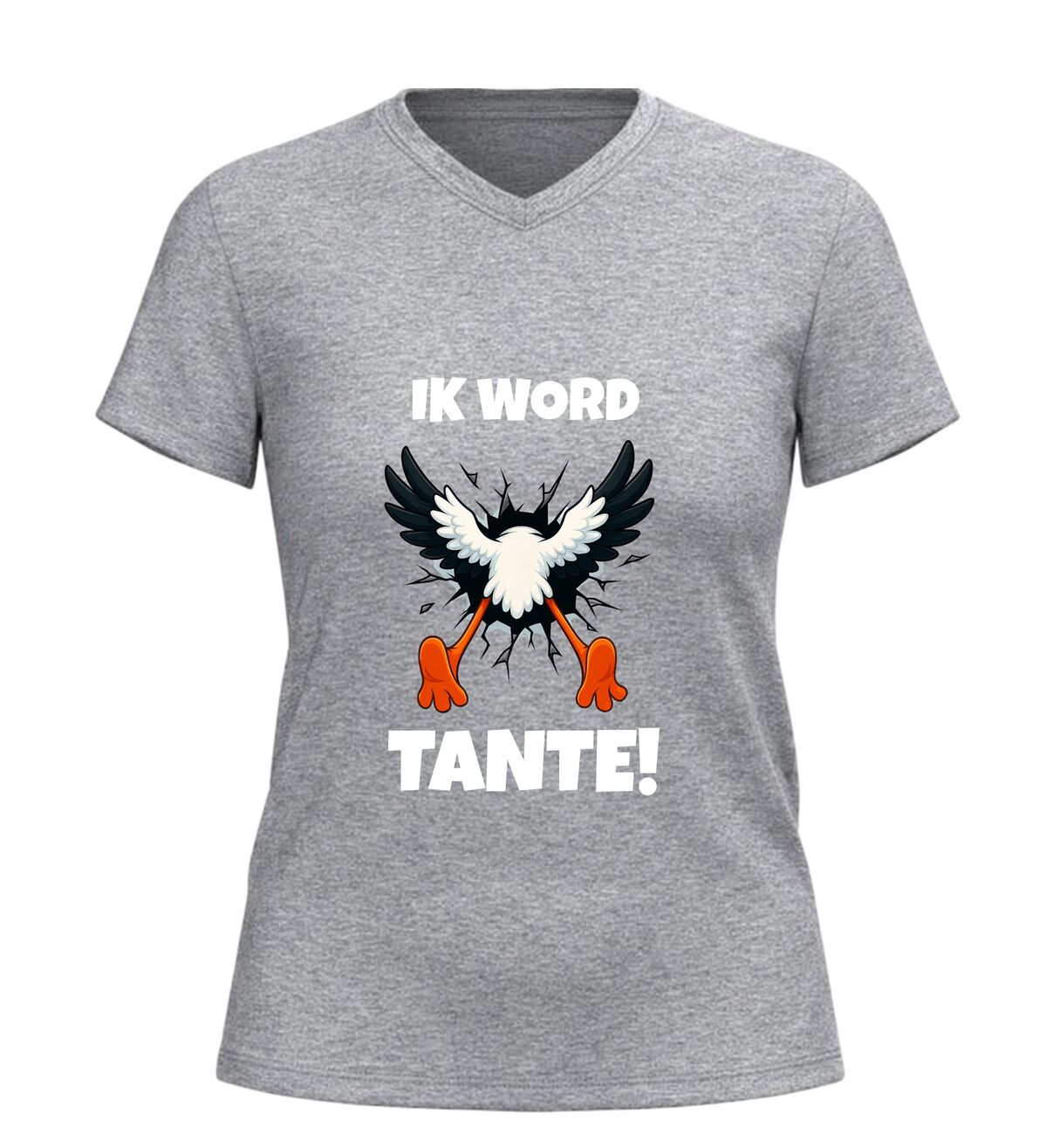 Dit dames v-hals t-shirt met de tekst ik word tante is een vrolijke en humoristische manier om groot nieuws te delen. De speelse afbeelding van een ooievaar die in het shirt is gevlogen zorgt voor een feestelijk en hilarisch effect dat direct de aandacht trekt. Dit grappige aankondigingsshirt is perfect om een zwangerschap bekend te maken tijdens een etentje, feestje of familiebezoek en zorgt gegarandeerd voor verraste en lachende reacties. Dankzij de vrouwelijke V-hals en comfortabele pasvorm is dit ik word tante shirt voor dames niet alleen leuk om te zien, maar ook prettig om te dragen. Of je nu op zoek bent naar een origineel cadeau, een feestelijk T-shirt voor een bijzondere aankondiging of een grappig dames V-hals shirt met opdruk, dit ooievaar T-shirt maakt het moment extra speciaal en onvergetelijk.